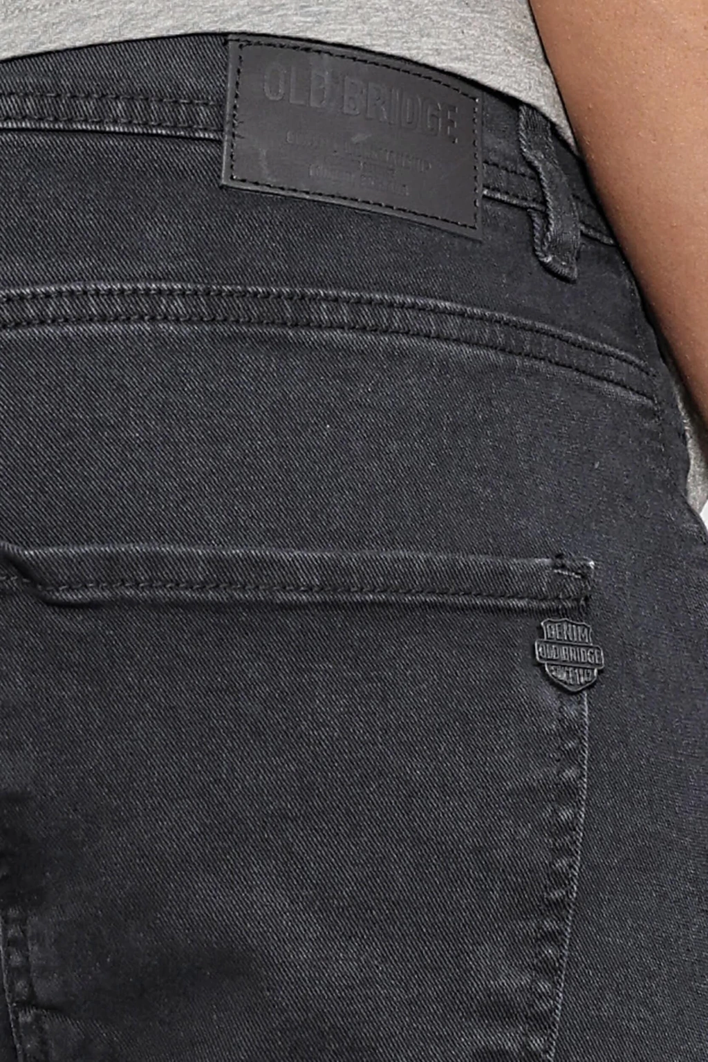 Bermuda denim de algodón y elastano de color negra con lavado desgastado, su cartera lleva botones. Las costuras son al tono, y tiene un calce slim. Se recomienda lavar del revés.