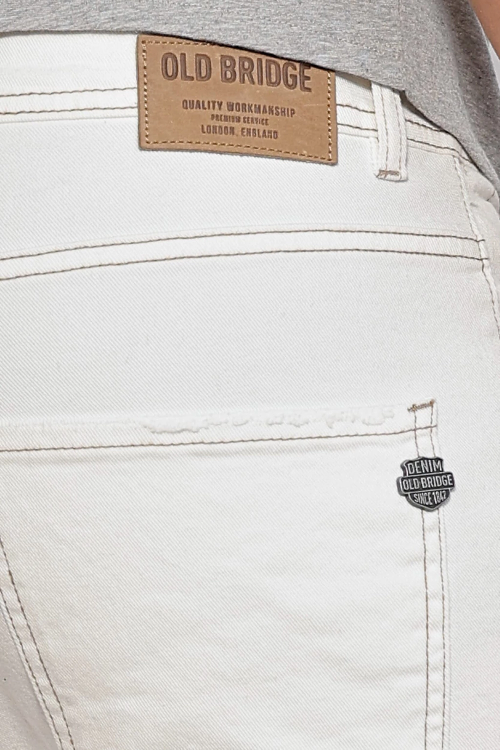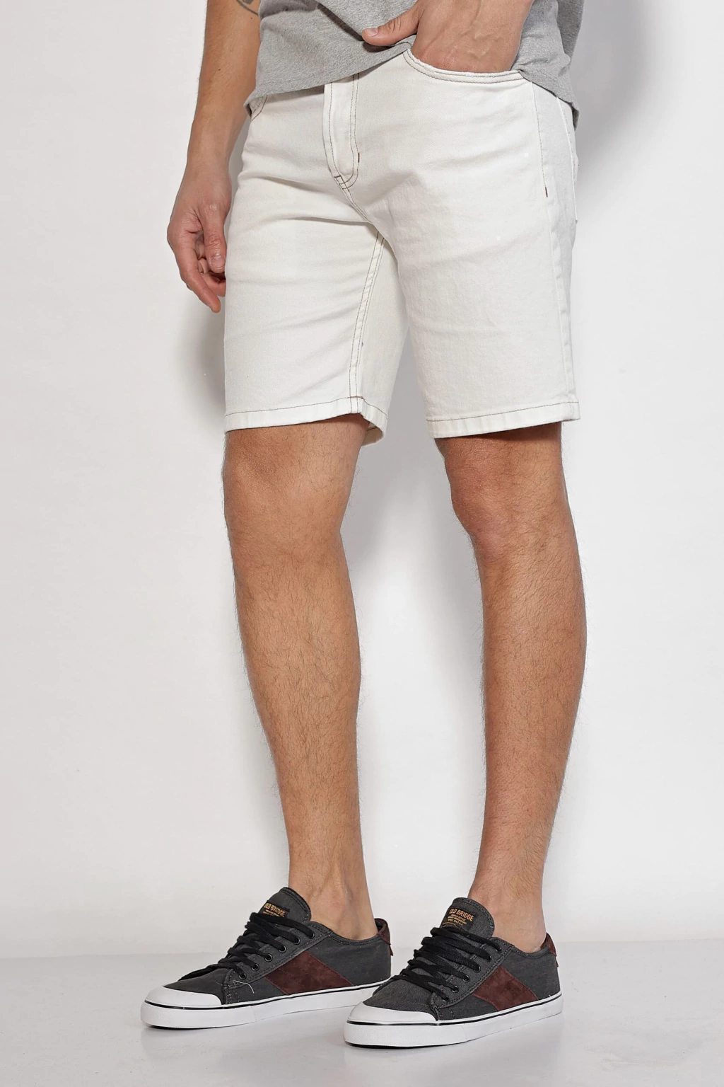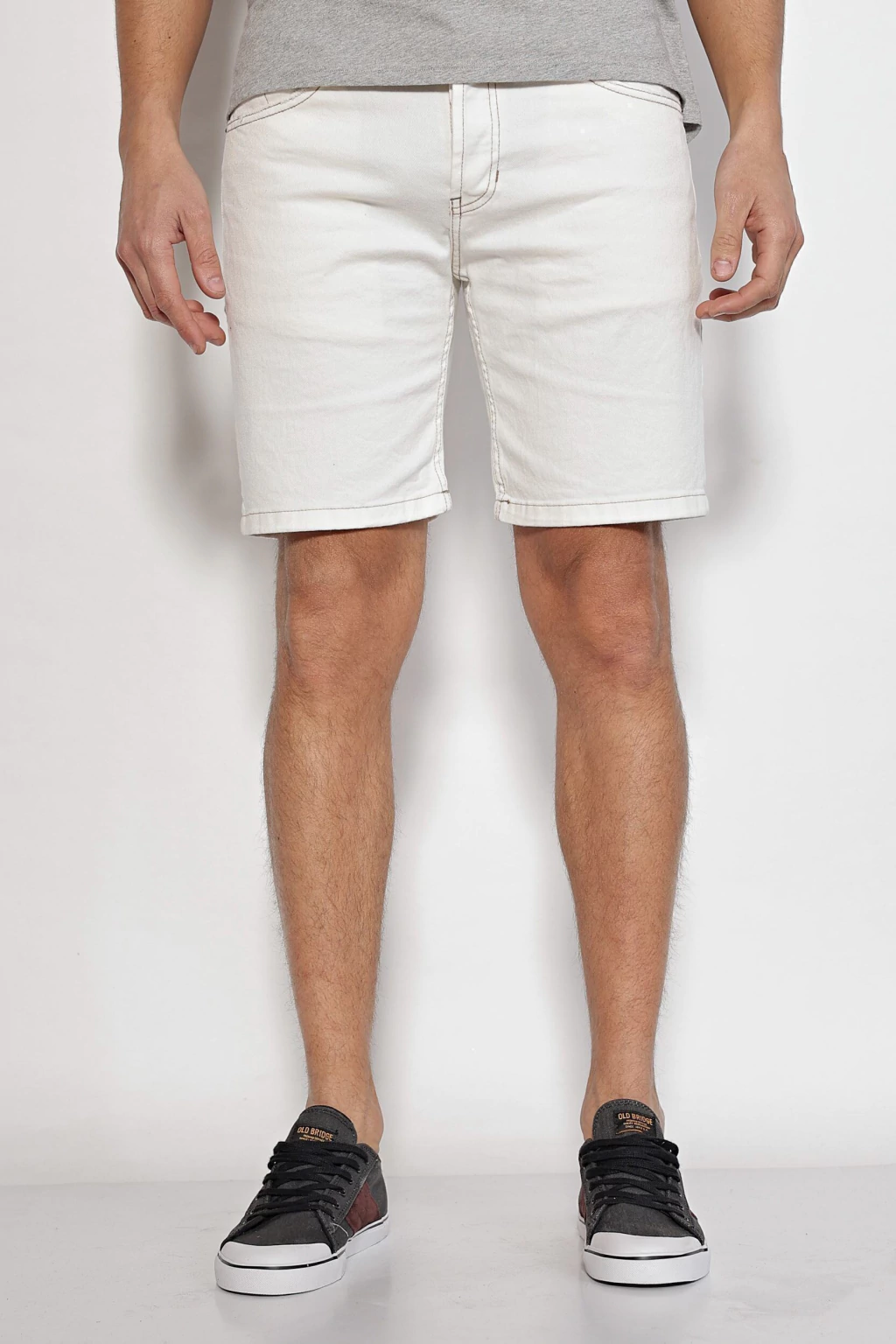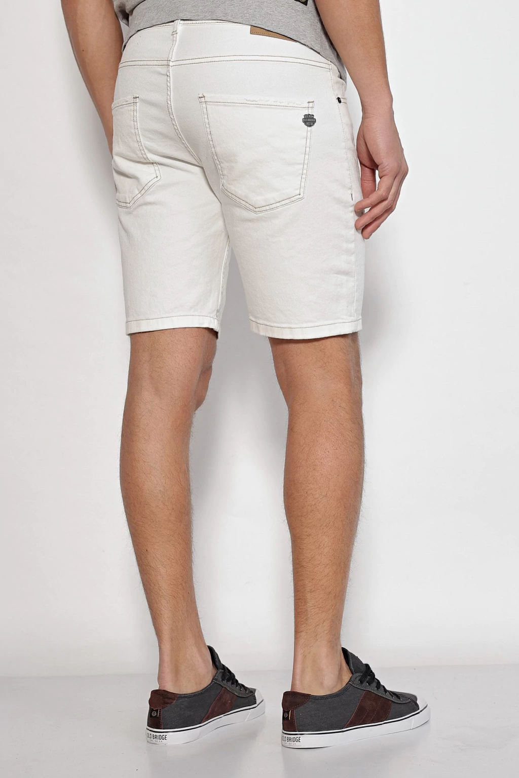 Bermuda de algodón con elastano en color crudo, de tiro alto, y calce regular fit. Su cartera lleva botones, sus costuras son de color tabaco, y tiene un lavado suavizado con desgaste en bocas de bolsillos.