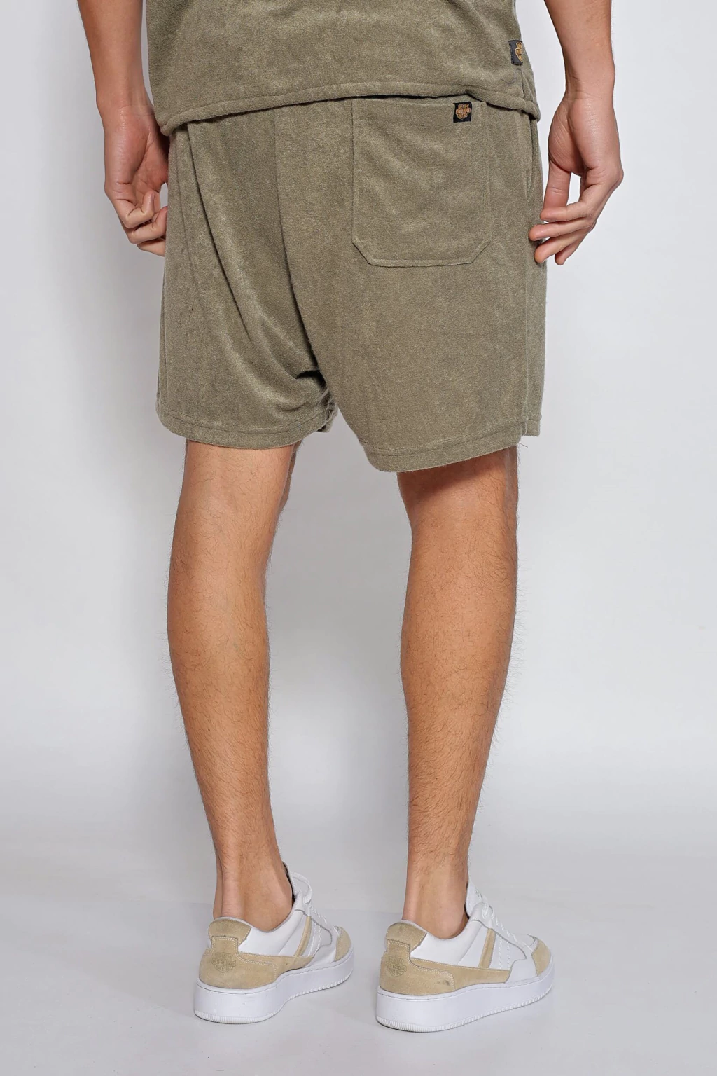Bermuda en tela towell, con cintura elastizada, y ajuste por cordón. Tiene bolsillos delanteros y un bolsillo plaqué trasero. Su calce es regular. Ideal para días de playa.