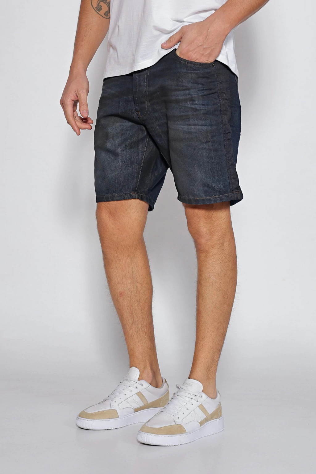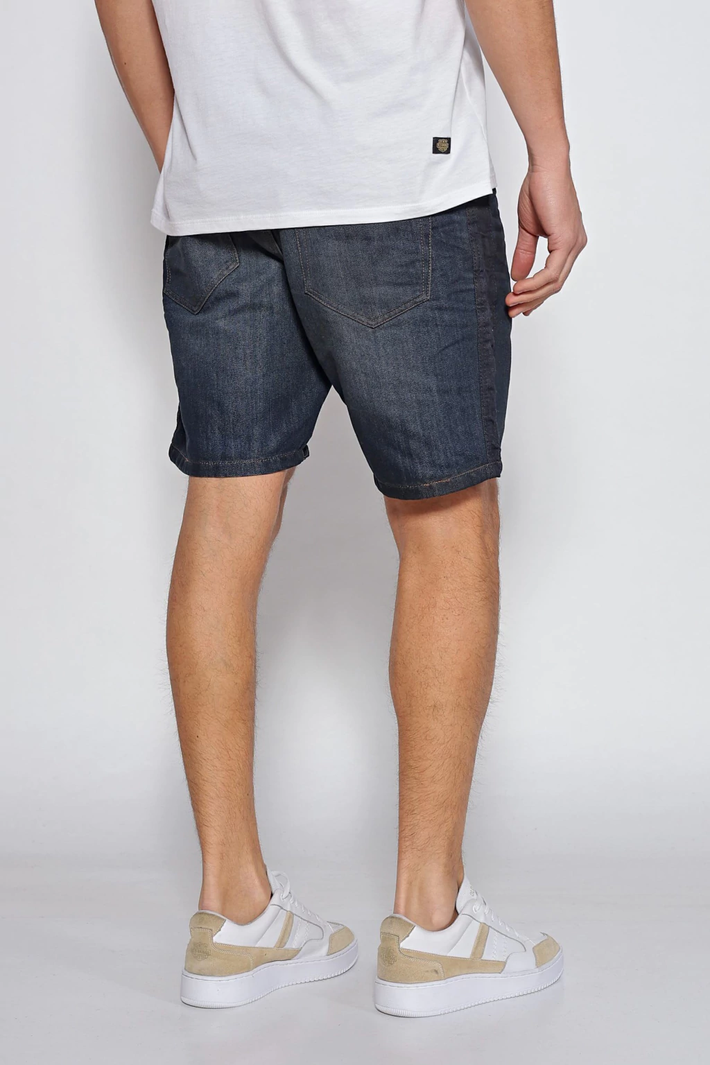 Bermuda en denim de algodón con elastano, de calce regular. La cartera lleva botones, y posee recortes laterales en tonalidad diferencial. Tiene un lavado localizado azul oscuro en piernas, se recomienda lavar del revés.