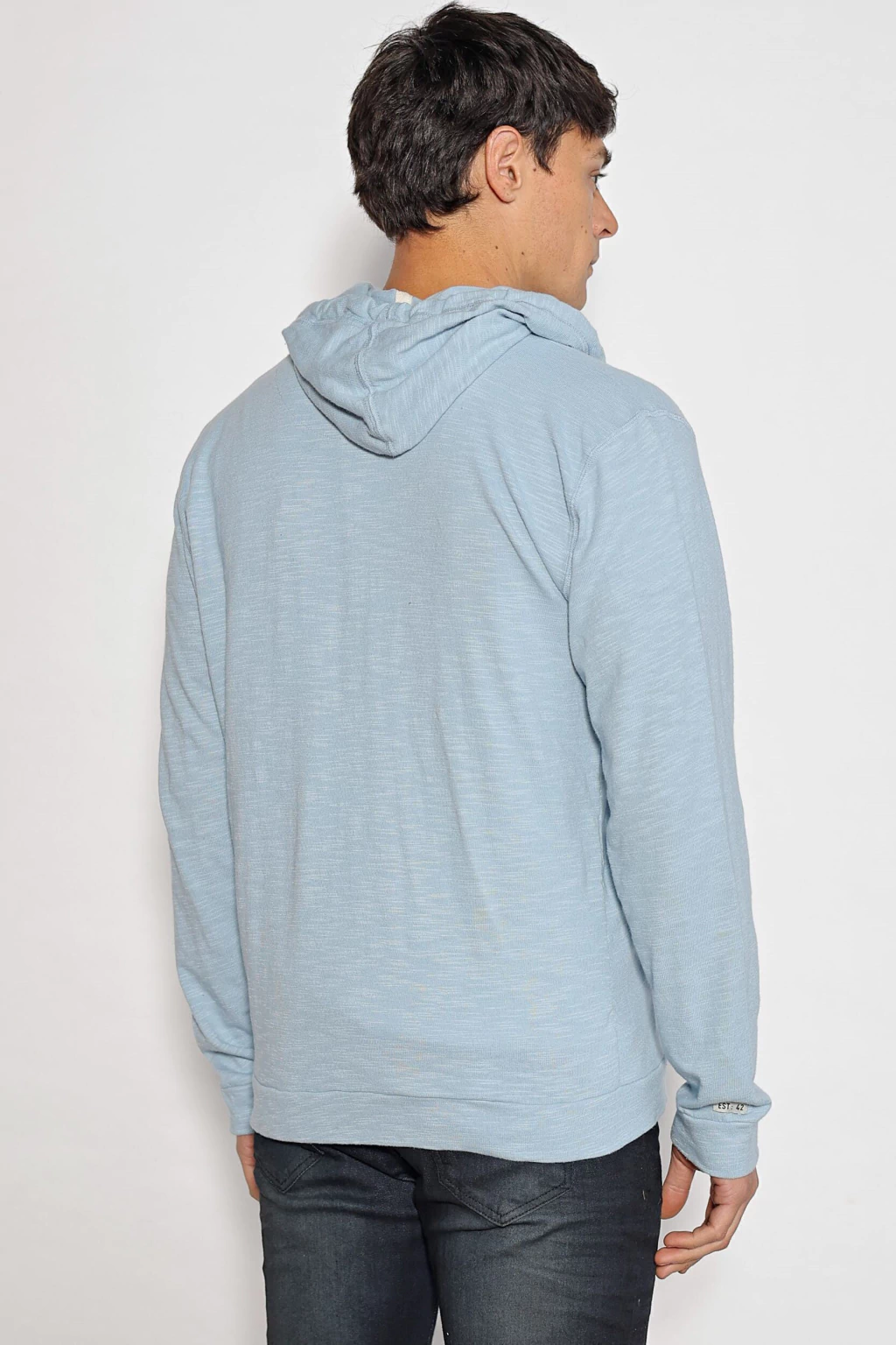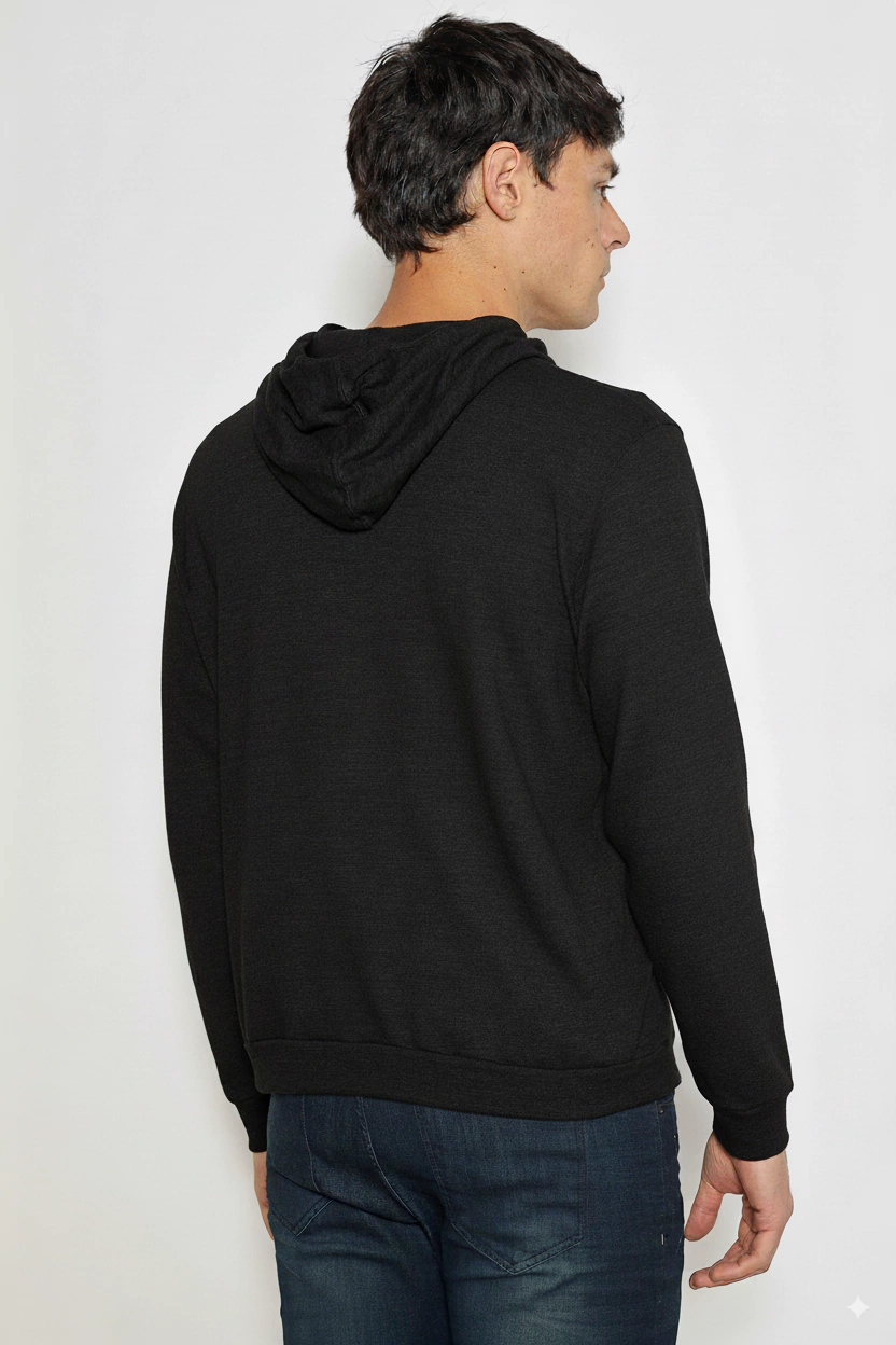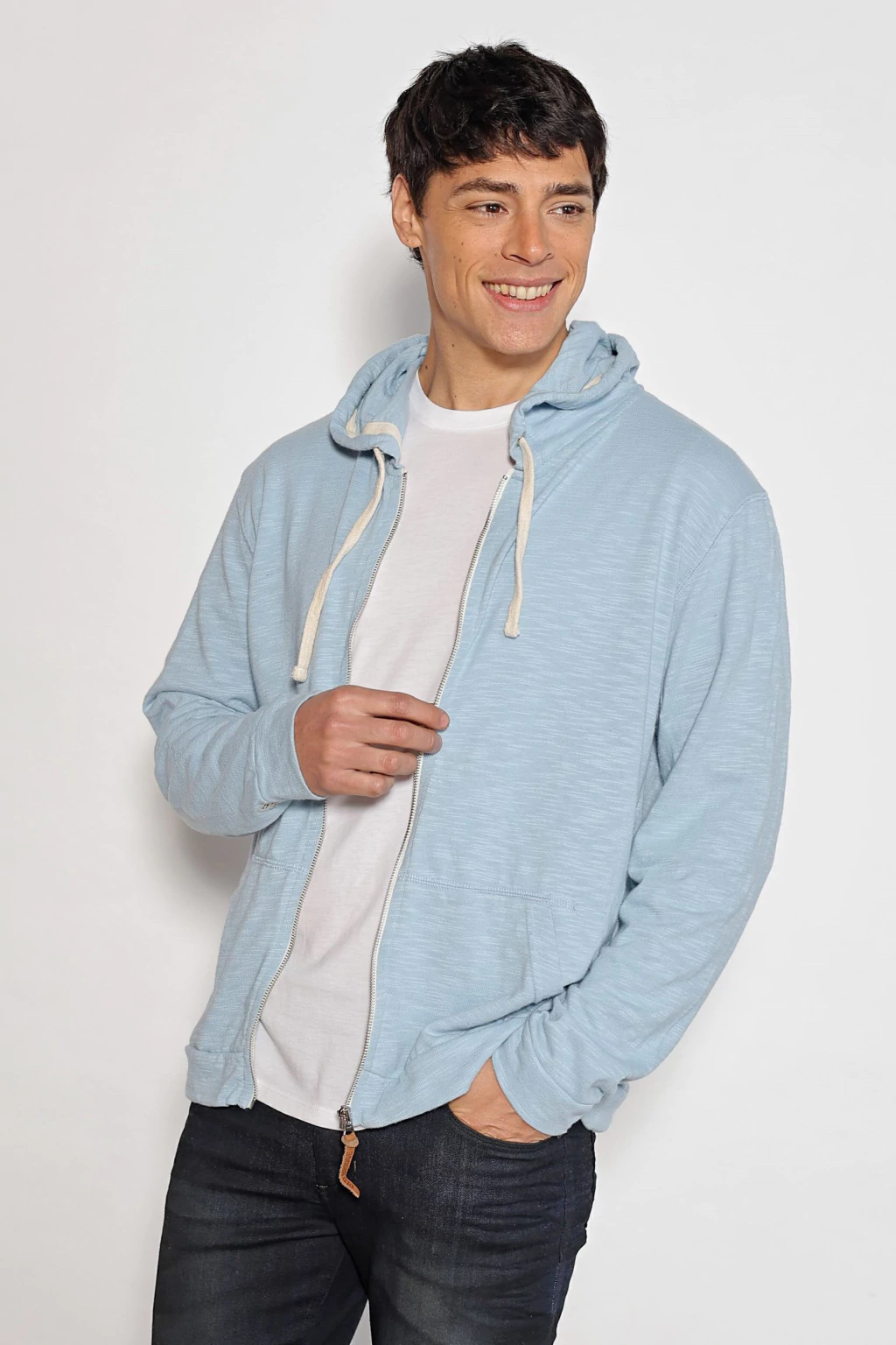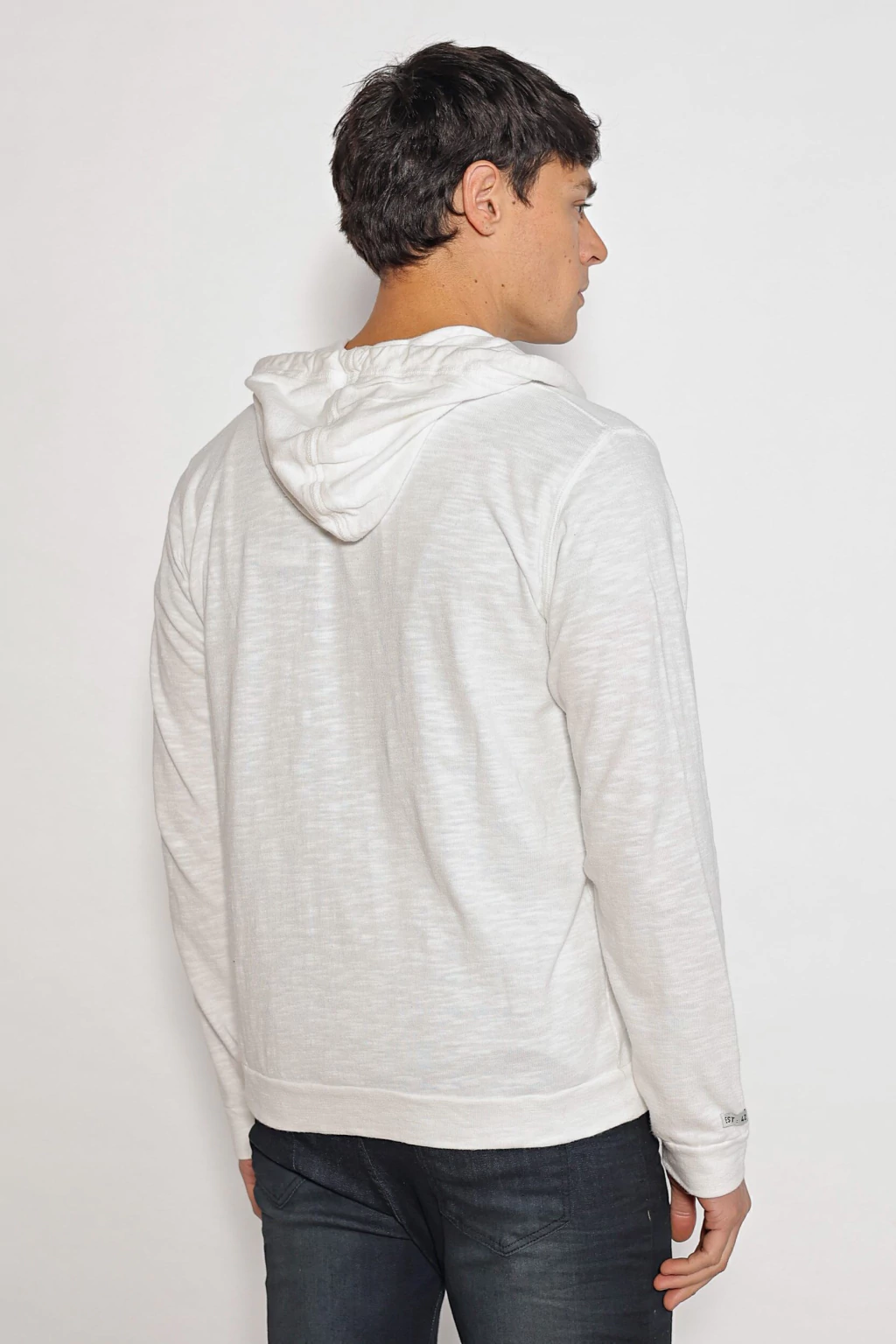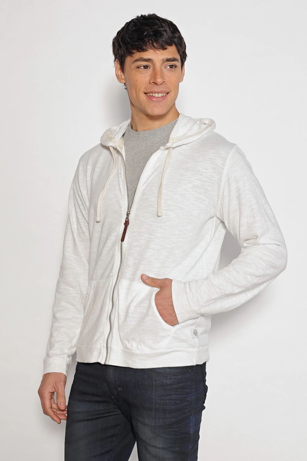 Campera con bolsillo canguro y capucha ajustable por cordón. Tiene detalles de bordador al tono, y su acceso es mediante cierre de metal YKK. Se encuentra confeccionada en jersey flame. Es una prenda cómoda y fresca, de calce regular.