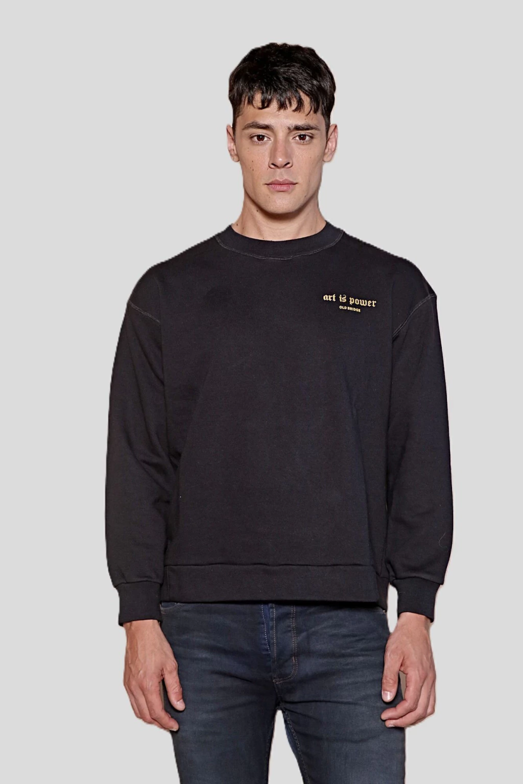 Buzo oversize escote redondo, con puños y cuello altos, y detalle con bordador al tono. Lleva una estampa logo en el frente y una estampa central en la espalda con tacto. Confeccionado en rustico de algodón. Calce holgado.