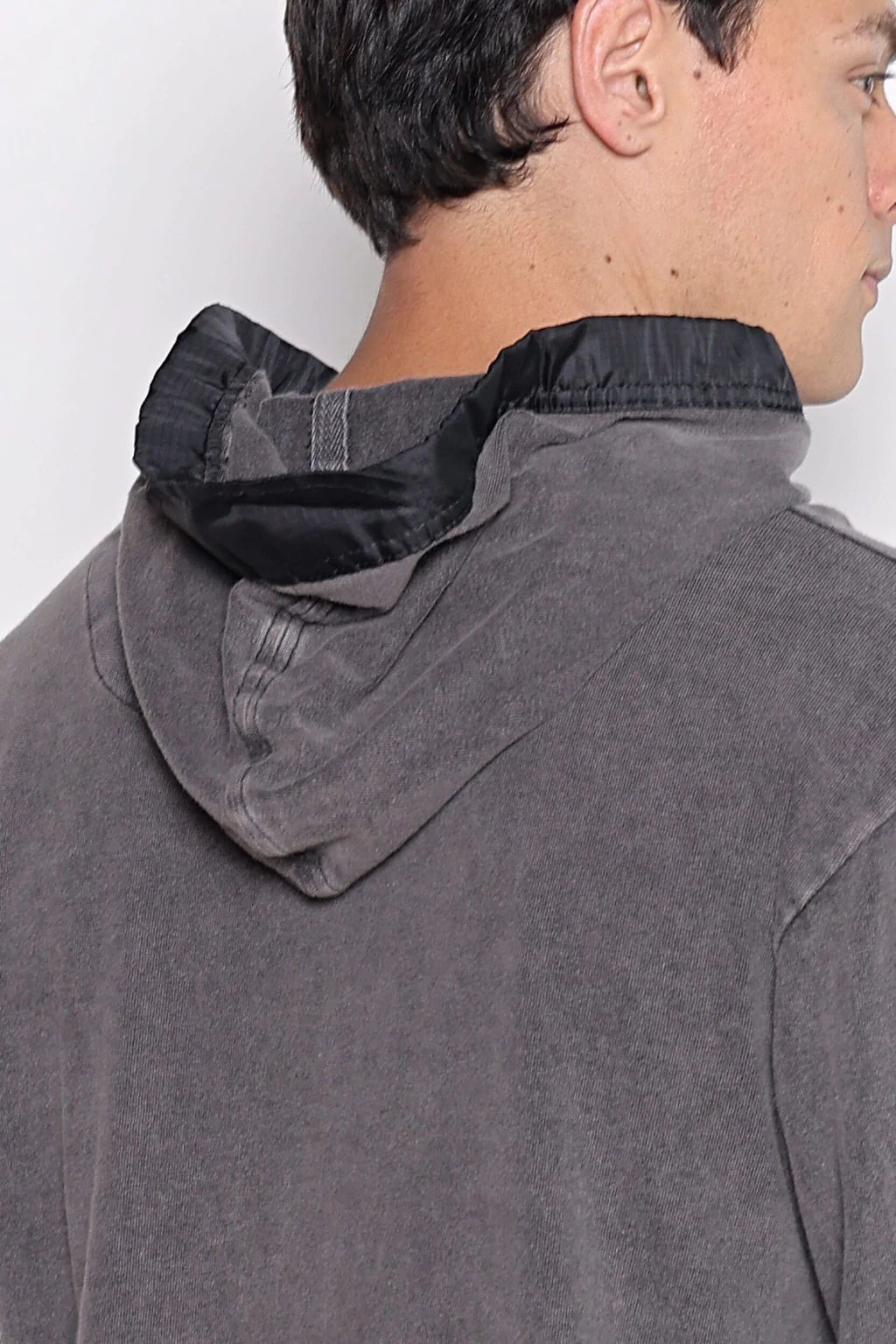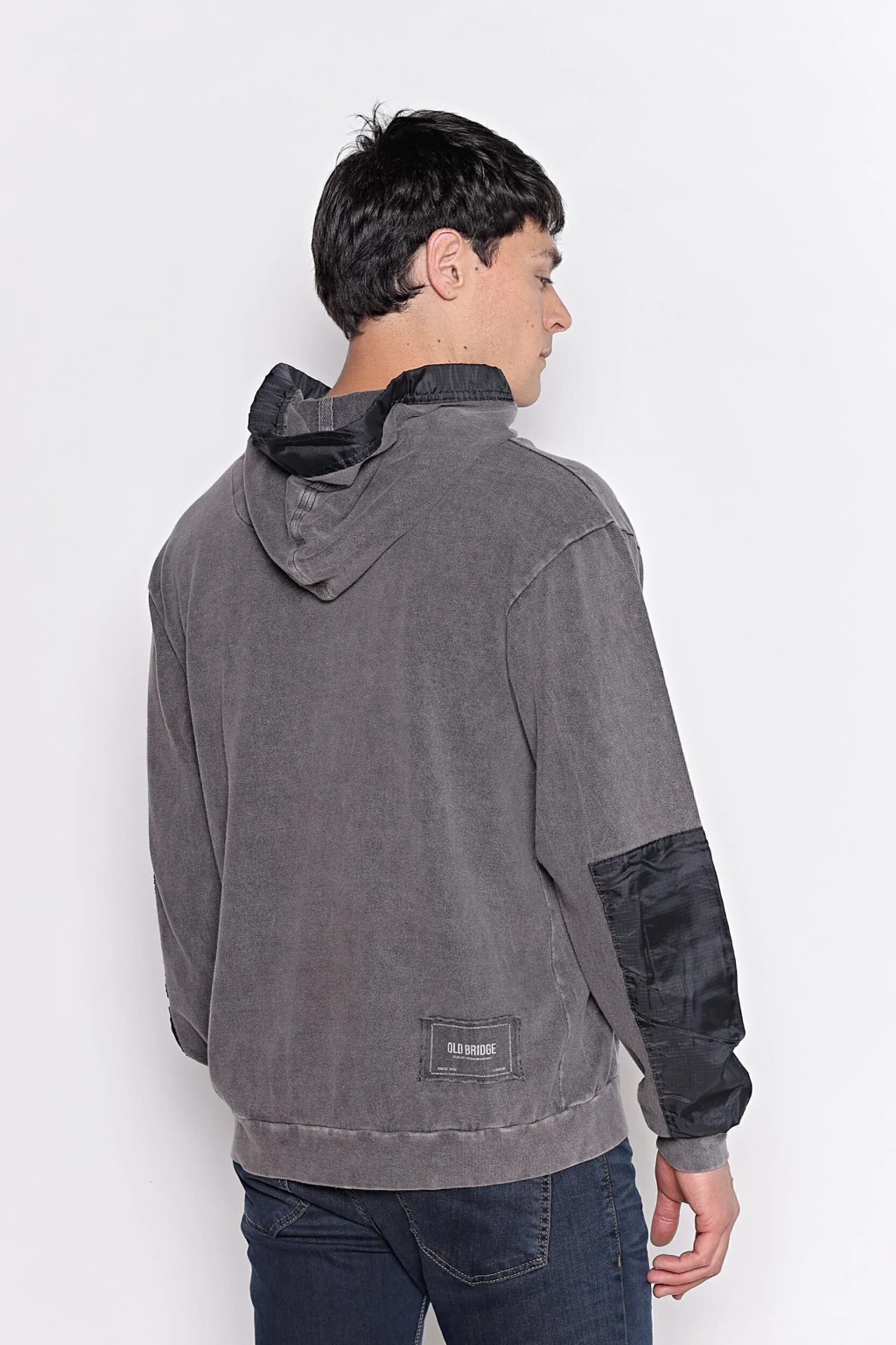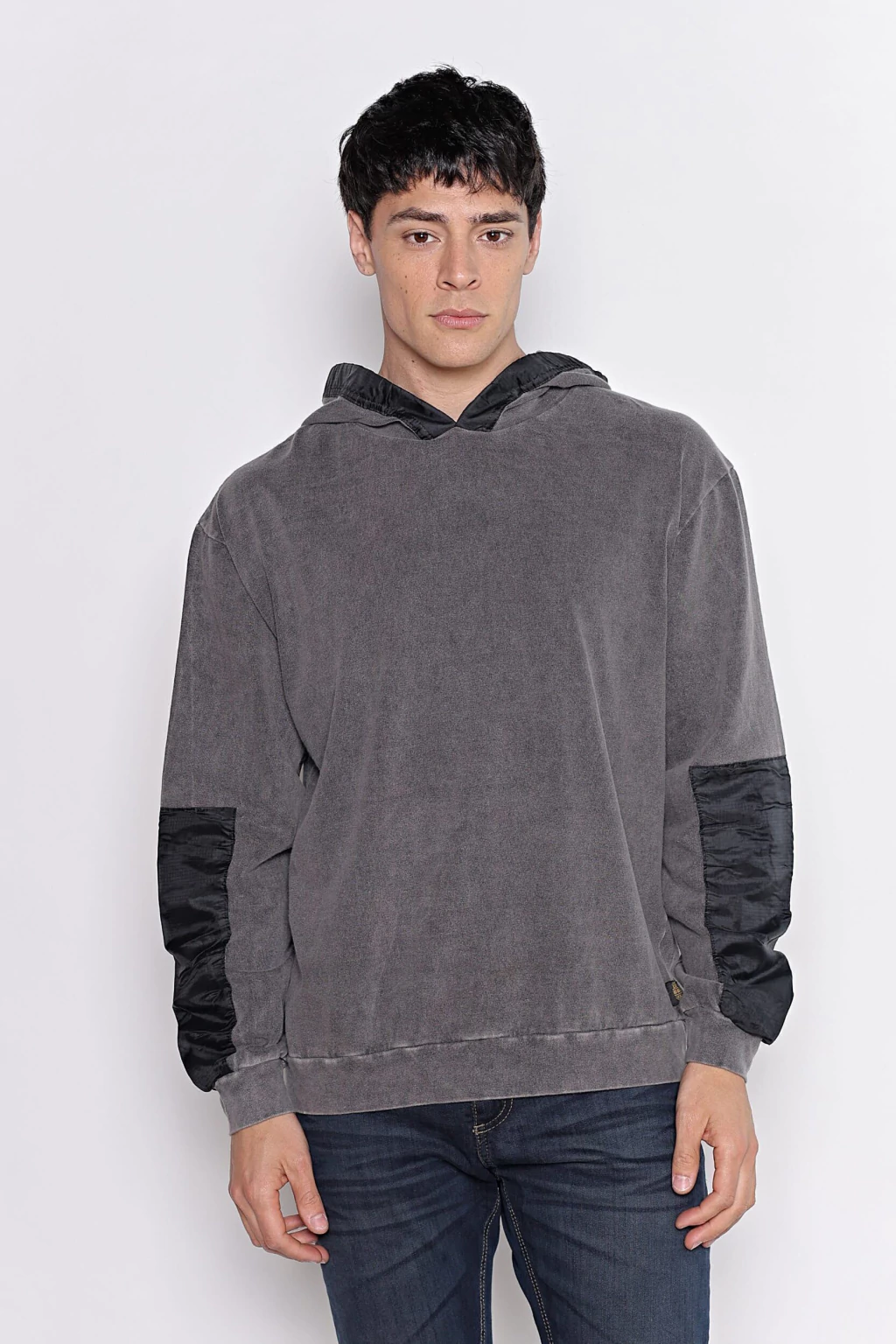 Buzo con capucha, que lleva detalles de tela en combinación de ripstop en ruedo de capucha y coderas. Se encuentra confeccionado en jersey pesado de puro algodón, y cuenta con un lavado que le otorga un aspecto gastado. Es una prenda liviana de calce regular.