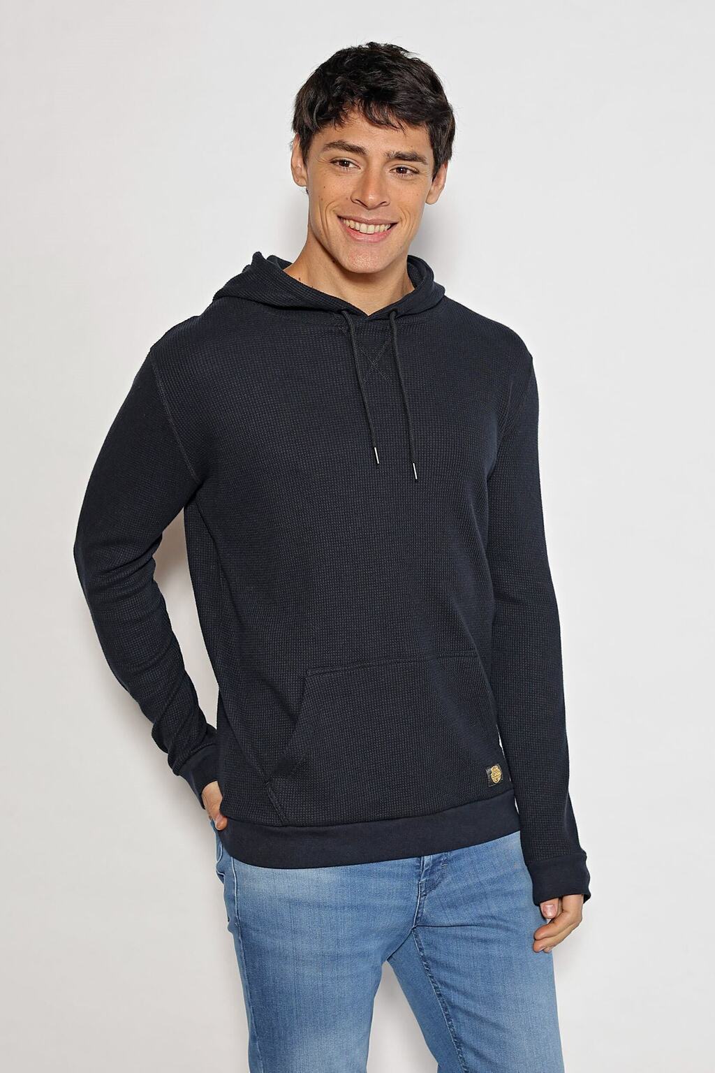 Buzo con bolsillo canguro y capucha ajustable por cordón. Los detalles de bordador son al tono, y esta confeccionado en waffle de puro algodón.