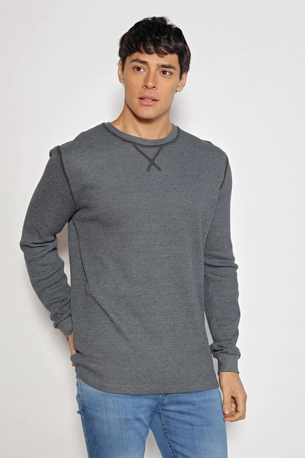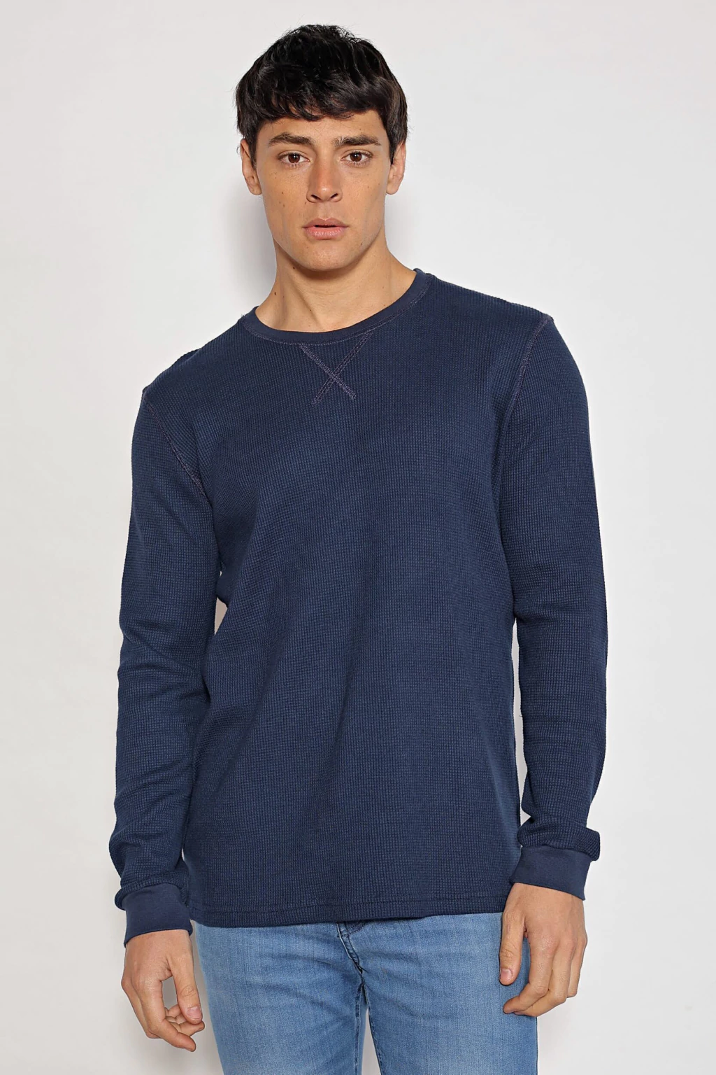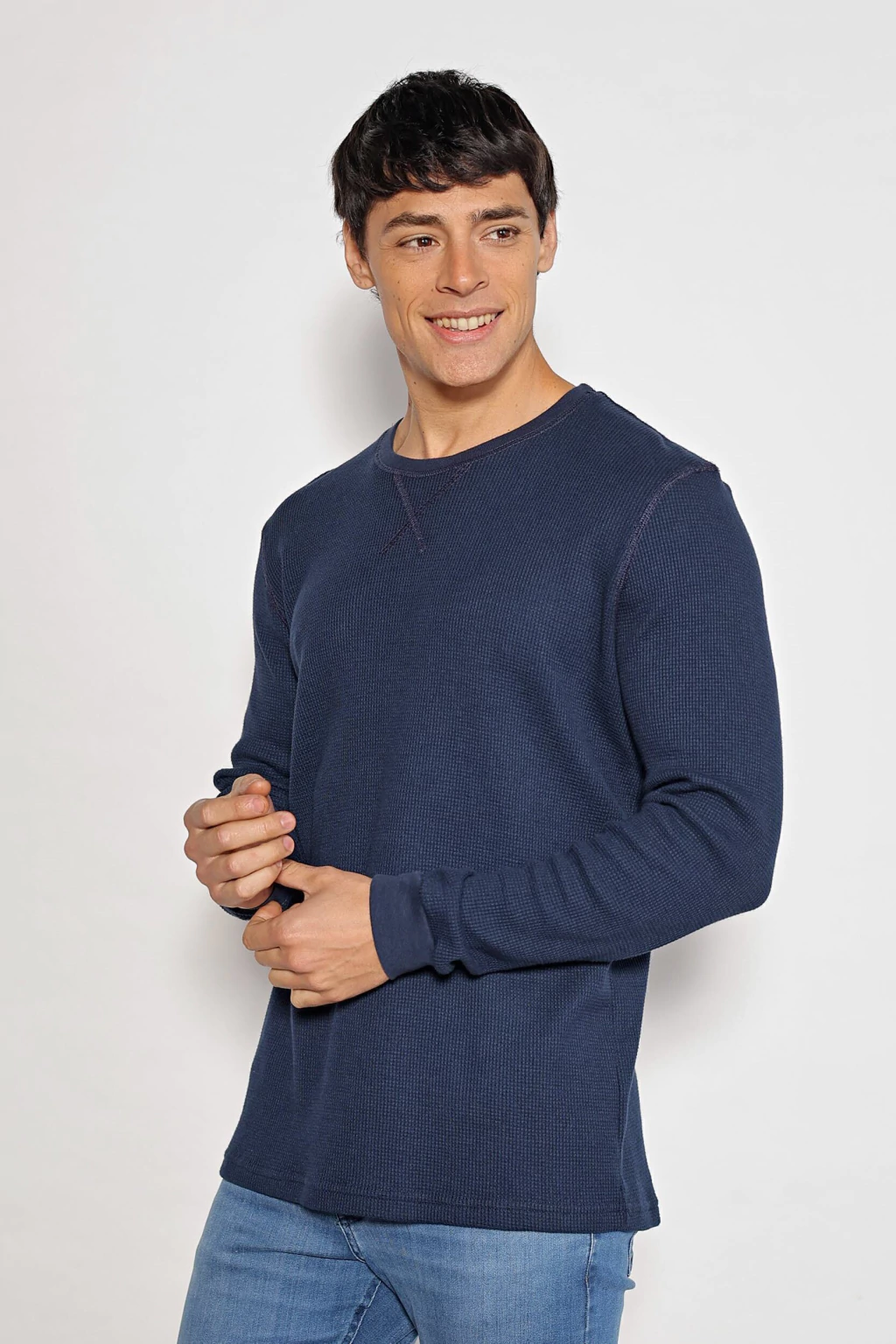 Buzo escote redondo con detalles de bordador al tono. Confeccionado en wafle puro algodón.