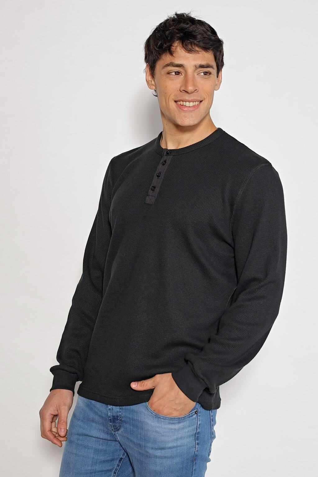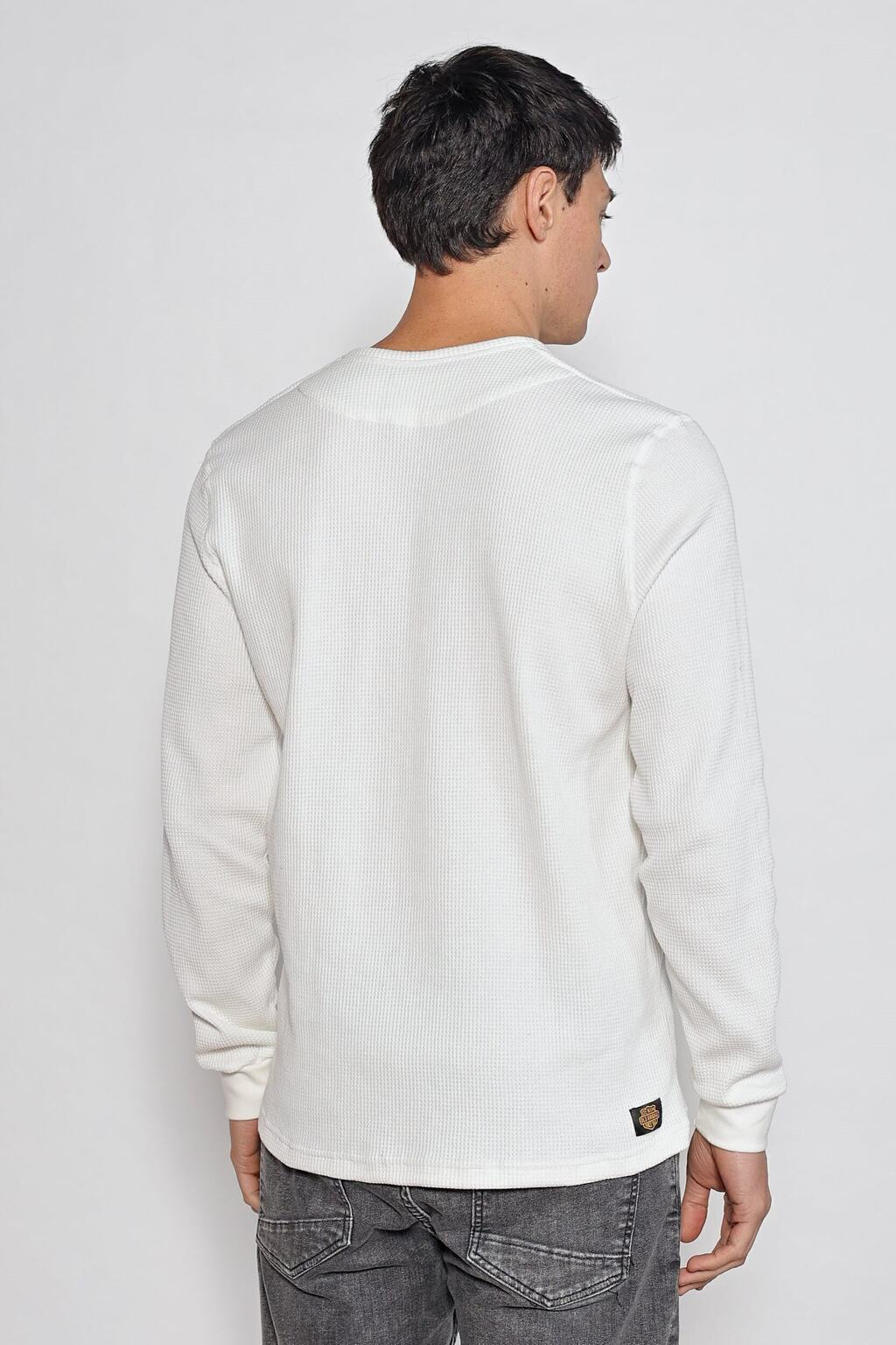 “Confeccionado en waffle de algodón, este buzo combina textura, comodidad y un diseño sutilmente diferencial. Perfecto para un look urbano y relajado”.