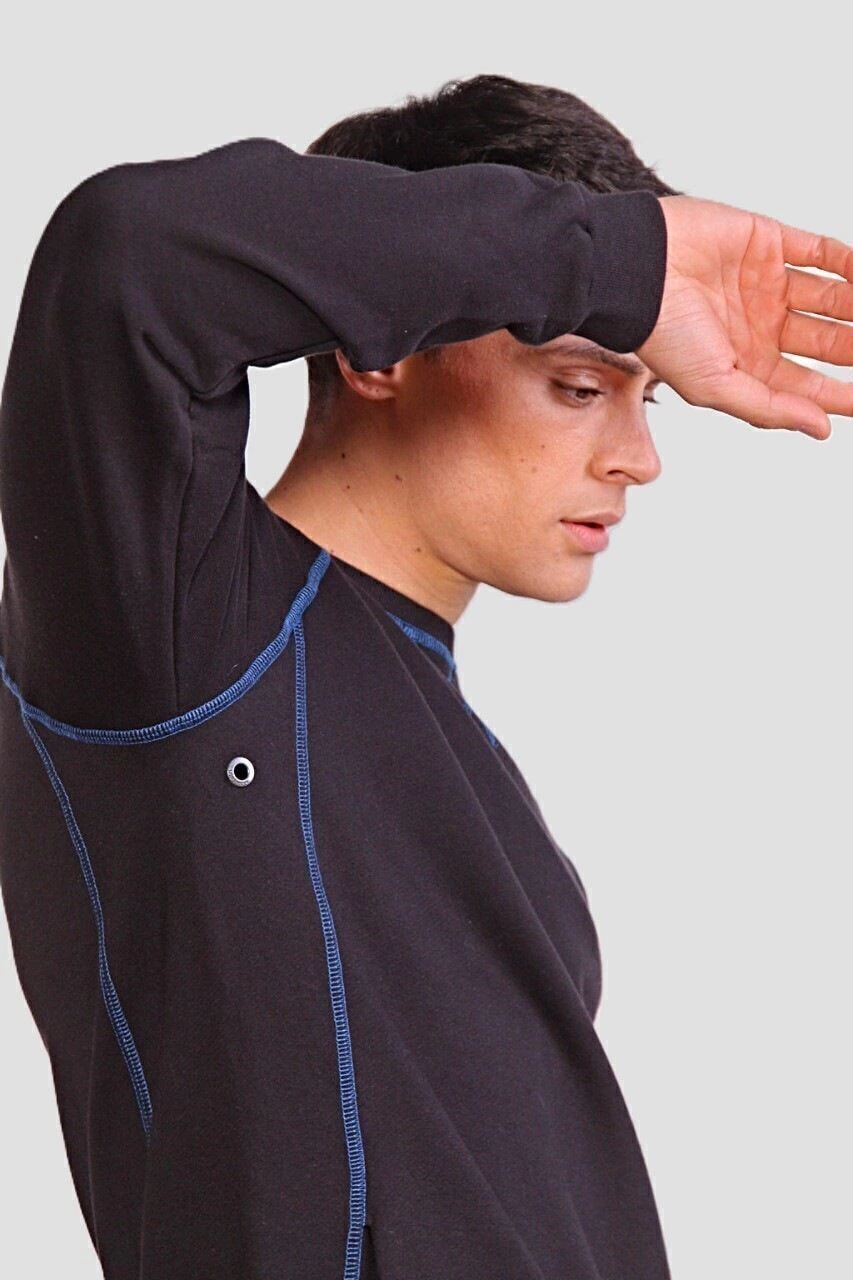 Buzo escote redondo, de manga ranglan, con detalles de bordador a contratono y ojalillos debajo de sisa. Cuenta con bolsillos ojales y estampa en el costado derecho sin tacto. Se encuentra confeccionado en rústico de algodón. Su calce es regular.