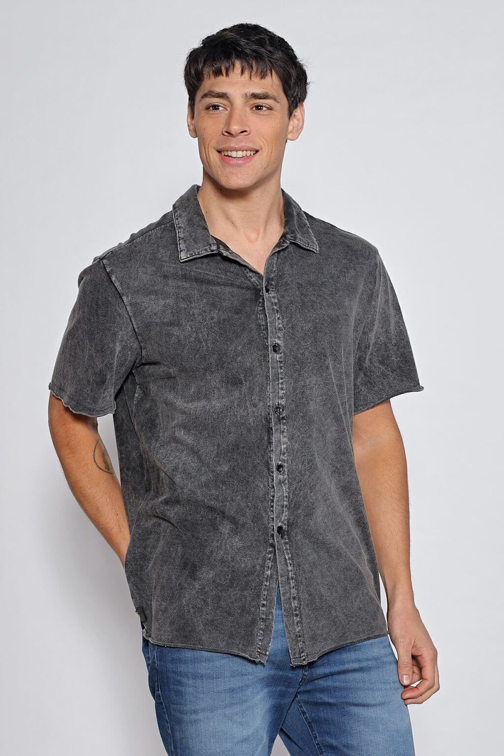 Camisa en jersey de algodón, de manga corta, con ruedos de puños y cintura al corte. Tiene cartera con botones, y posee un proceso de teñido artesanal que genera un efecto visual veteado e irregular. Es una prenda de calce holgado.