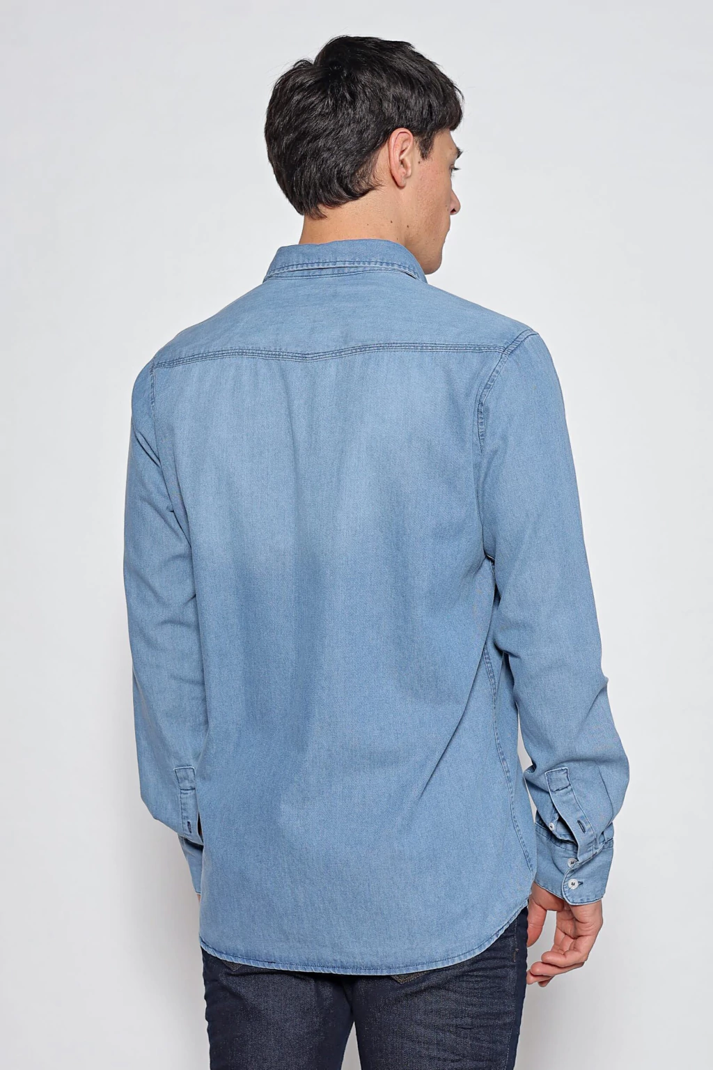 Camisa de denim liviano en tono celeste, confeccionada en puro algodón. De mangas largas y calce regular, presenta canesú delantero con detalles en costuras. Incorpora cartera con botones y bolsillos plaqué con tapa. Tiene un lavado con localizado suave en delantero y espalda.