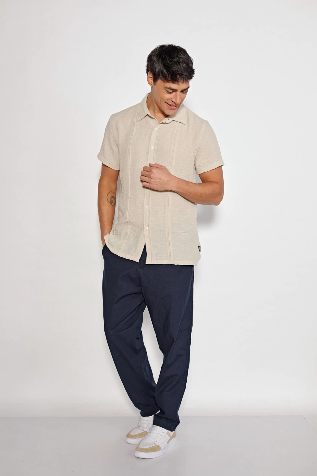“Una camisa liviana y holgada, perfecta para los días cálidos. Su diseño símil lino con alforzas aporta un estilo moderno y relajado”.