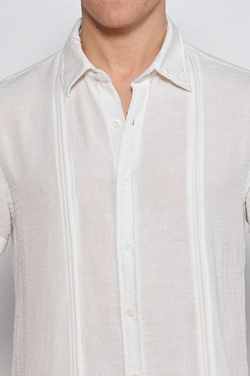 Camisa símil lino de manga corta, con detalle de alforzas en delantero. Tiene cartera con botone y su calce es regular. Es una prenda holgada para proporcionar frescura y comodidad.