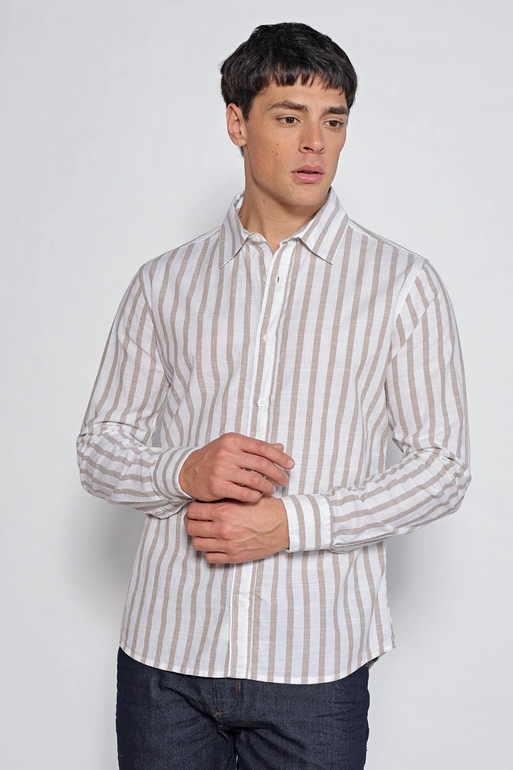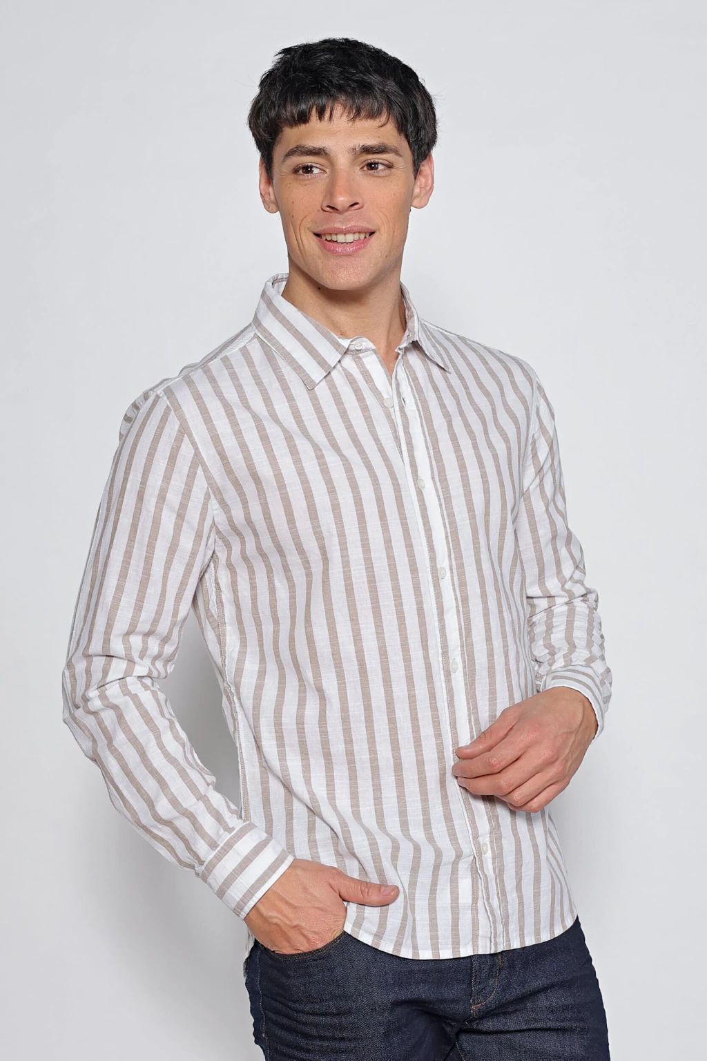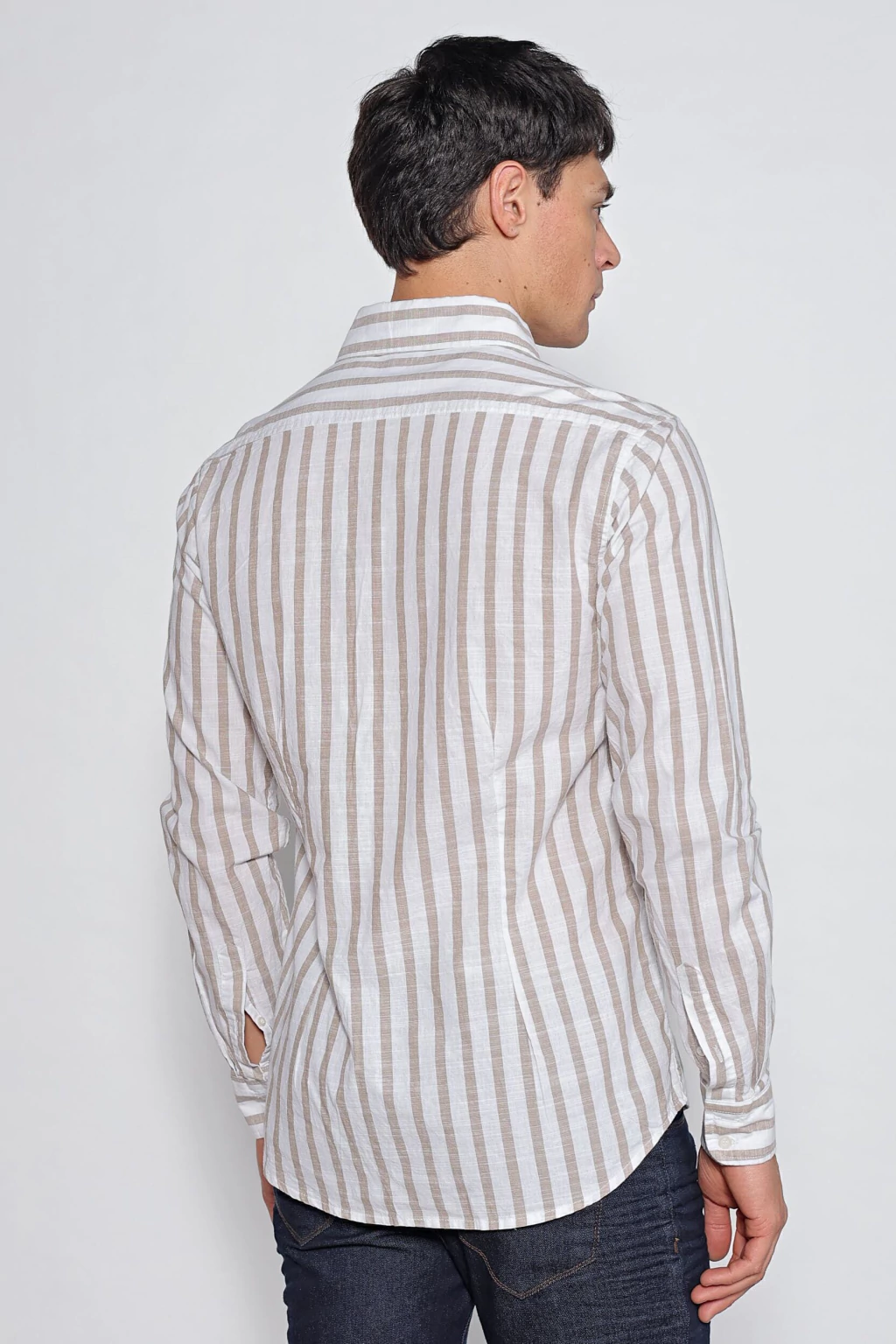 Camisa de lino rayada, de manga larga y cartera con botones. De calce regular, ofrece una sensación de frescura y comodidad.