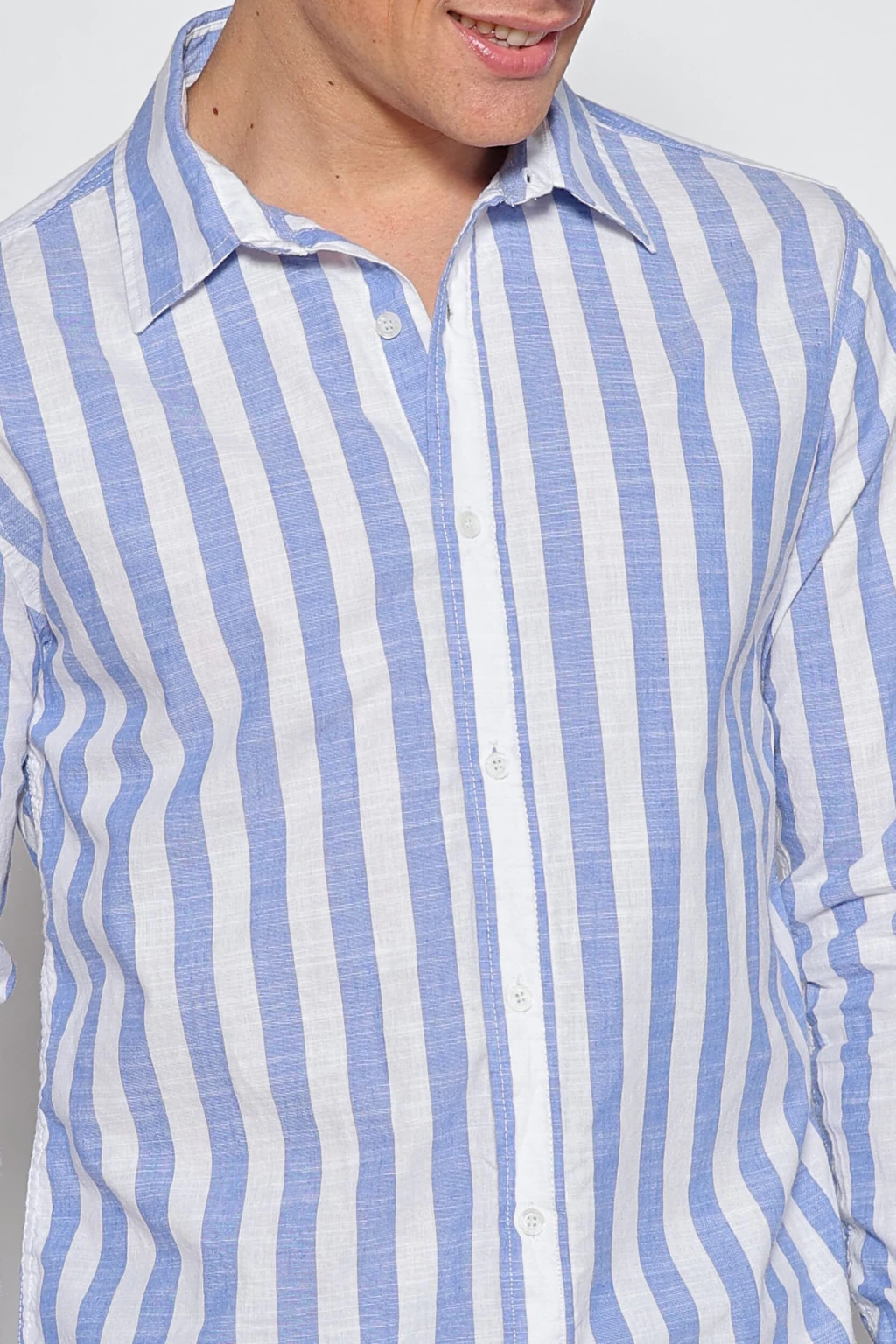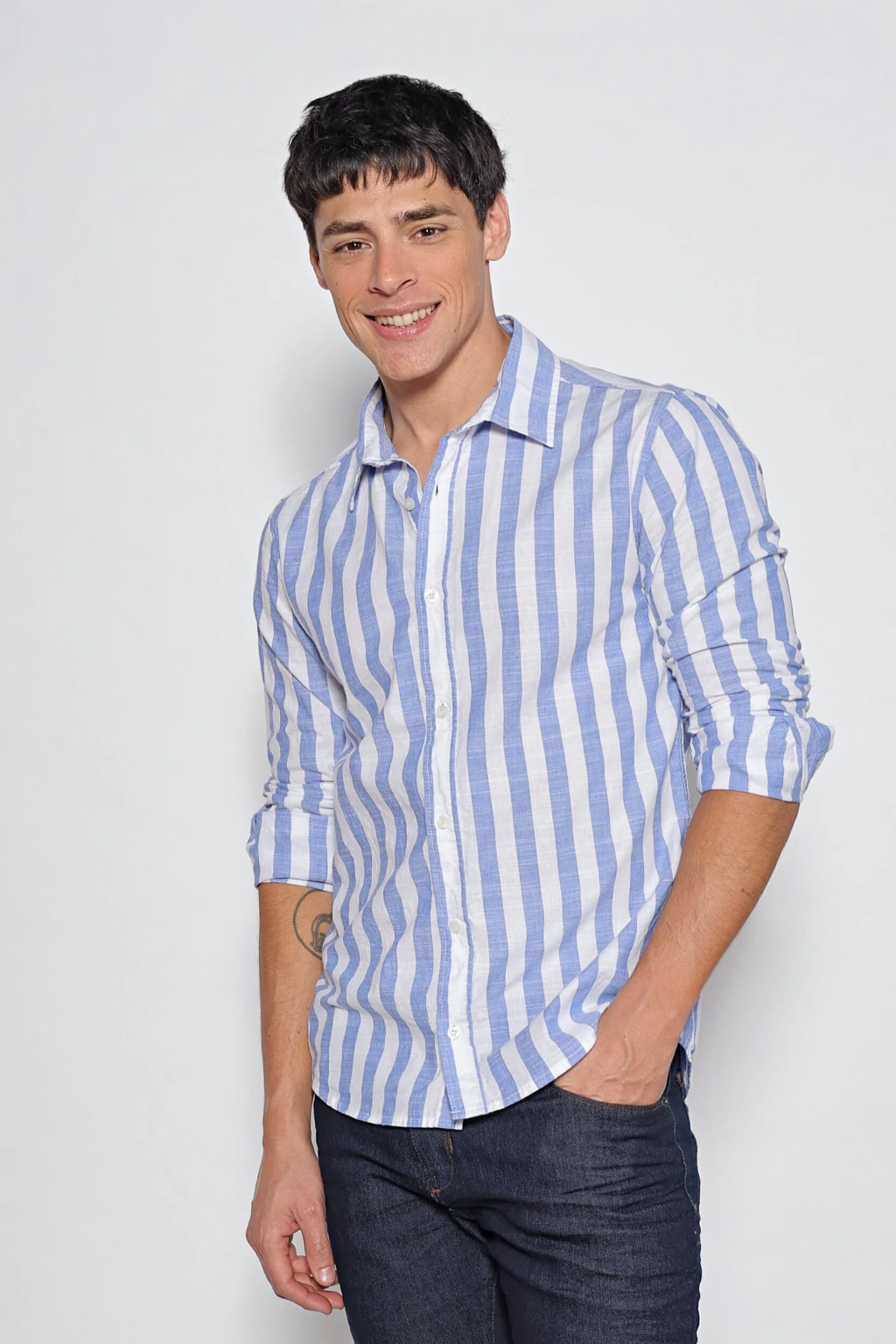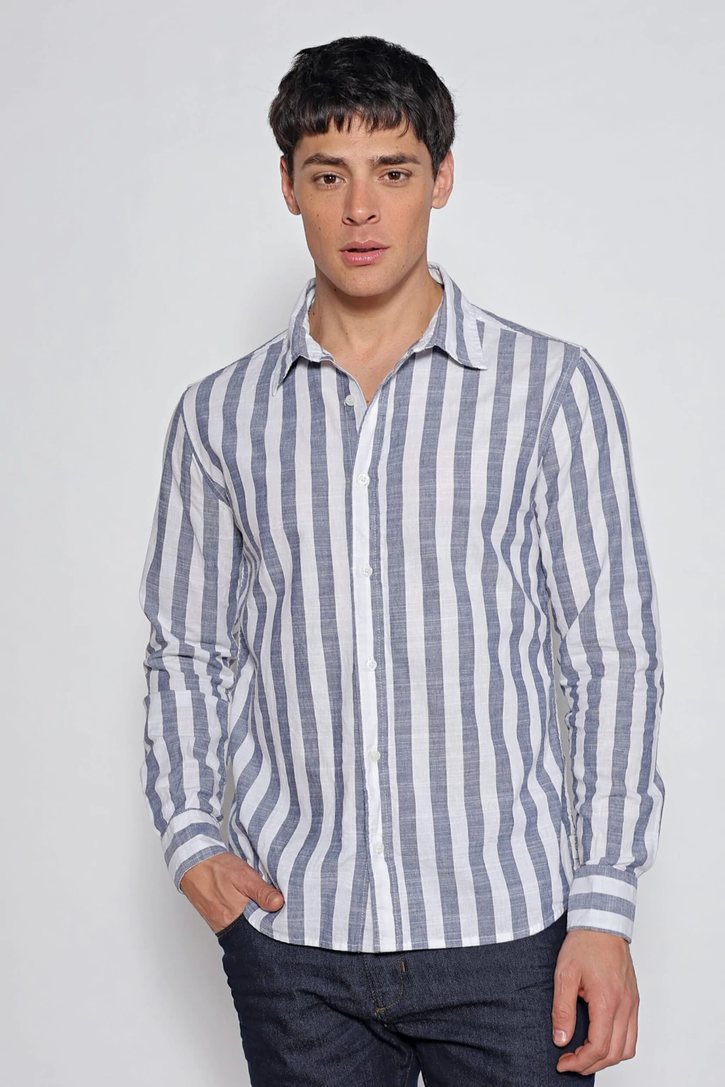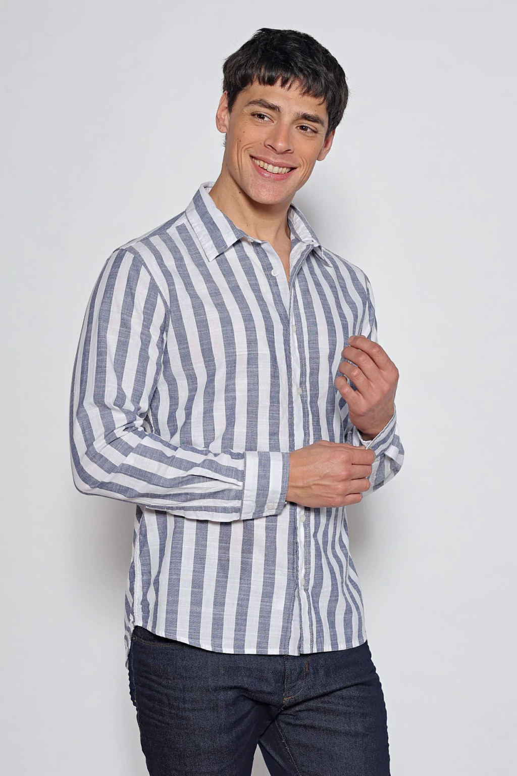 Camisa de lino rayada, de manga larga y cartera con botones. De calce regular, ofrece una sensación de frescura y comodidad.