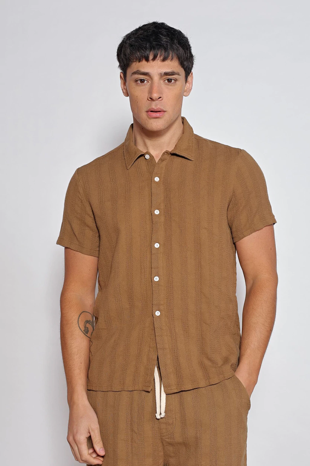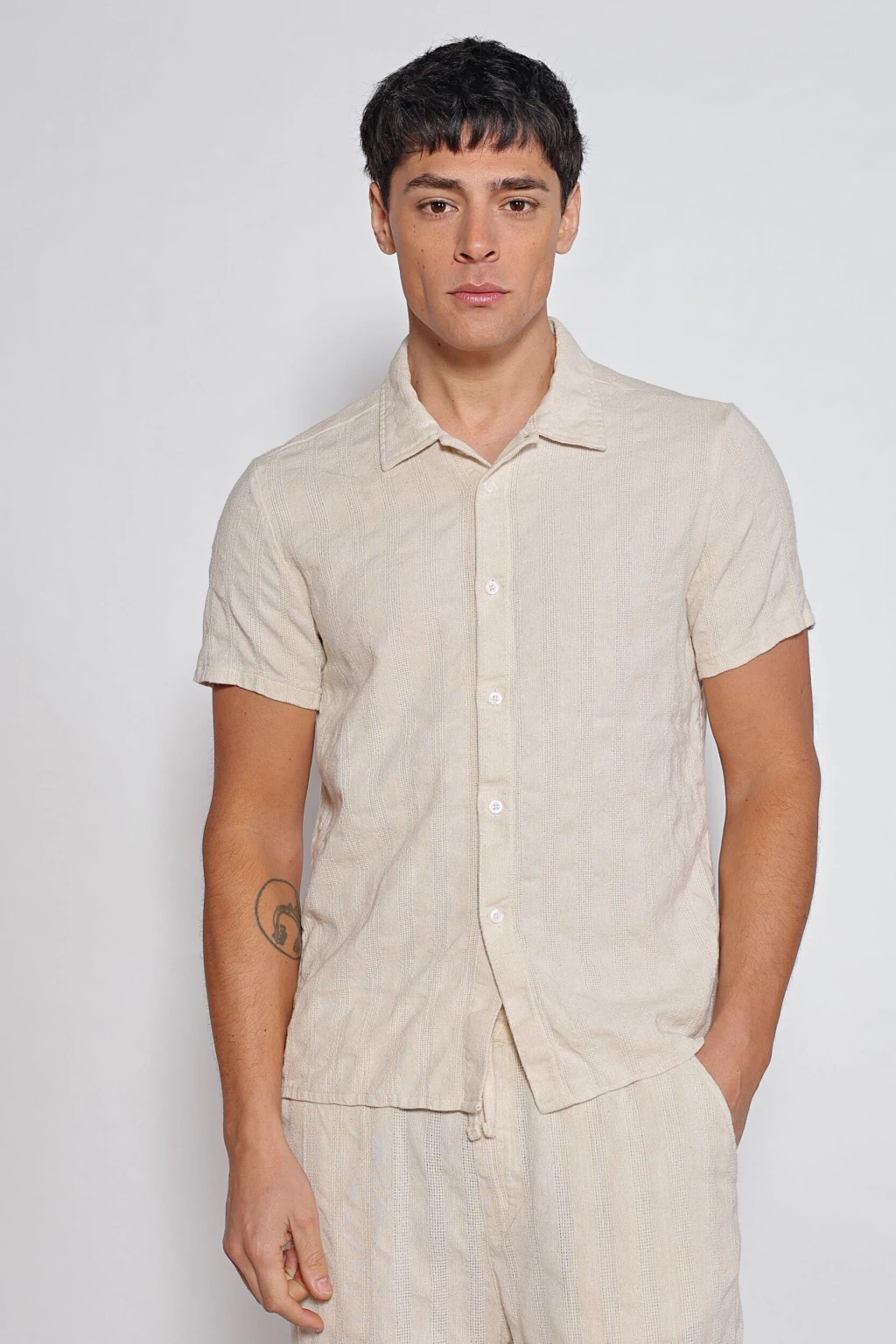 Camisa de ratier de algodón, en manga corta, y calce holgado. Tiene cartera con botones. Prenda fresca y cómoda.