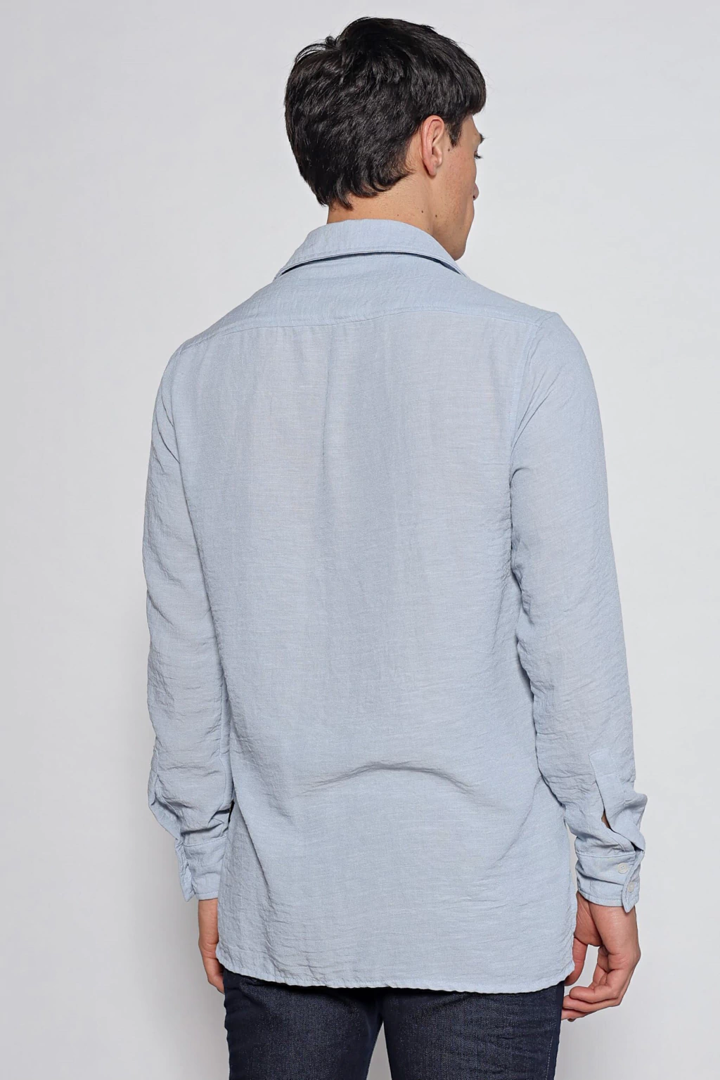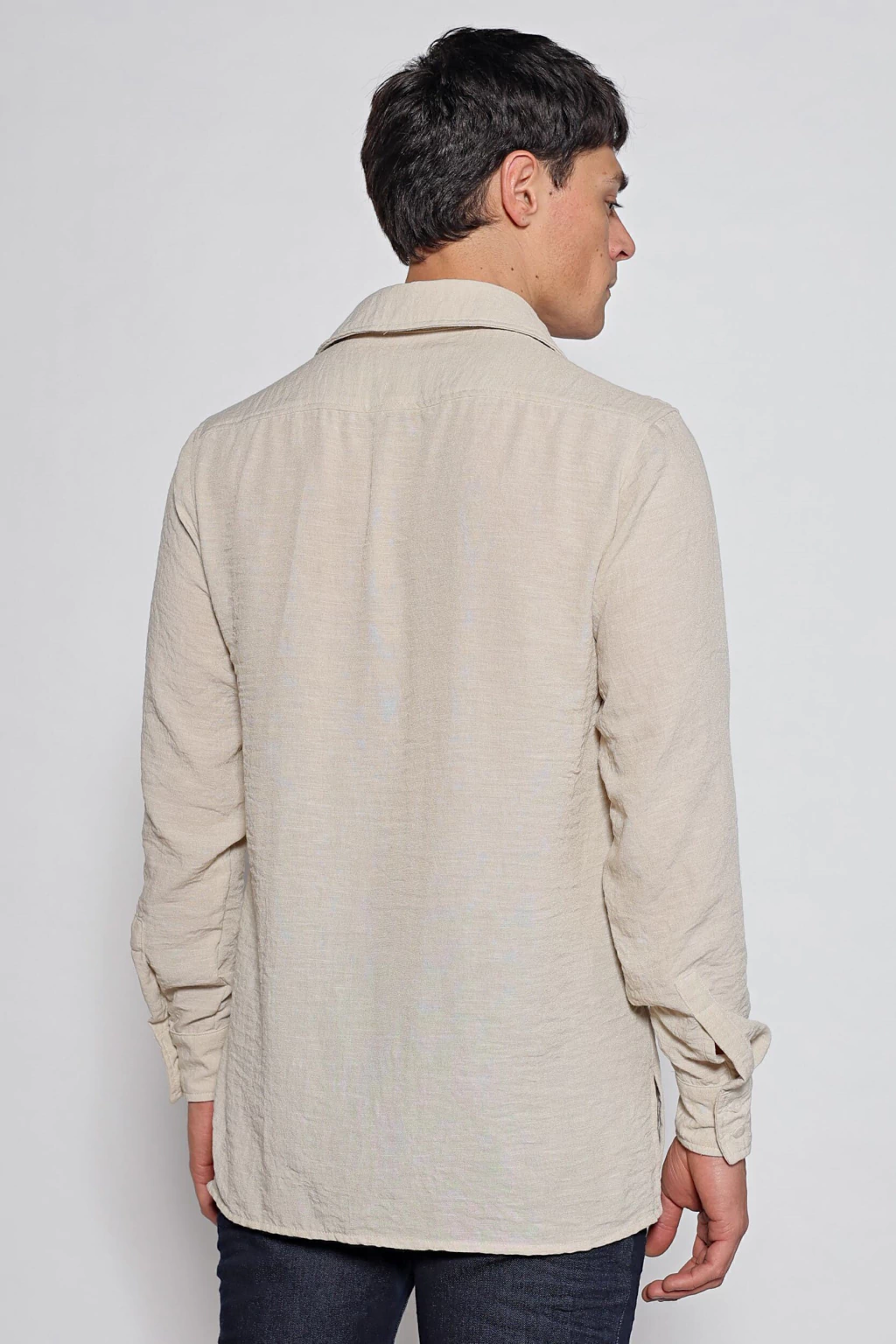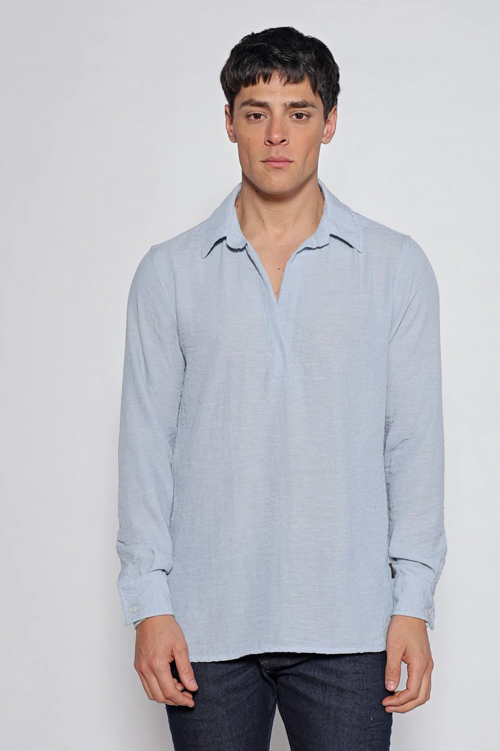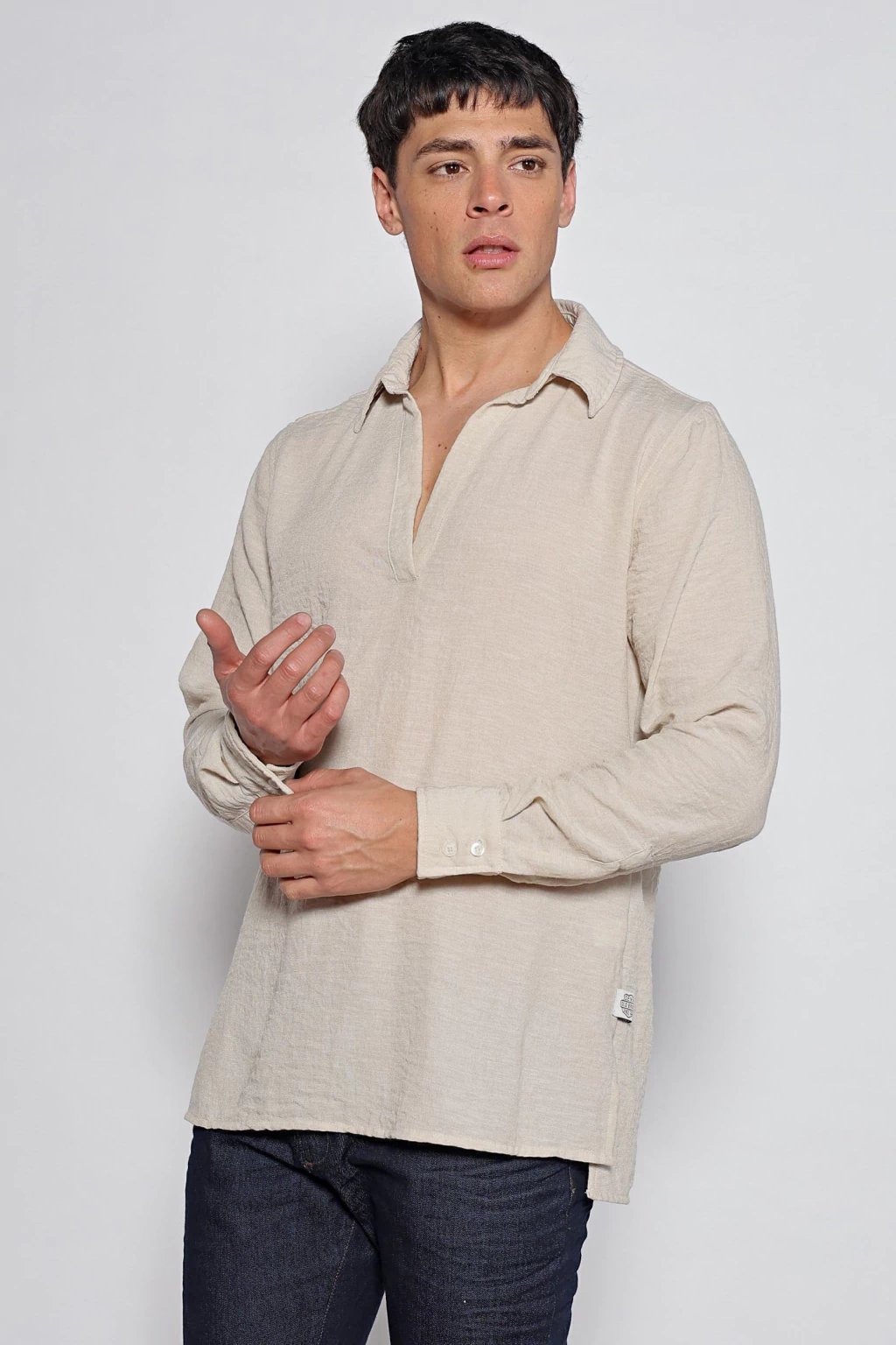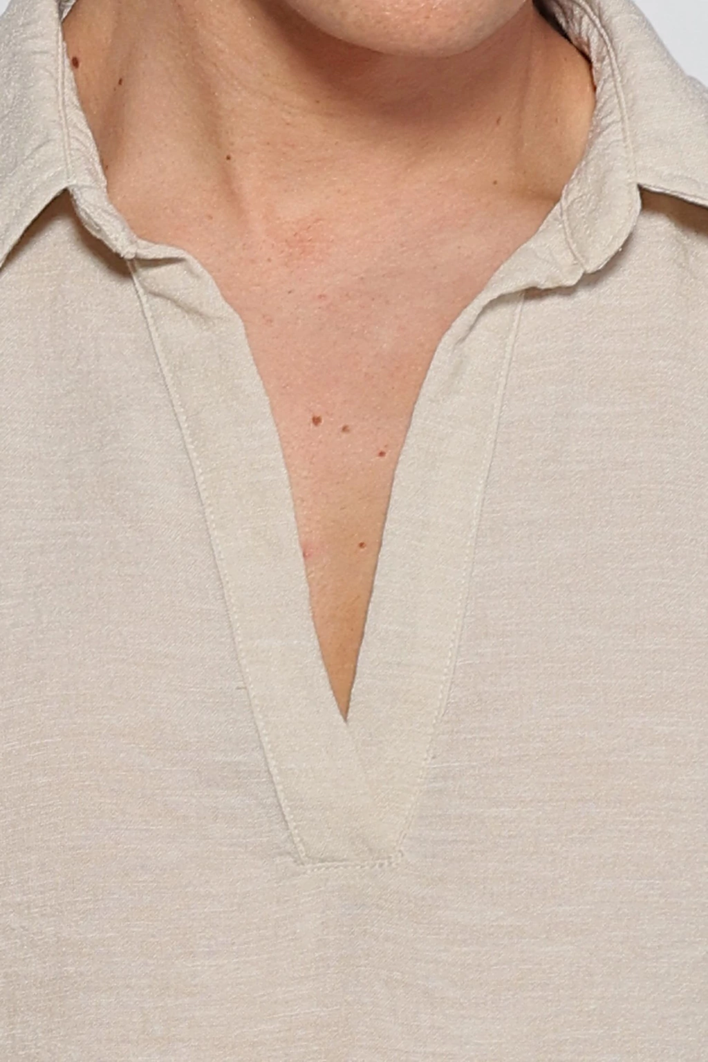Camisola manga larga símil Lino de calce regular. Tiene cuello con cartera en "V". Es una prenda cómoda y liviana.
