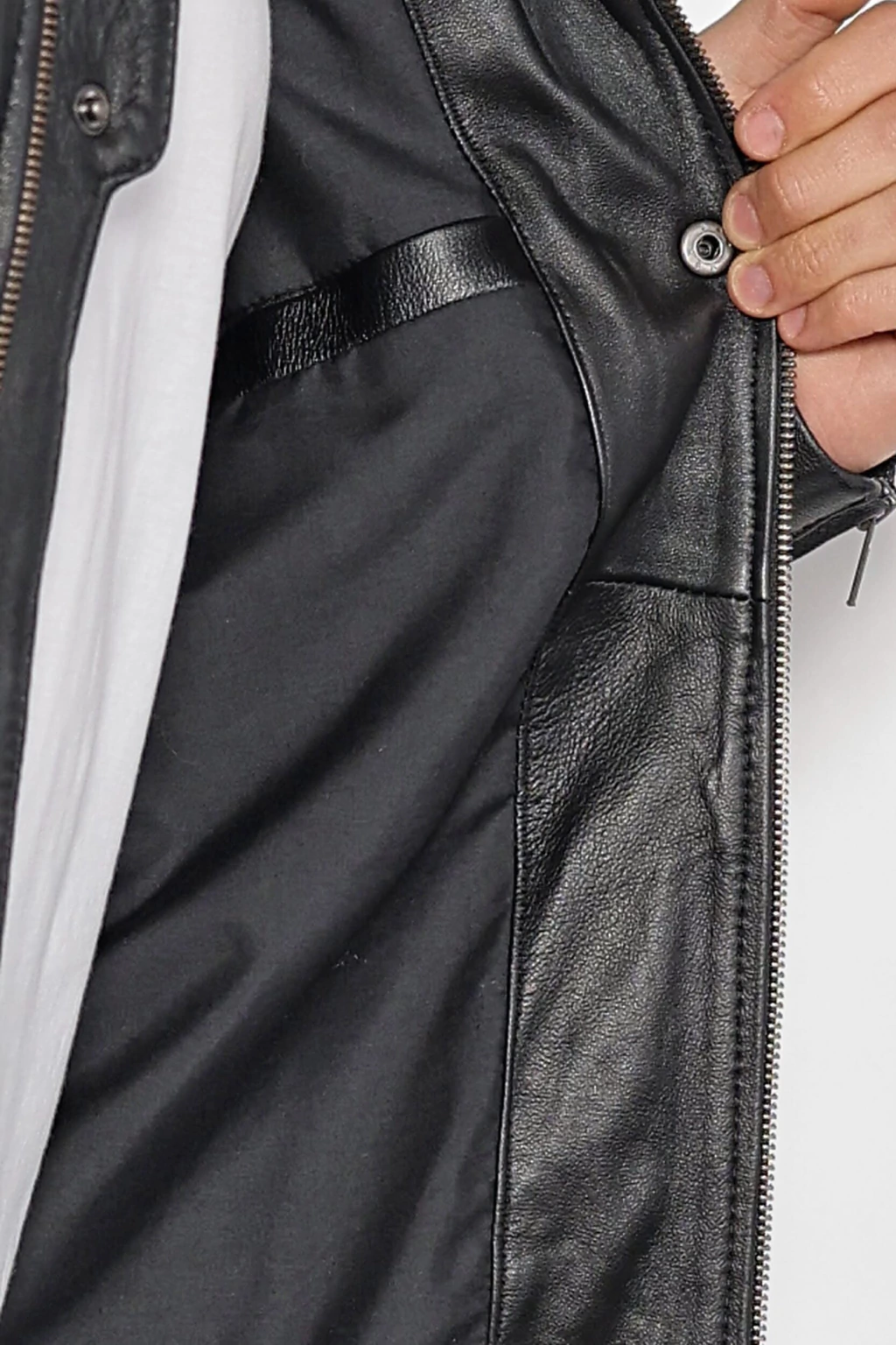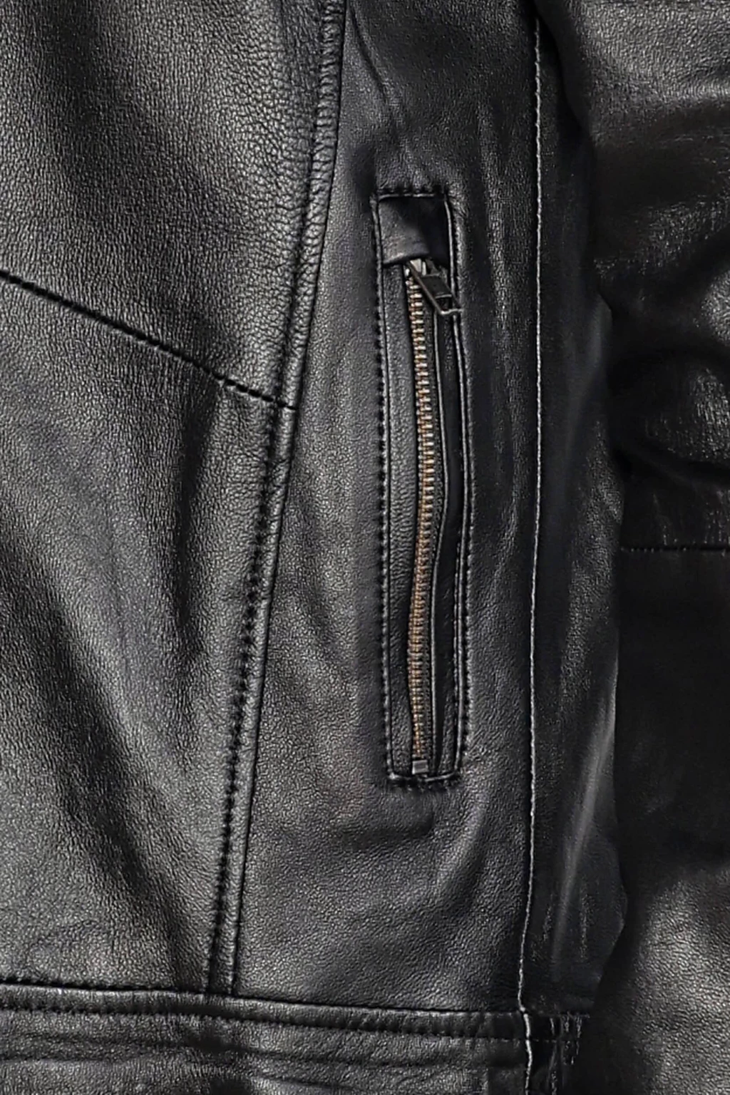 Campera 100% de cuero de oveja, con su interior forrado en poplín de algodón, con una estampa brillosa con tacto. Tiene recortes laterales, y todos los bolsillos cuentan con cierres en color black níquel.