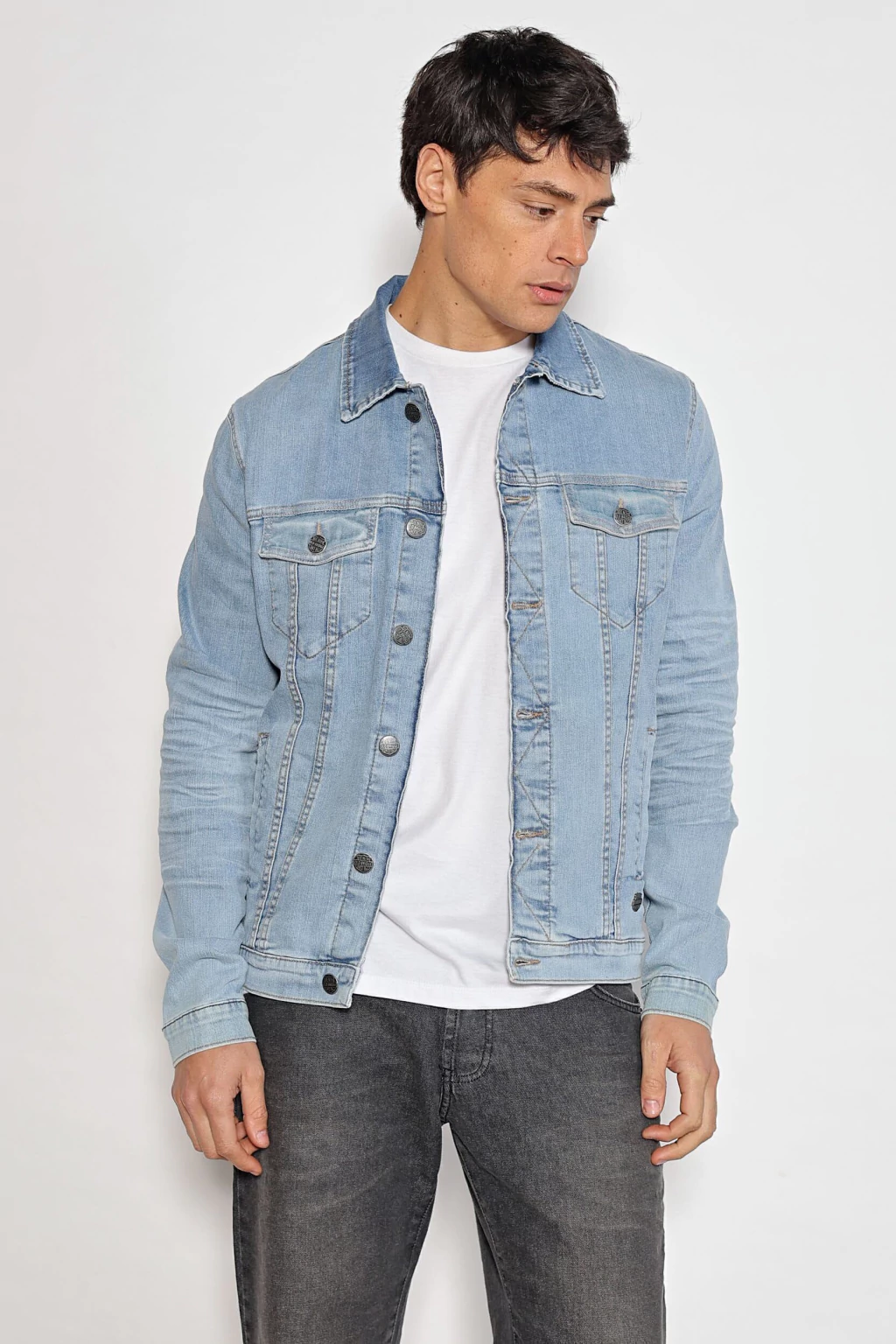 Campera en denim de algodón con elastano. Tiene un lavado celeste claro con localizados en frente y espalda, más detalles de arrugas en costados y brazos. Lleva botones al frente en color plata vieja con distinción de la marca. Ideal para un look urbano.