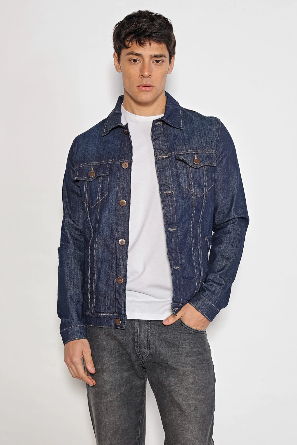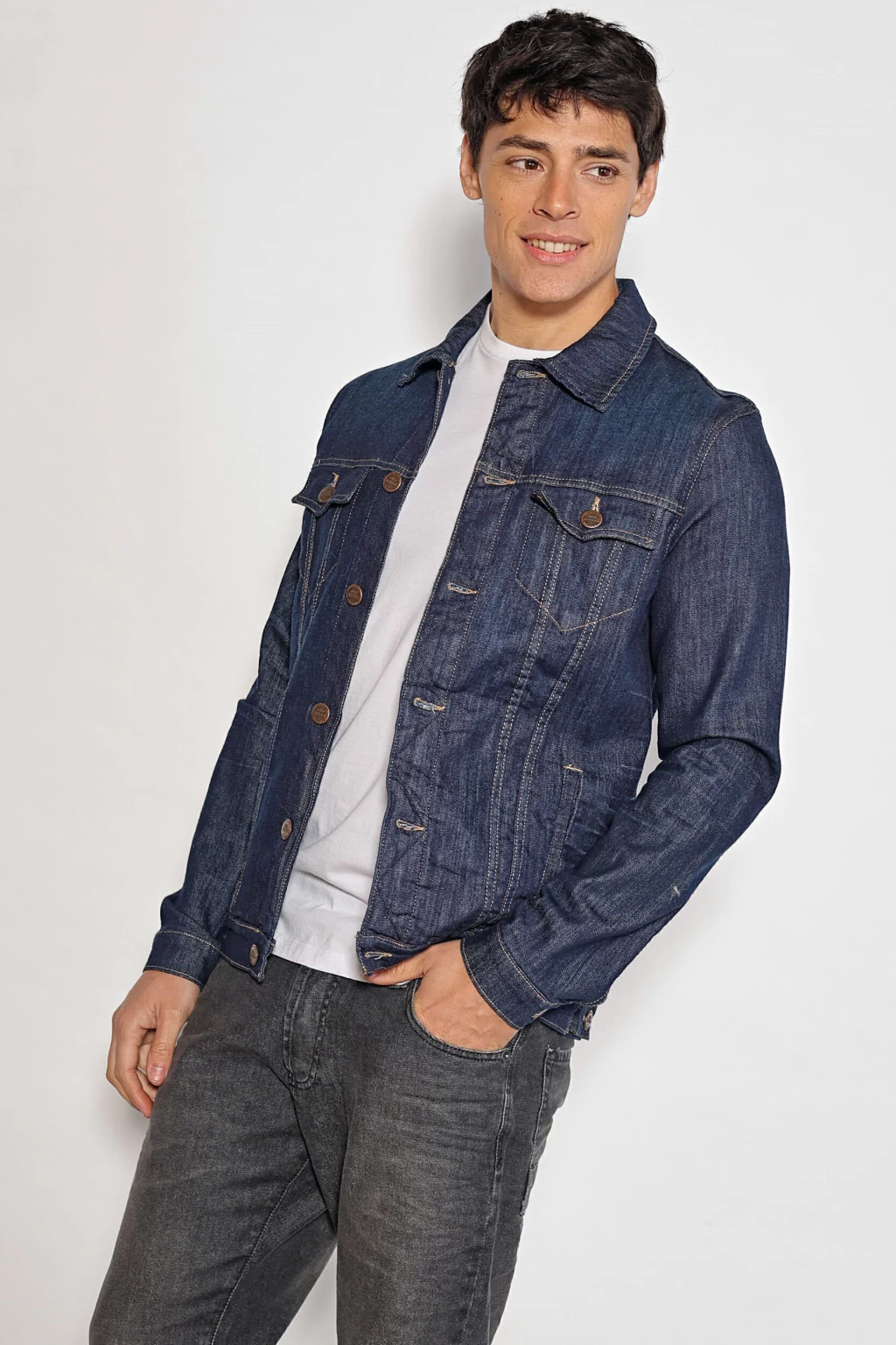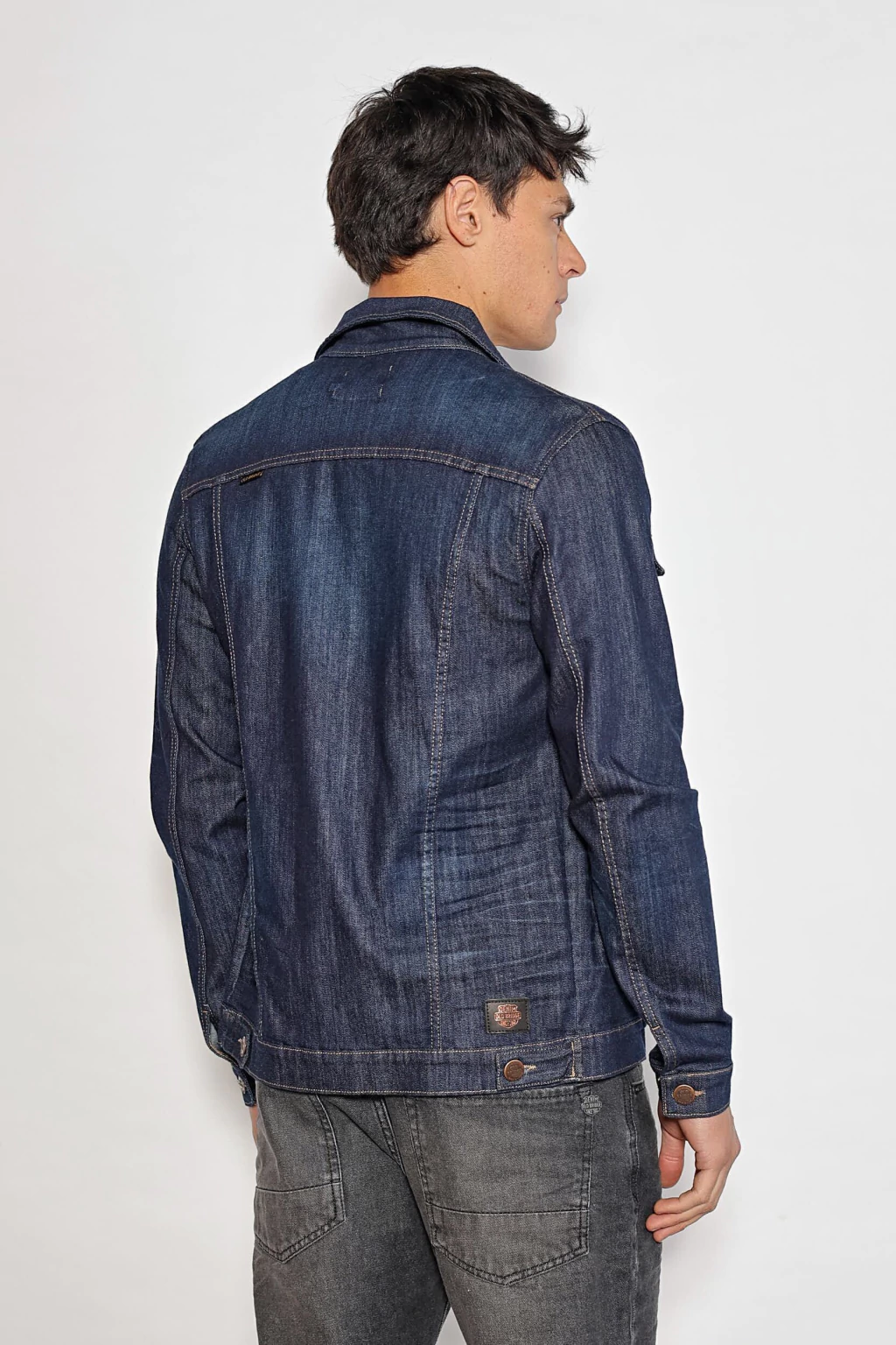 Campera de denim de algodón con elastano. Tiene un lavado azul intenso con localizados en frente y espalda y detalles de arrugas en brazos. Lleva botones al frente en color cobre con distinción de la marca. Ideal para un look urbano.