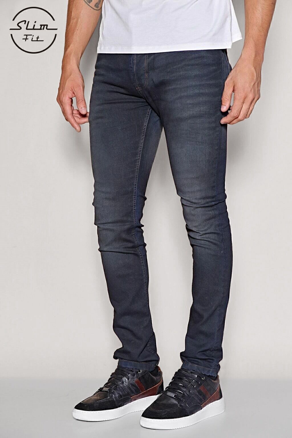 Denim de algodón con elastano, tiro medio, y con botones, de calce Slim fit. Tiene un lavado azul oscuro con focos suaves en piernas, bigotes, y arrugas con volumen en caja. Sus costuras son color marrón oscuro. Se recomienda lavar del revés.