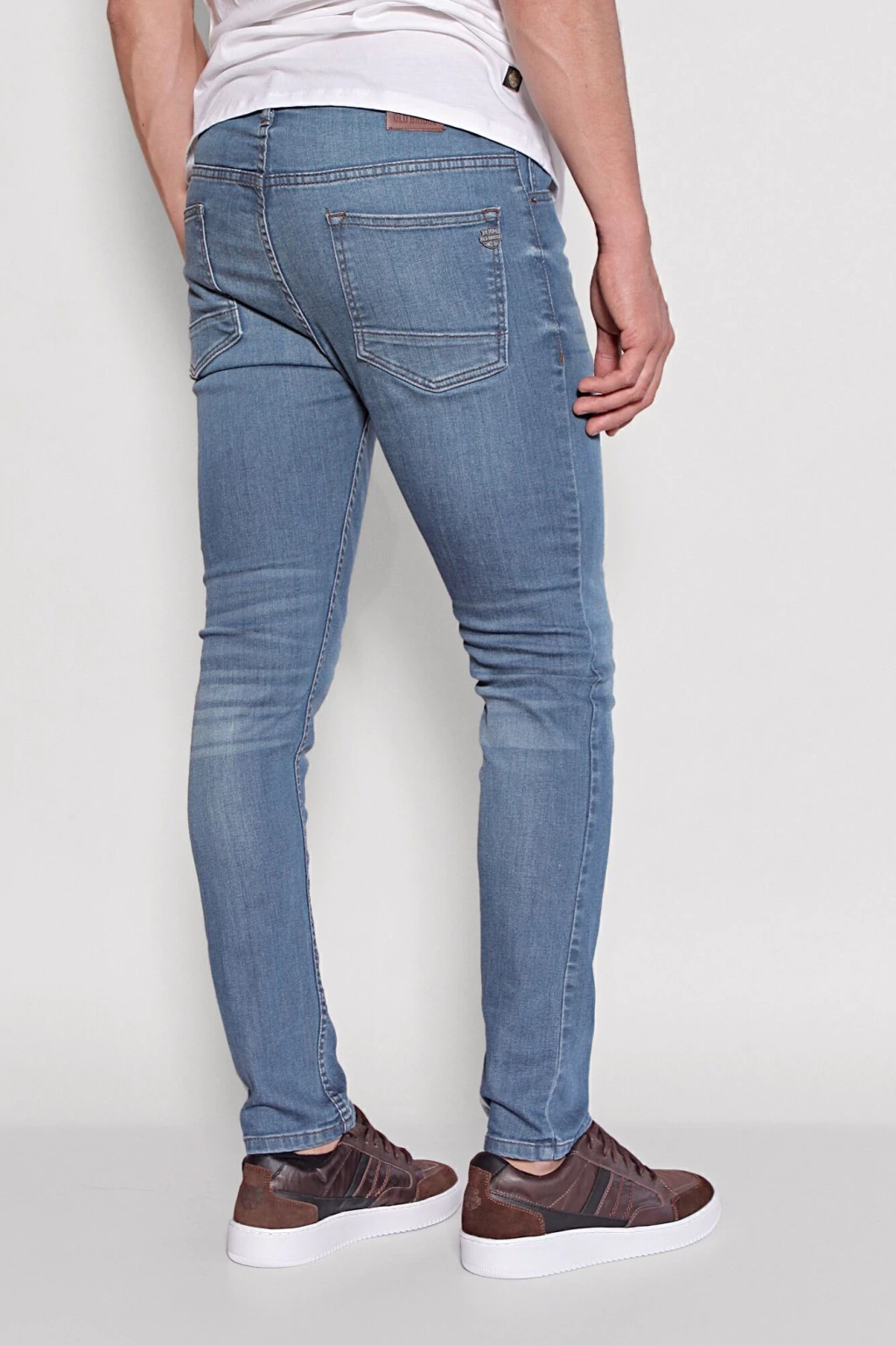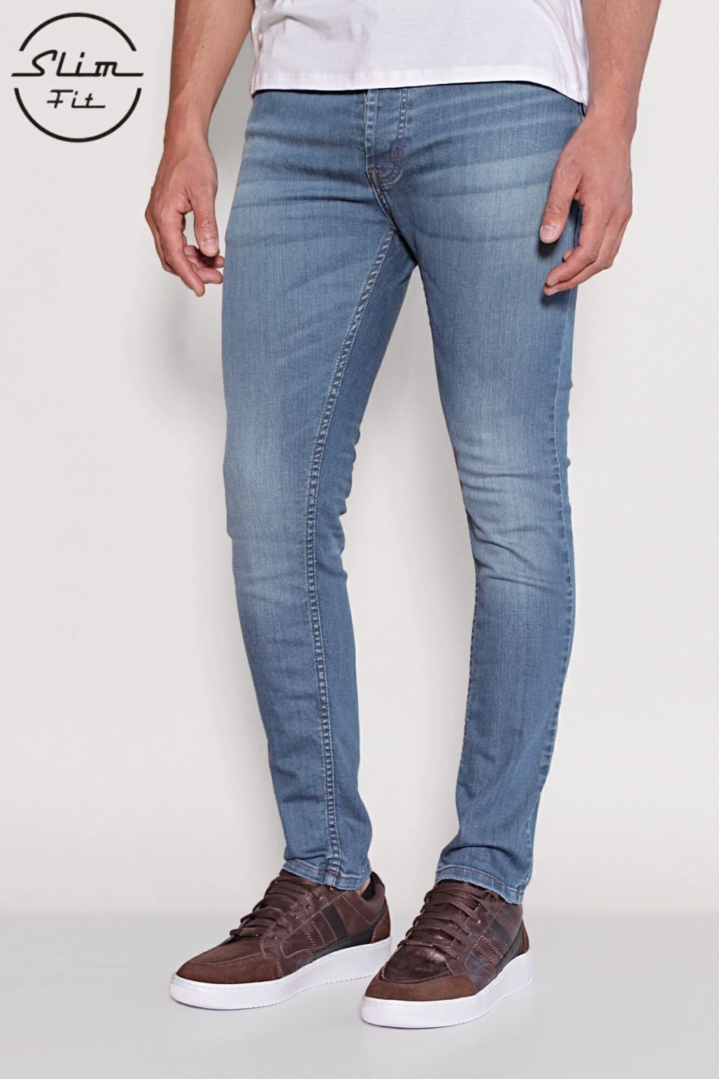 Denim de algodón con elastano, de tiro medio y calce Slim fit. La cartera lleva botones, y cuenta con un lavado azul medio con focos suave en piernas, bigotes y arrugas con volumen en caja. Las costuras son de color azul oscuro. Se recomienda lavar del revés.