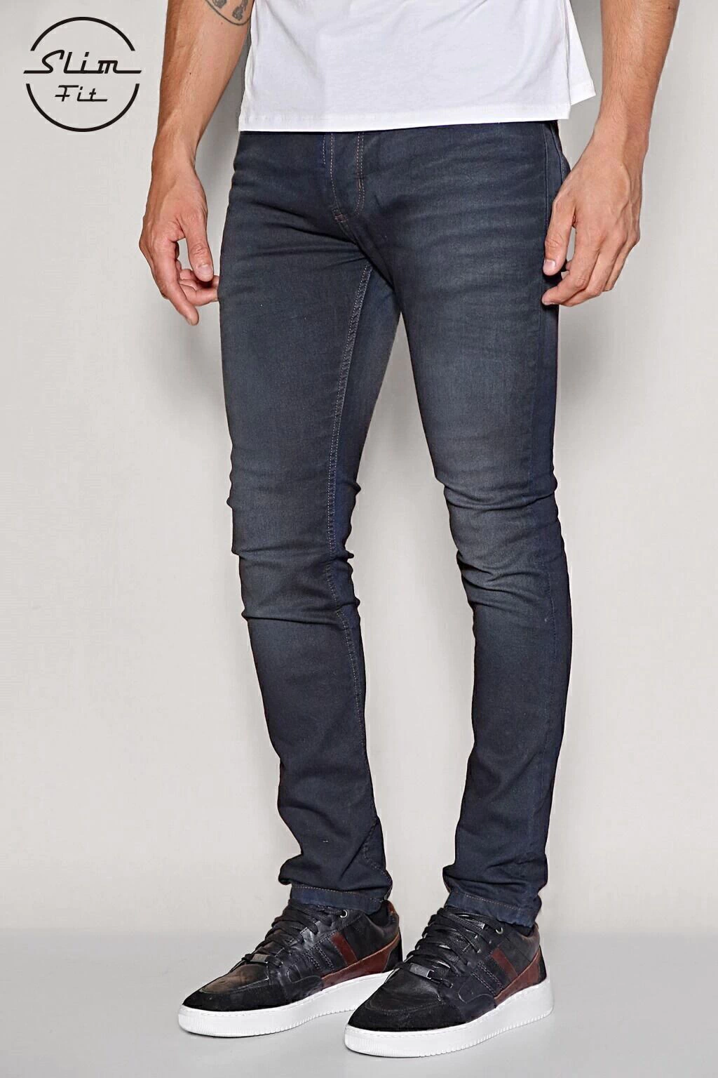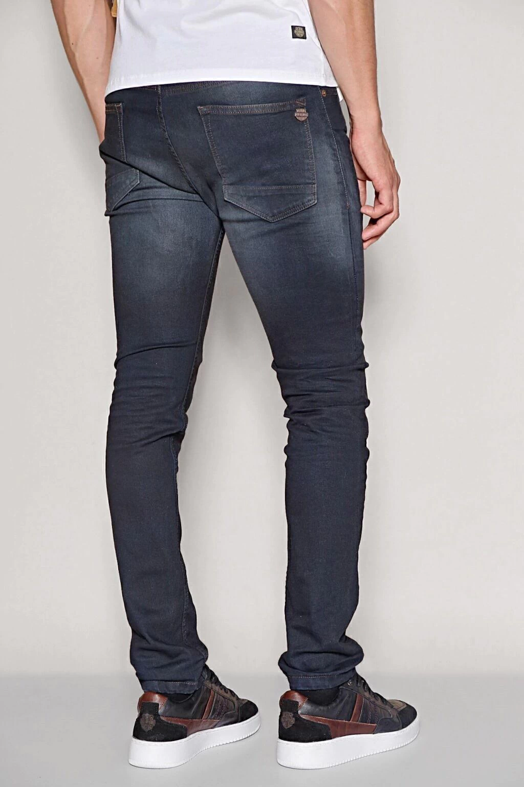 Denim de algodón con elastano, tiro medio, y con botones, de calce Slim fit. Tiene un lavado azul oscuro con focos suaves en piernas, bigotes, y arrugas con volumen en caja. Sus costuras son color marrón oscuro. Se recomienda lavar del revés.