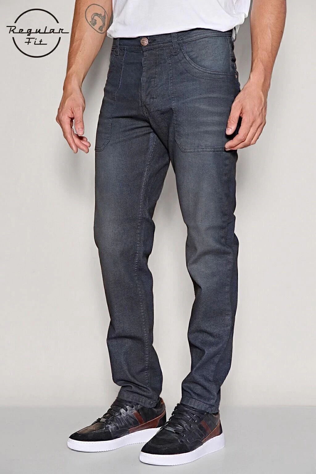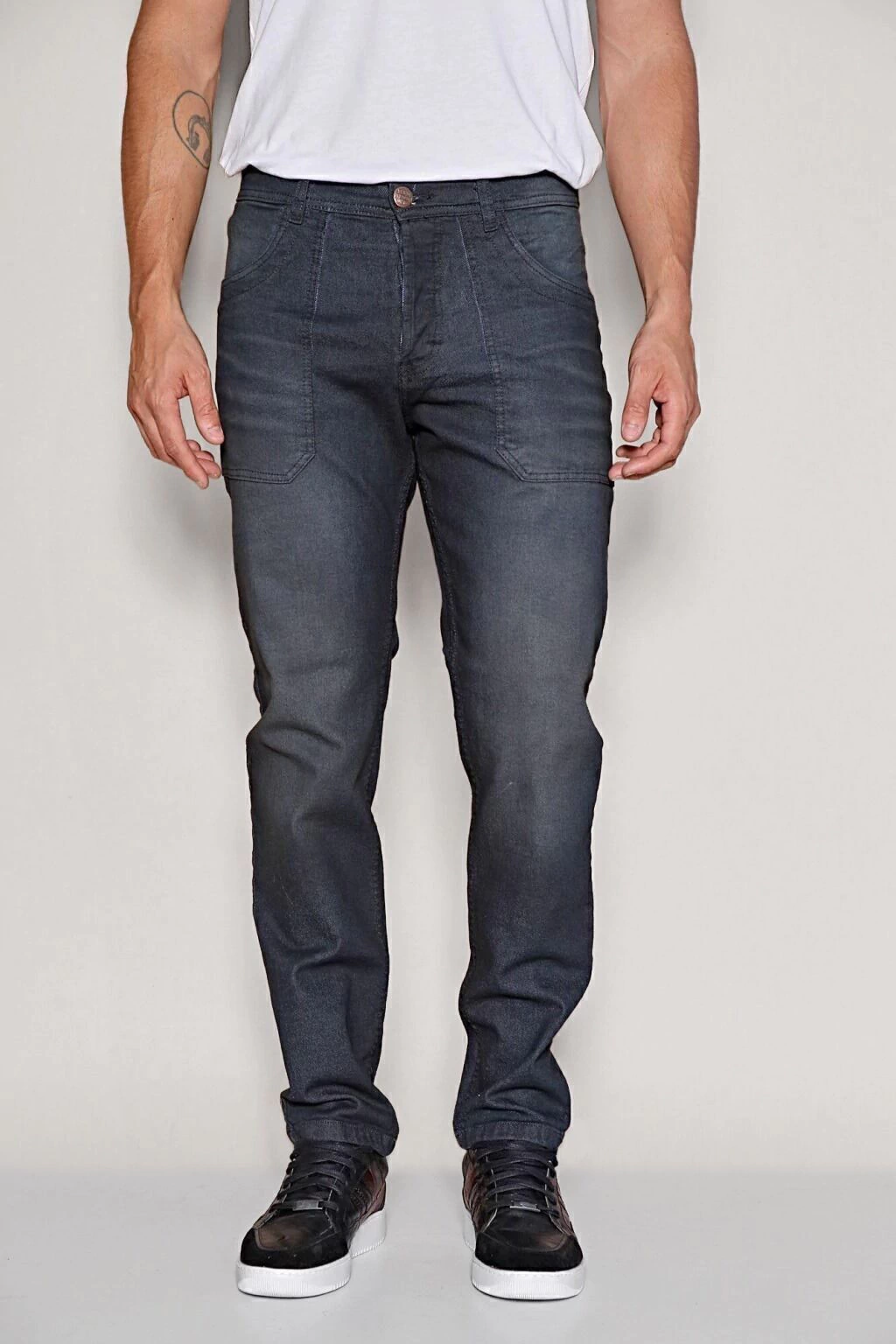 Denim de algodón con elastano. Lleva cartera con botones. Tiene bolsillos diferenciados aplicados. Lleva un lavado intenso de color negro con bigotes en caja. Se recomienda lavar del revés.