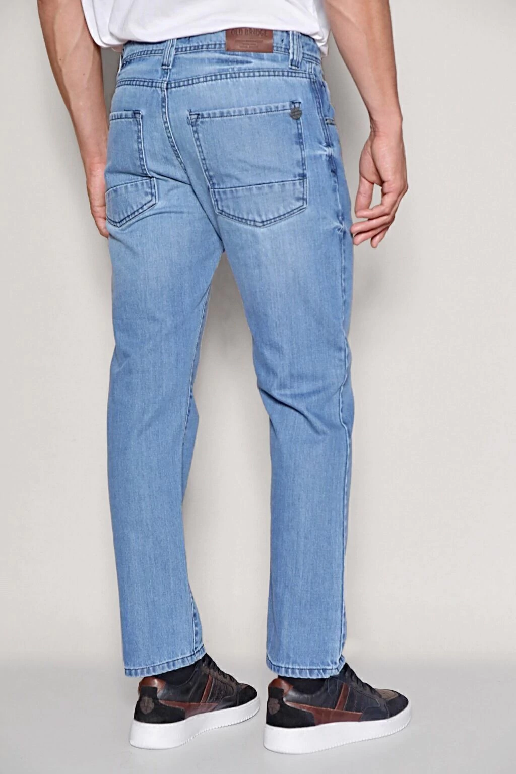 Denim de algodón 100% rígido, con cartera con botones. Tiene un lavado de color azul medio con bigotes leves en caja. Se recomienda lavar del revés.