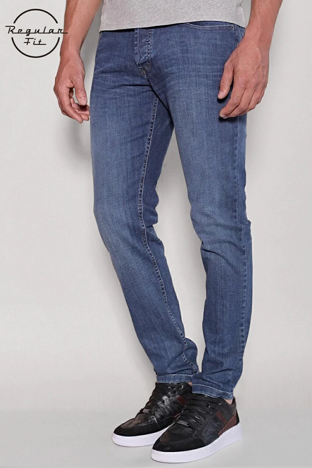 Denim de algodón con elastano, de tiro medio. Calce Regular Fit. Cartera con botones. Tiene un localizado suave en piernas, y bigotes en caja. Se recomienda lavar del revés.