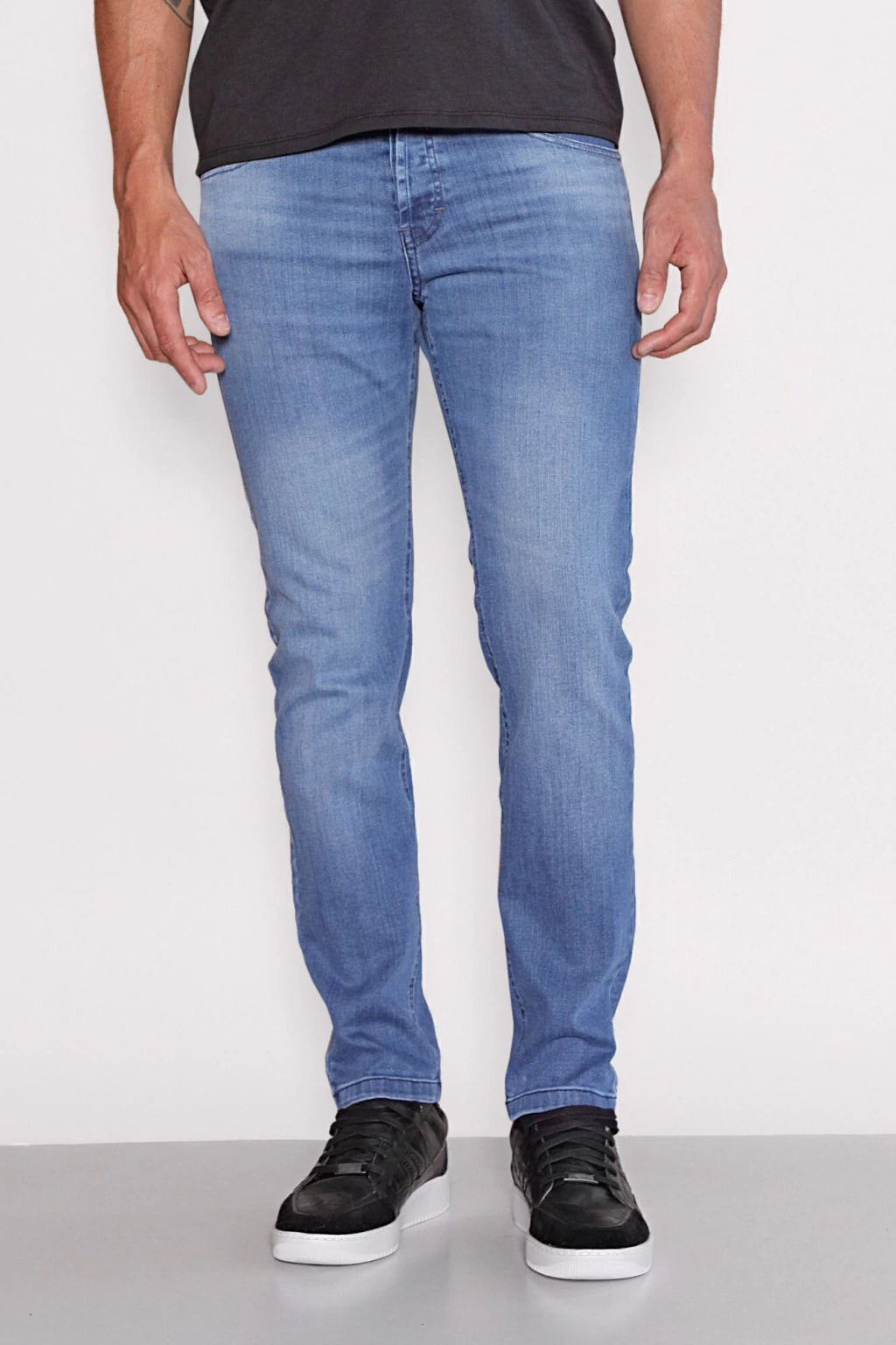 “Denim en lavado celeste con desgastes suaves que aportan frescura. Su calce regular y tiro medio lo convierten en un básico cómodo y fácil de combinar”.