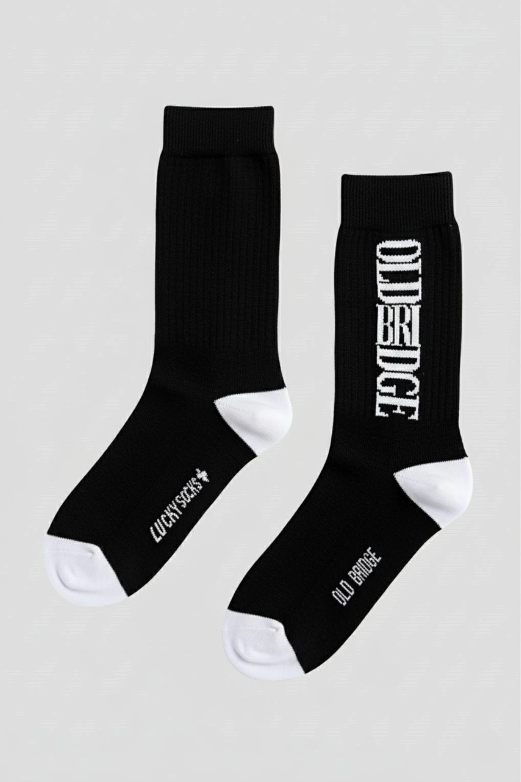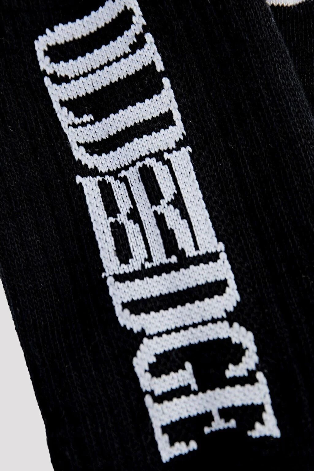 Media gruesa de caña alta en puro algodón con relieve rayado. Base en color negra, puntera y talón de color blanco. En los laterales tiene la marca con tipografía especial.