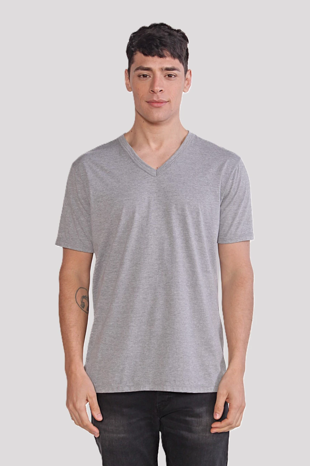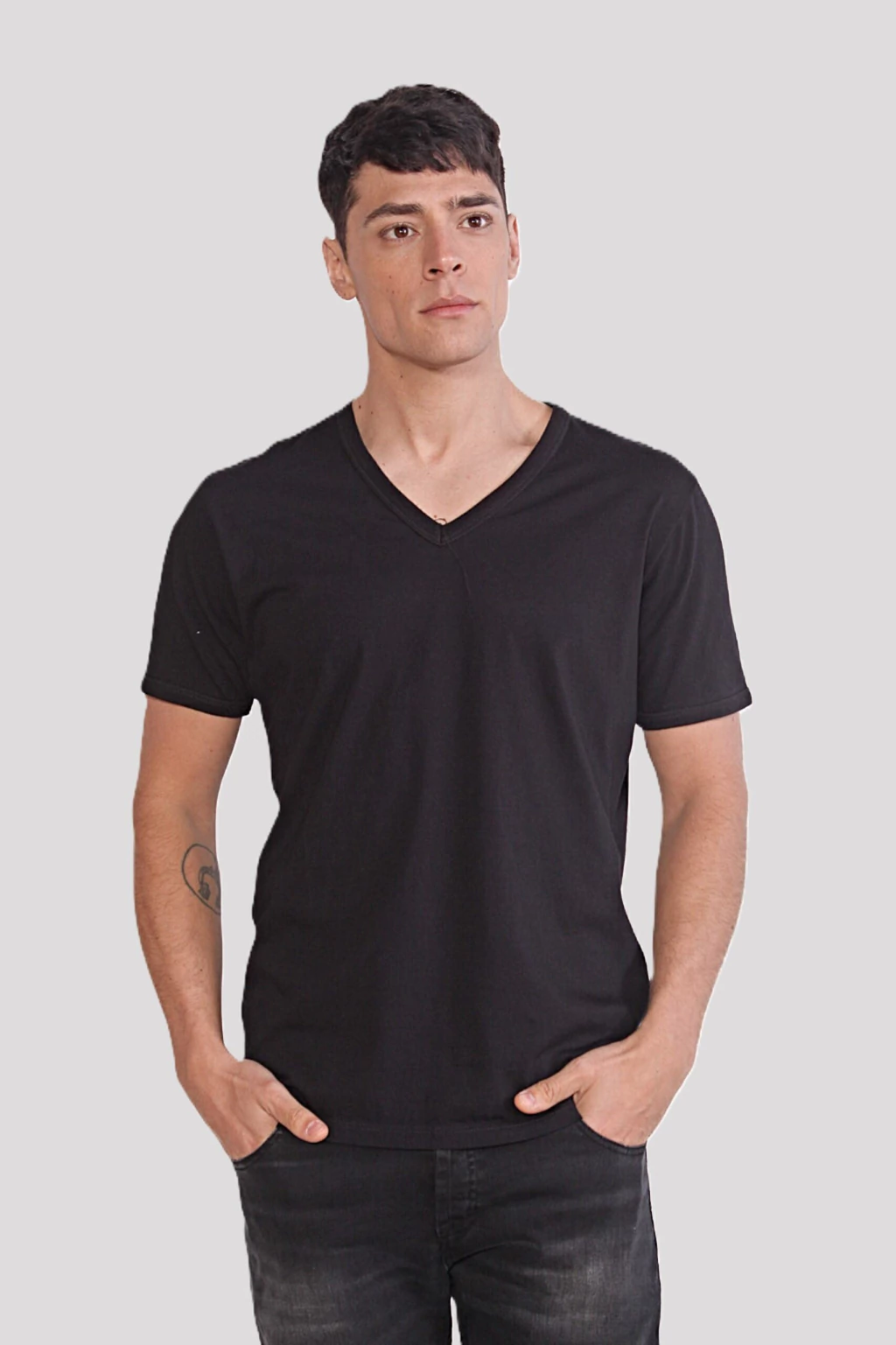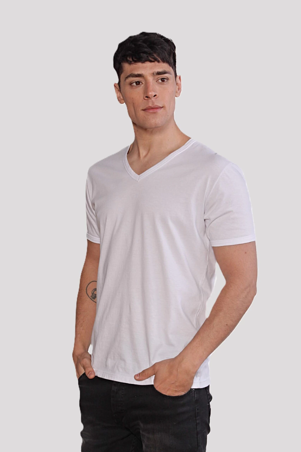 Remera escote en "V", manga corta, con cuello y puños con collareta al tono. Confeccionada en jersey puro algodón. Calce regular.