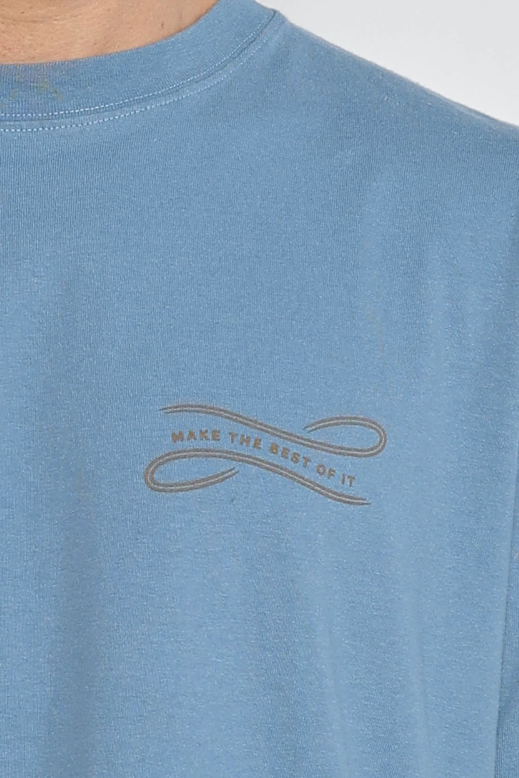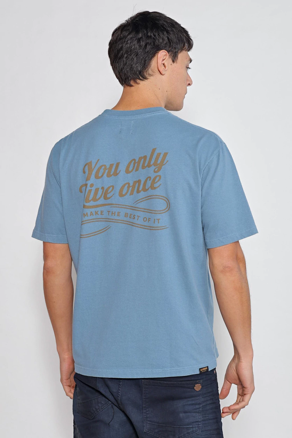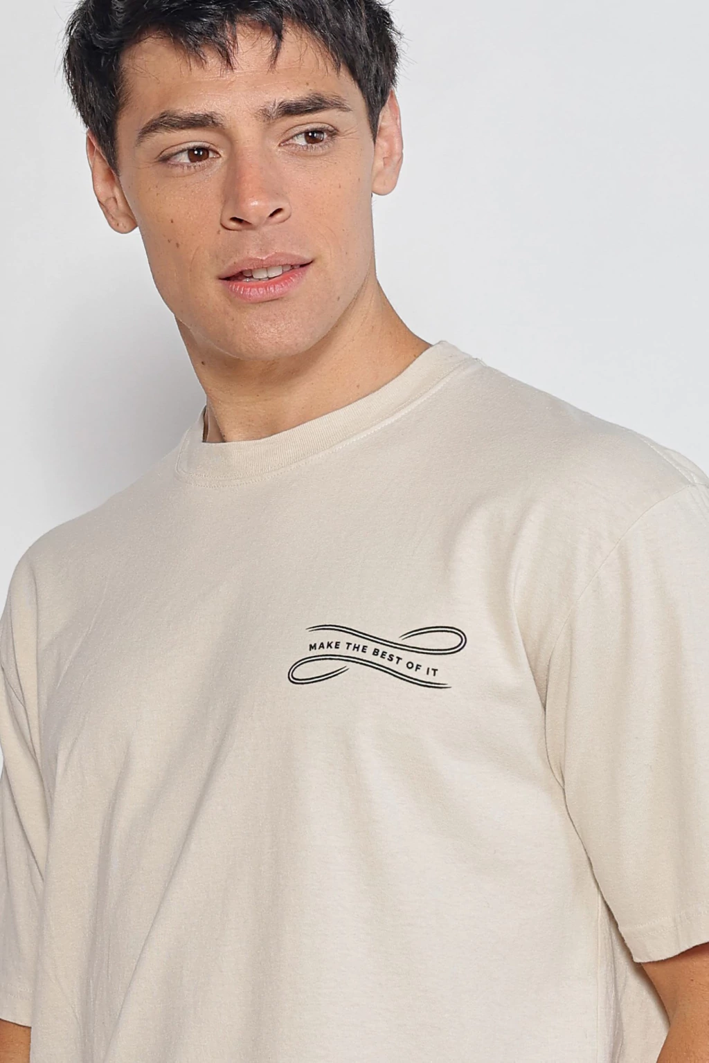 Remera oversize estampada de escote redondo, mangas cortas, y cuello ribb al tono. Esta confeccionada en jersey puro algodón pesado. Cuenta con una estampa en el frente y espalda sin tacto. Su calce es holgado.