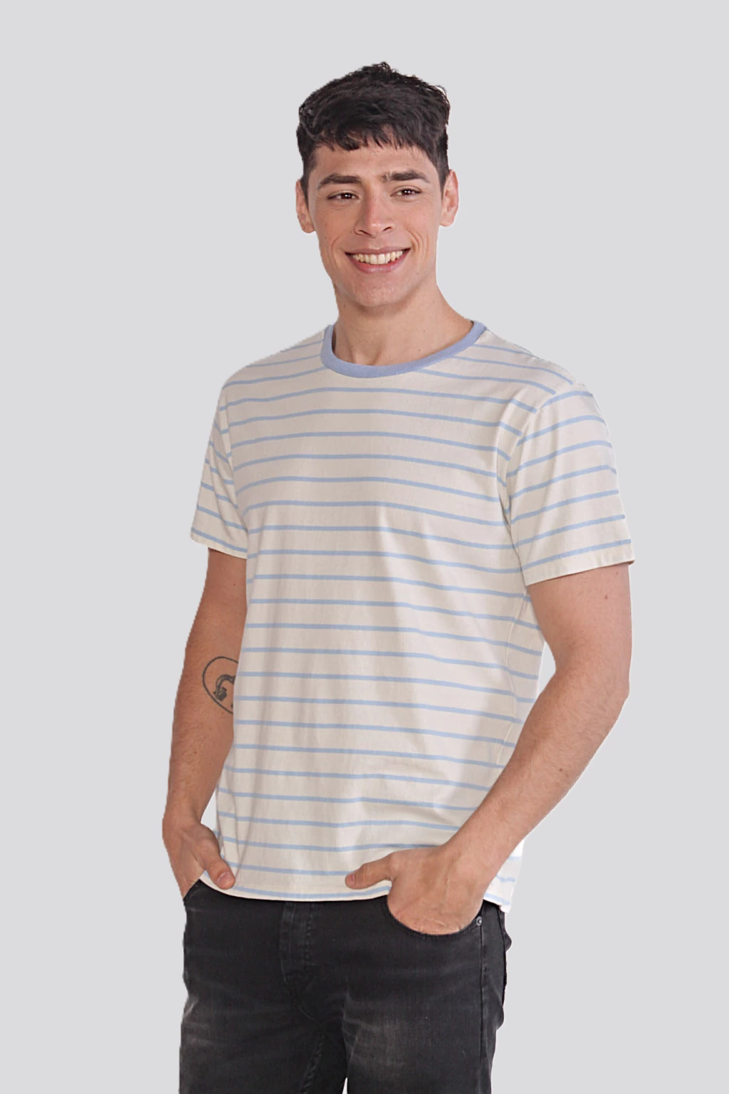 Remera escote redondo, con cuello en ribb al tono, mangas cortas. Confeccionada en jersey rayado de puro algodón. Calce regular.