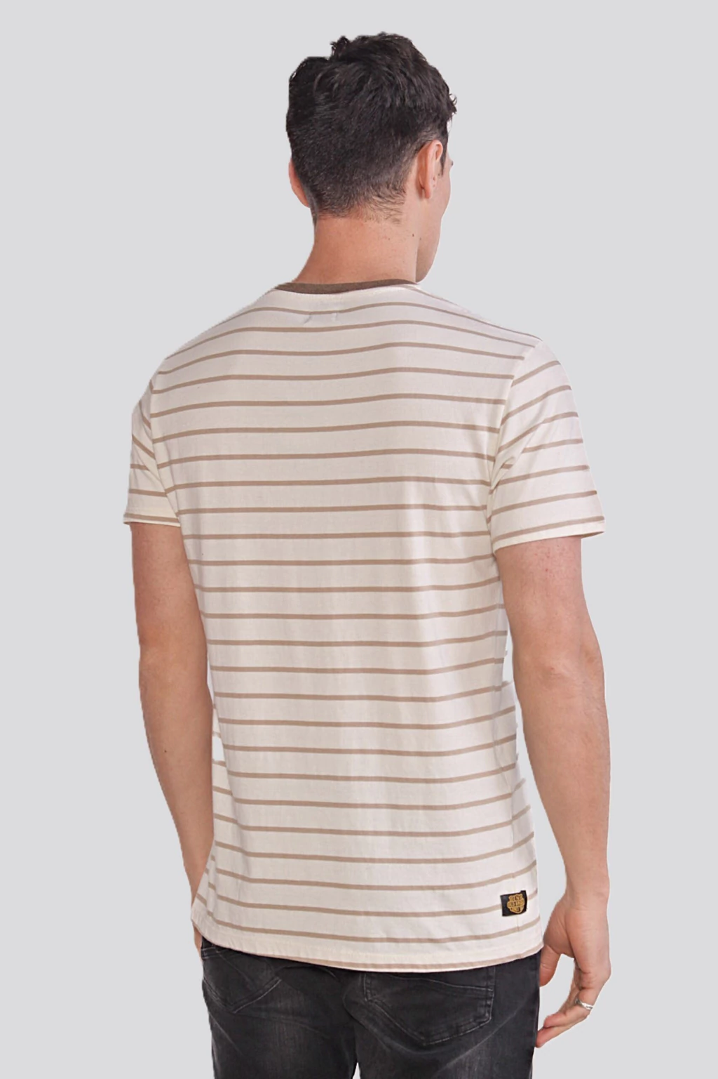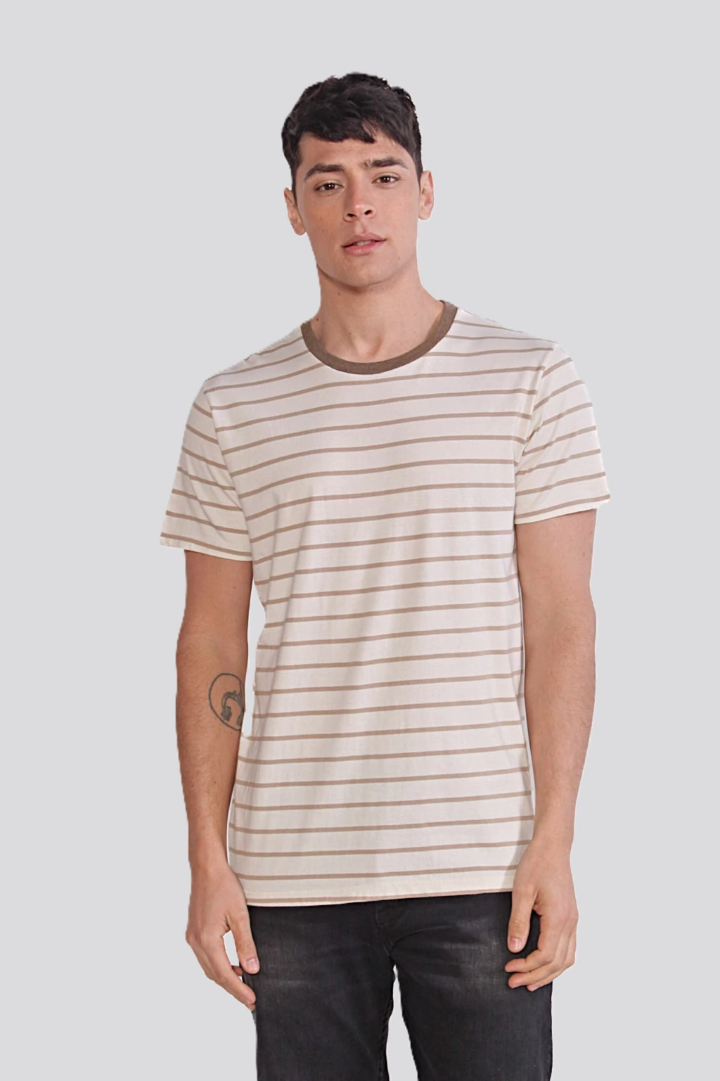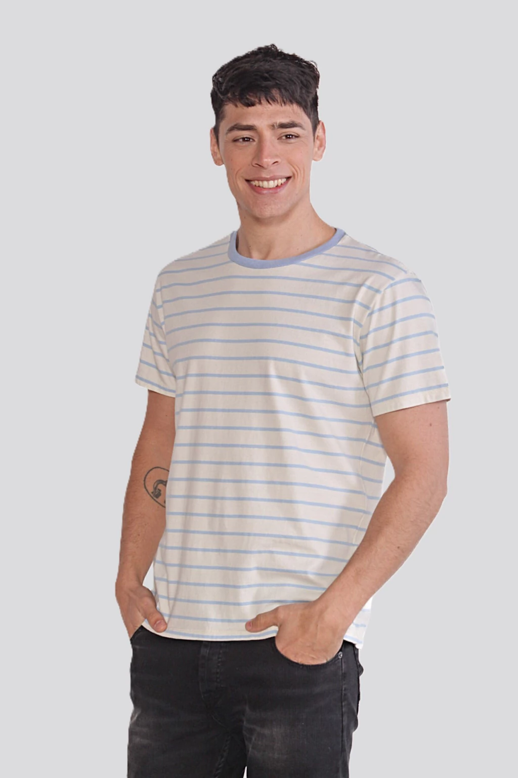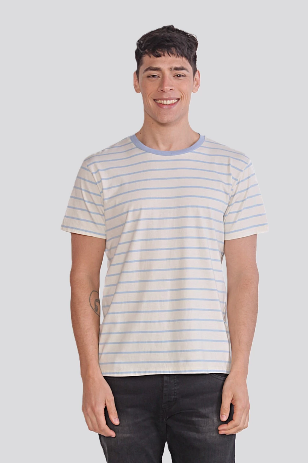 Remera escote redondo, con cuello ribb al tono, y mangas cortas. Esta confeccionada en jersey rayado de puro algodón. Su calce es regular.