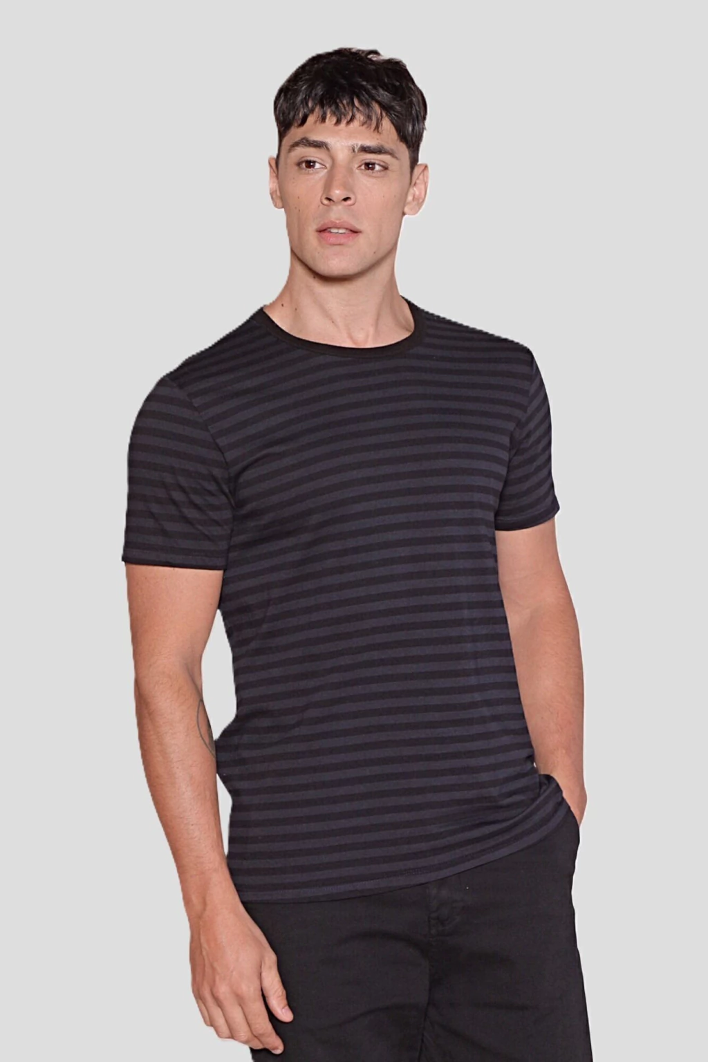 Remera rayada escote redondo de mangas cortas, con cuello en ribb liso. Cuenta con un teñido artesanal, y esta confeccionada en jersey puro algodón. Su calce regular.
