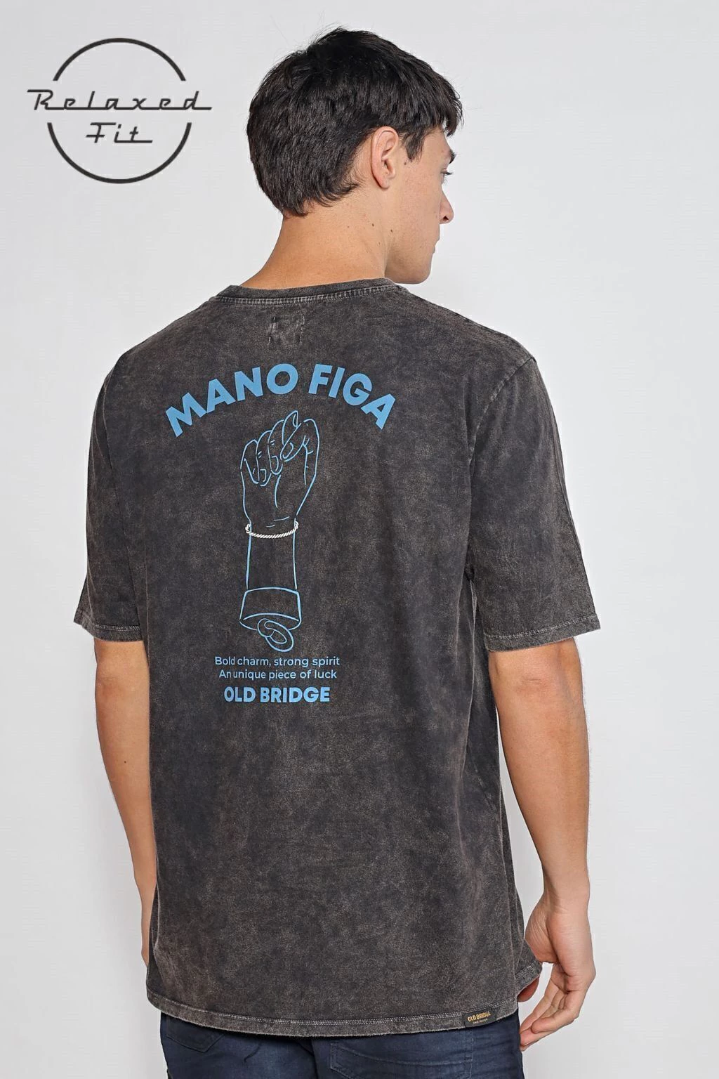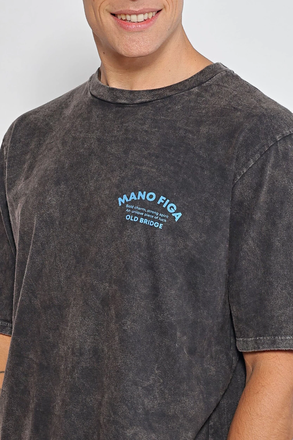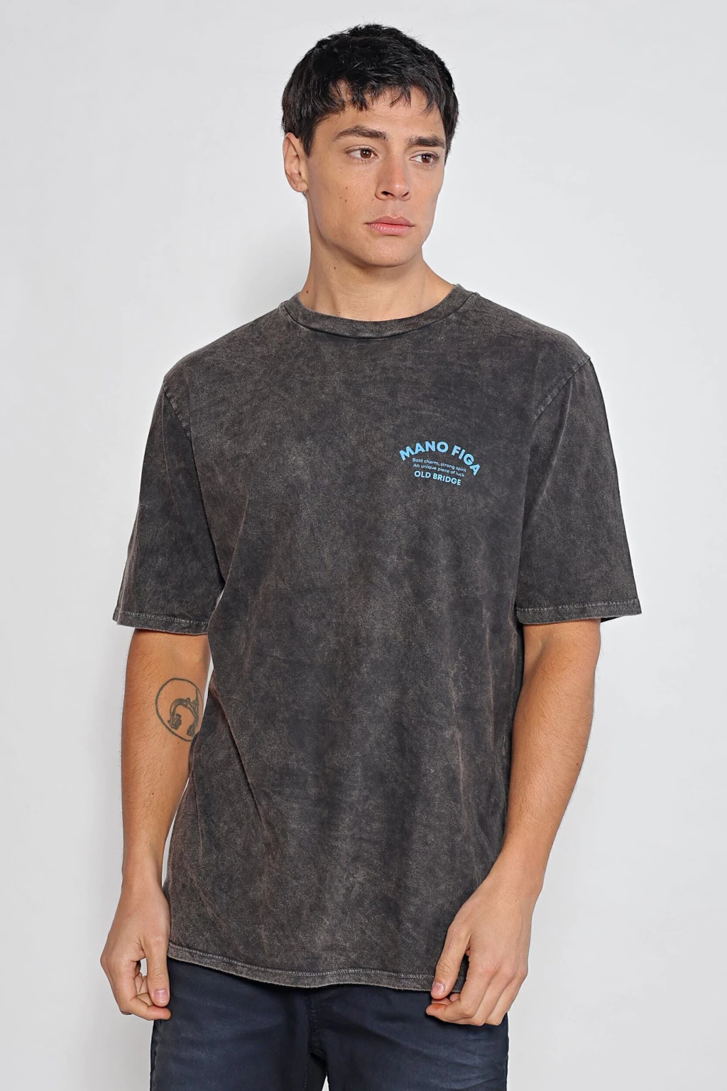 Remera oversize estampada de escote redondo, mangas cortas, y cuello ribb al tono. Se encuentra confeccionada en jersey de puro algodón, y lleva un proceso de teñido artesanal que genera un aspecto gastado con efectos localizados. En el frente y espalda cuenta con una estampa sin tacto. Su calce es holgado.
