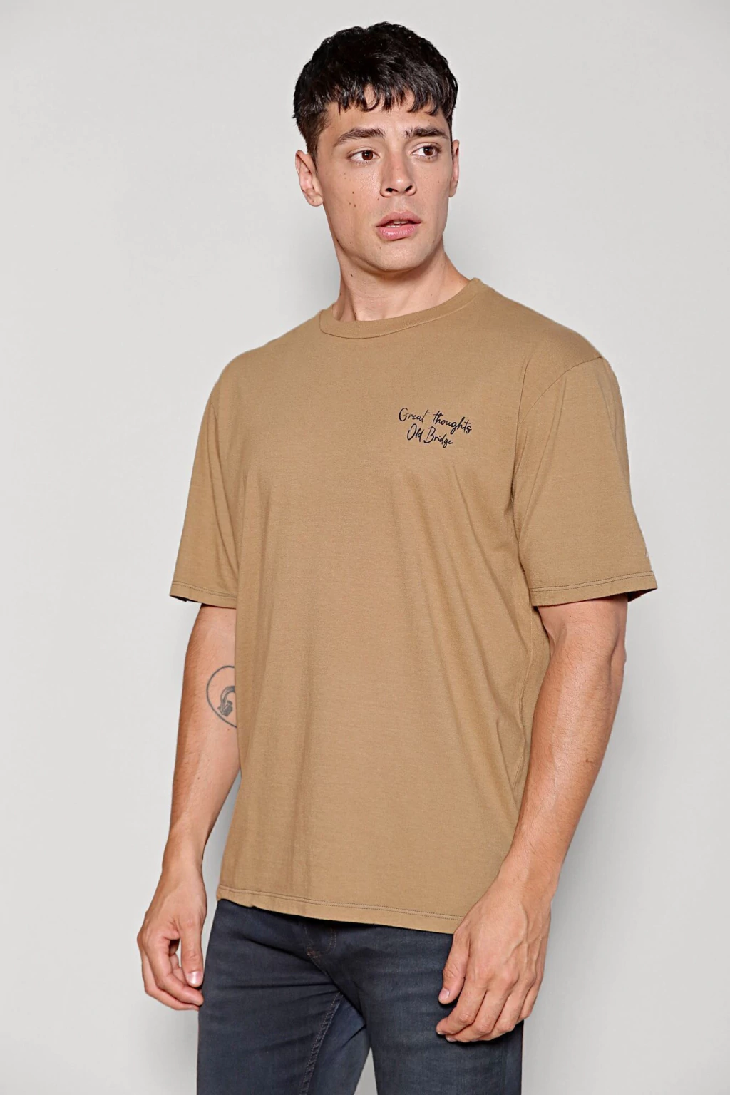 Remera oversize estampada de escote redondo, mangas cortas, y cuello ribb al tono. Confeccionada en jersey puro algodón, con un proceso artesanal donde se le otorga un color más vibrante y diferenciado. Lleva en el pecho una estampa logo y en espalda una estampa central sin tacto. Calce holgado.