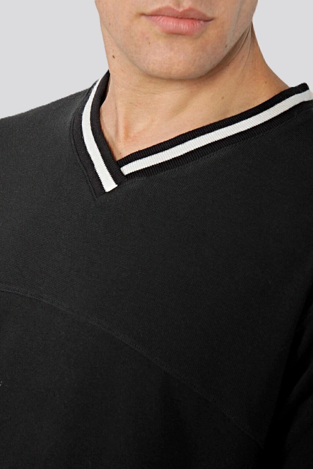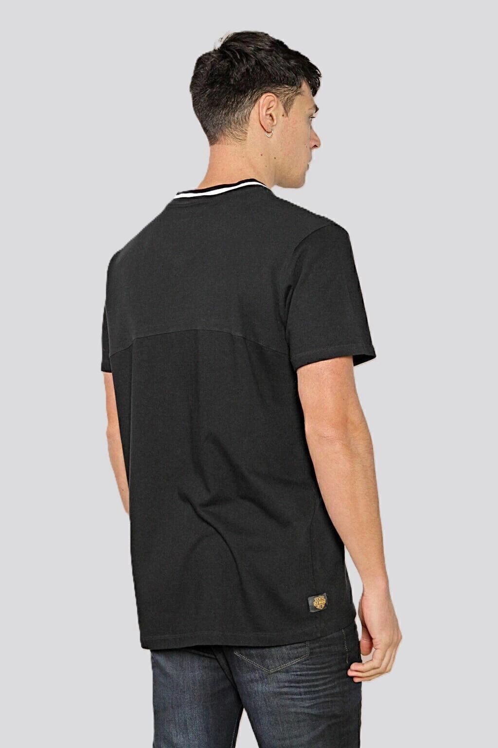 Remera escote en "V" con cuello tejido de algodón a rayas y de mangas cortas. Tiene un canesú de tela micro panal y el resto del cuerpo en jersey pesado, ambos de puro algodón. Lleva un logo estampado sin tacto sobre el frente. Calce regular.