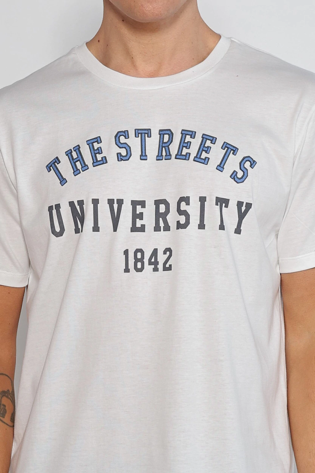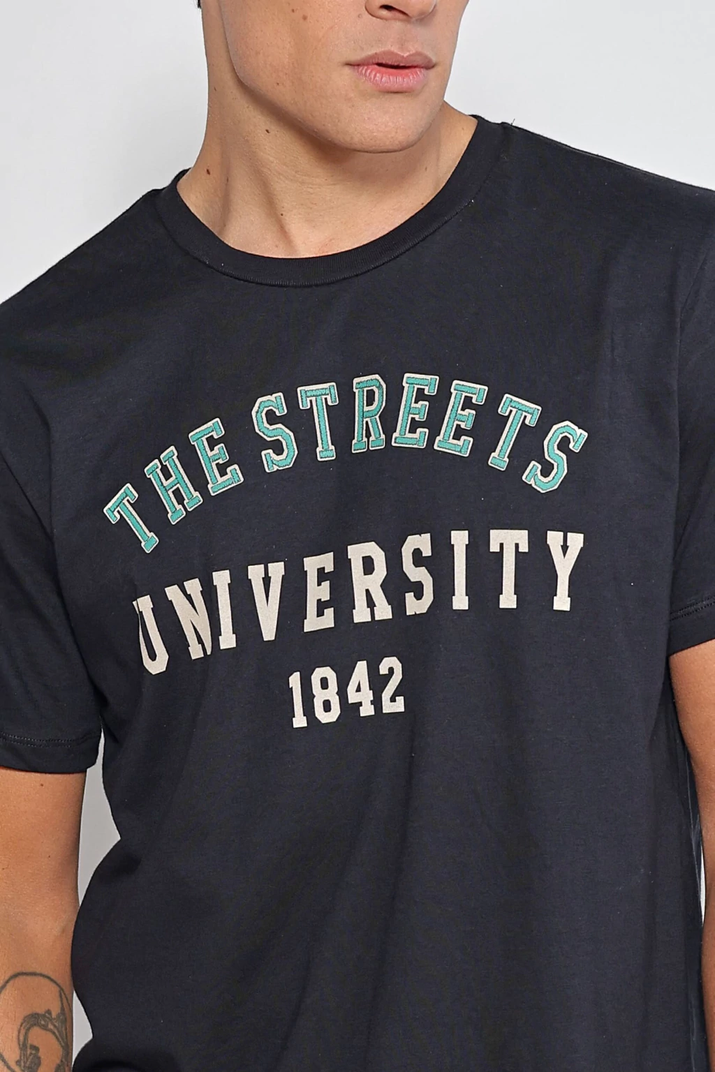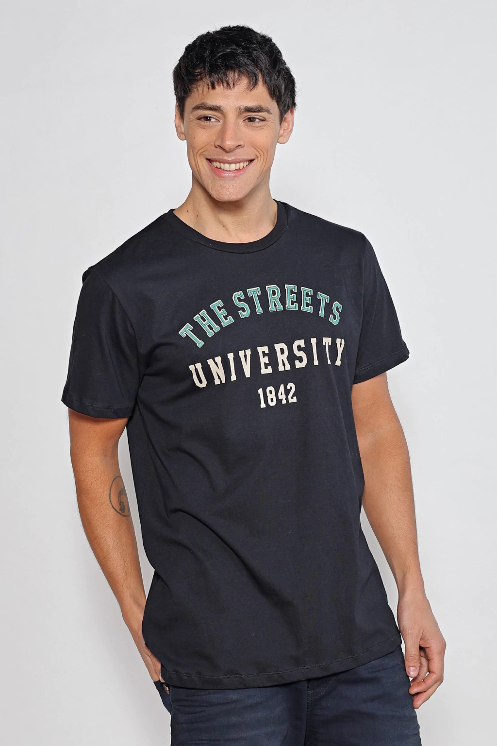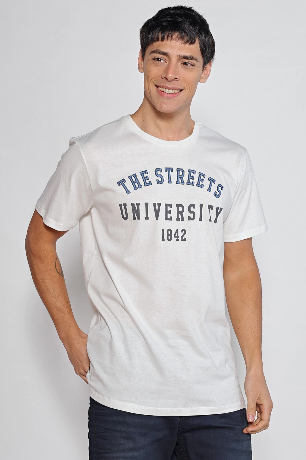 Remera estampada escote redondo, de mangas cortas, con cuello en ribb a tono. Se encuentra confeccionada en jersey de puro algodón. Lleva en el frente una estampa central, con textura. Su calce es regular.