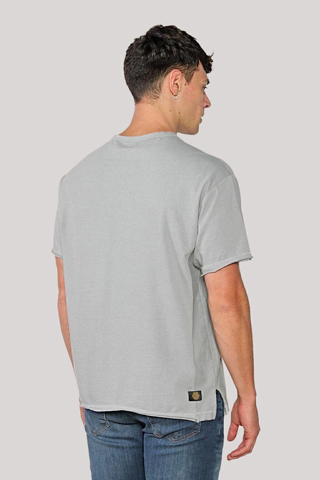 Remera escote redondo, con tajos laterales y detalle de costura bordador en recortes laterales, hombros y sisas. Las terminaciones en puños y ruedos son al corte. Lleva un logo estampado sin tacto en la espalda. Confeccionada con jersey pesado de puro algodón. Calce regular.