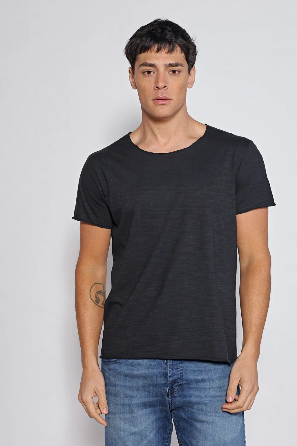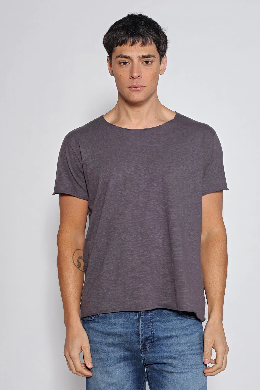 Remera escote redondo, de mangas cortas, con cuello, puños y ruedo al corte. Se encuentra confeccionada en jersey flame. Su calce es regular.