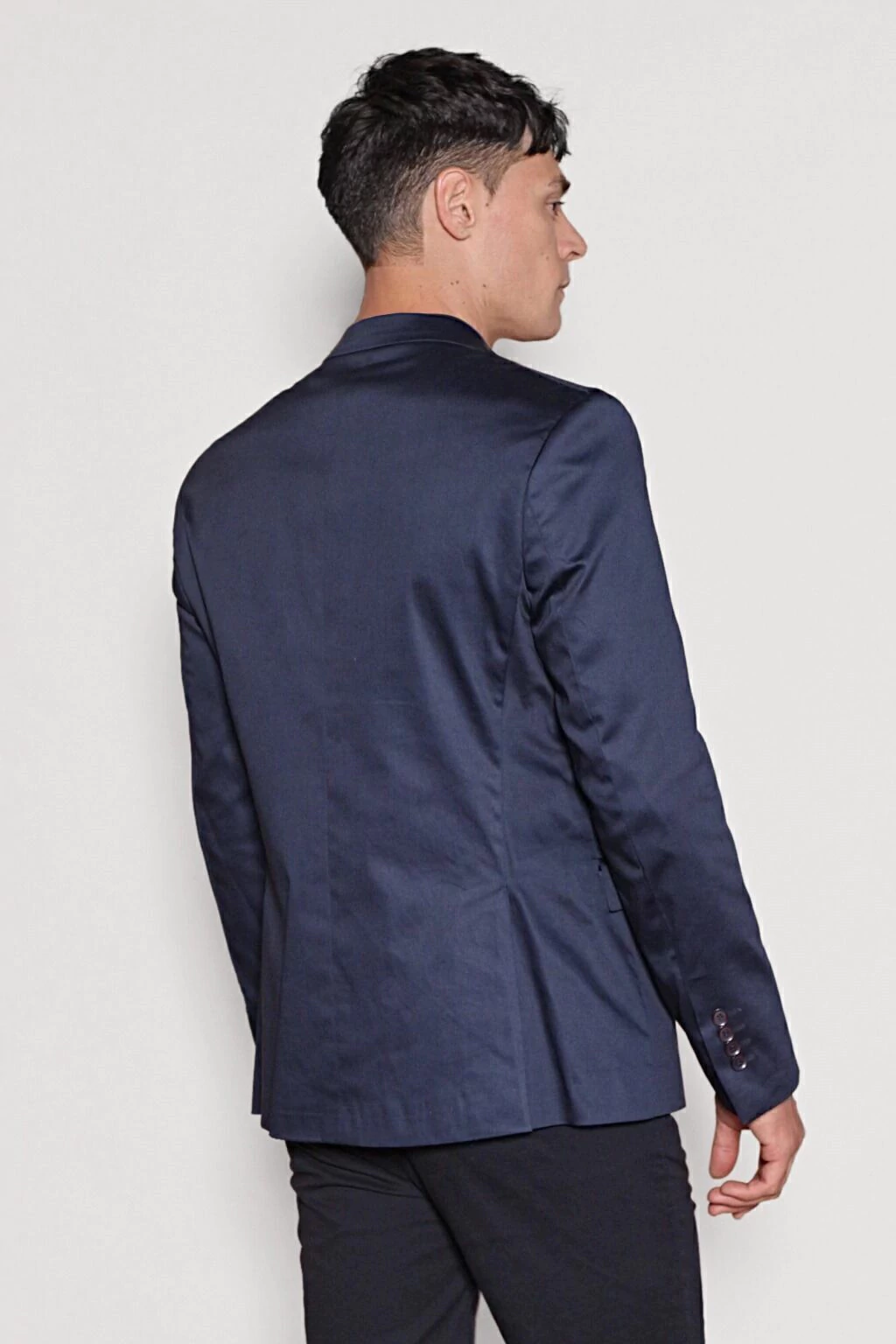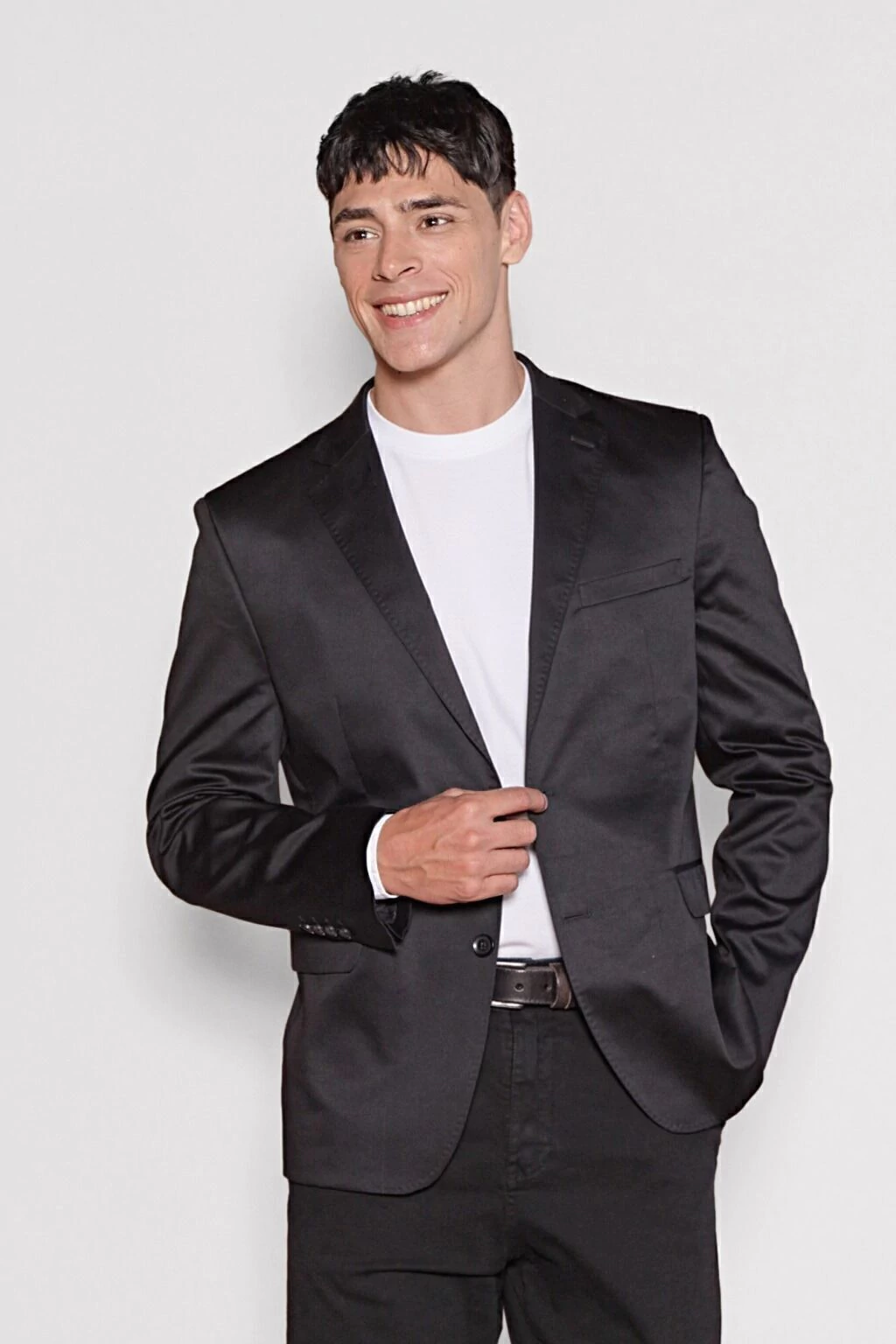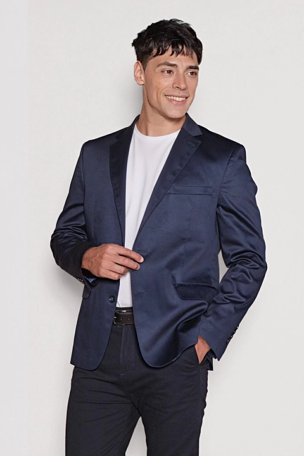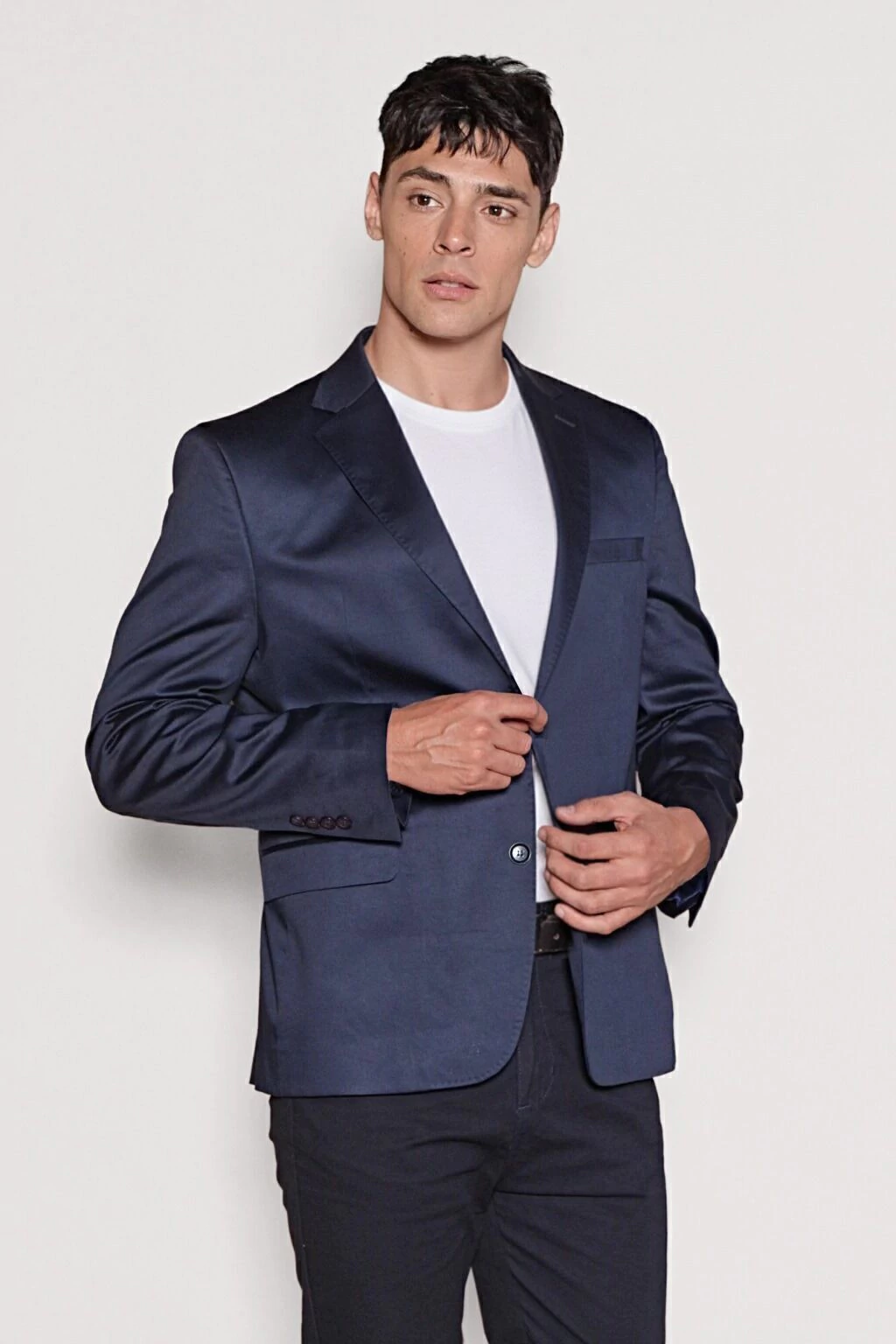 Saco sastrero clásico de cottón satén, con cuello y solapa en punta con ojal bordado, bolsillo ojal superior en lado izquierdo y dos bolsillos con tapa externos. Acceso central con dos botones y detalle de botones en mangas. Espalda con doble abertura lateral. El interior está forrado en acetato a contratono y posee tres bolsillos internos.