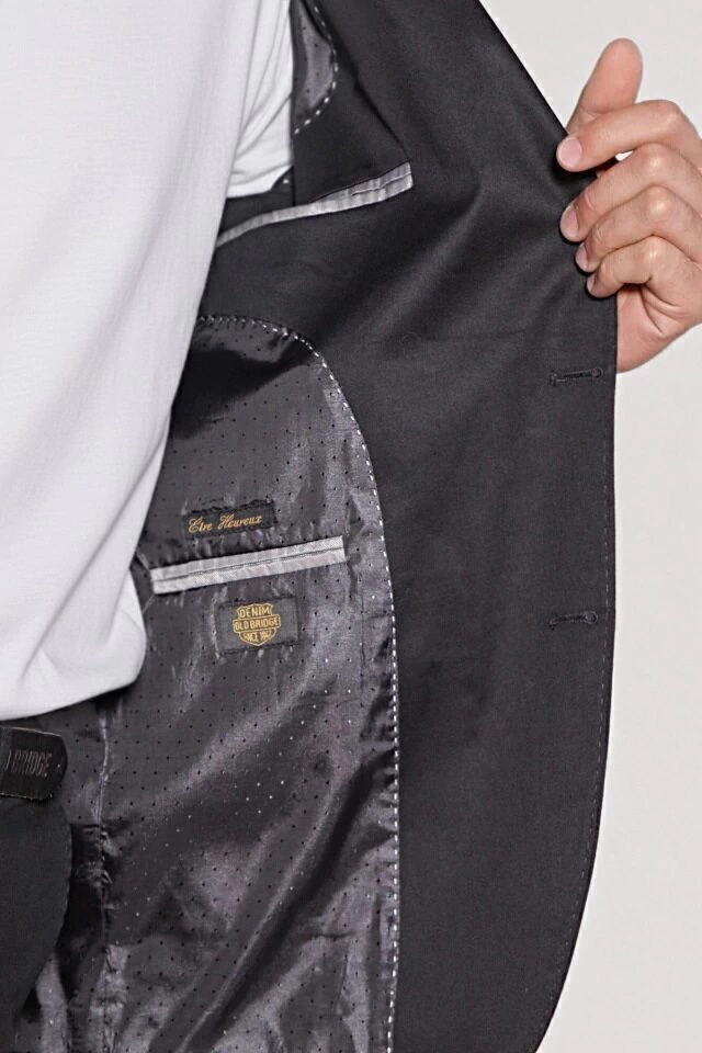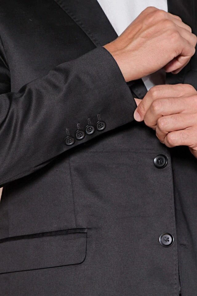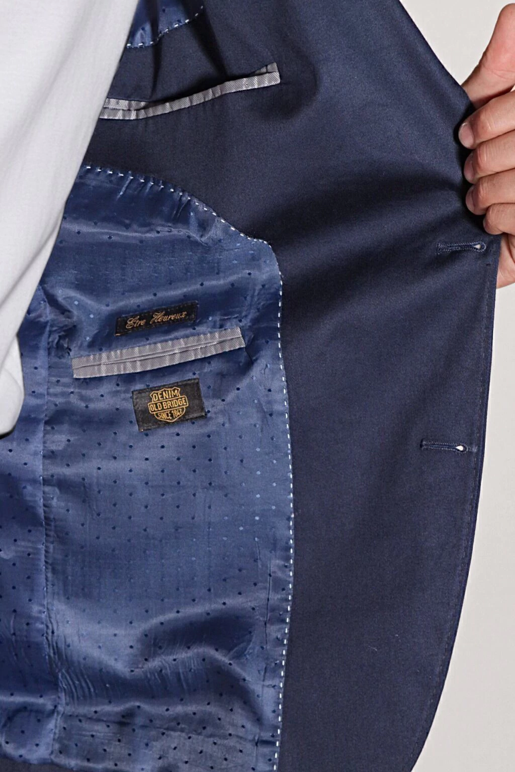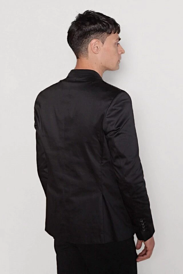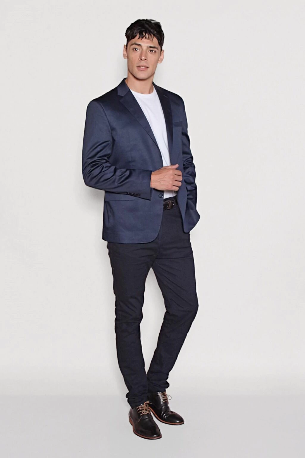 Saco sastrero clásico de cottón satén, con cuello y solapa en punta con ojal bordado, bolsillo ojal superior en lado izquierdo y dos bolsillos con tapa externos. Acceso central con dos botones y detalle de botones en mangas. Espalda con doble abertura lateral. El interior está forrado en acetato a contratono y posee tres bolsillos internos.