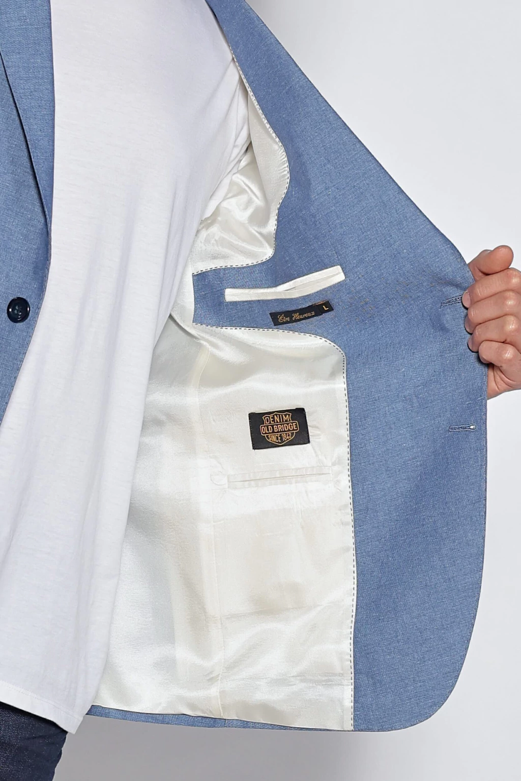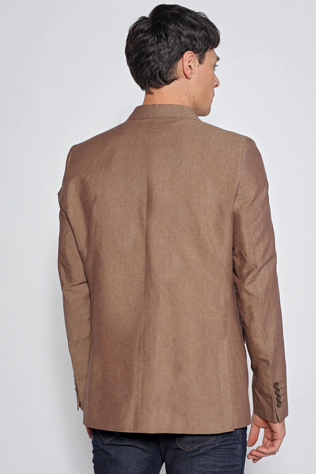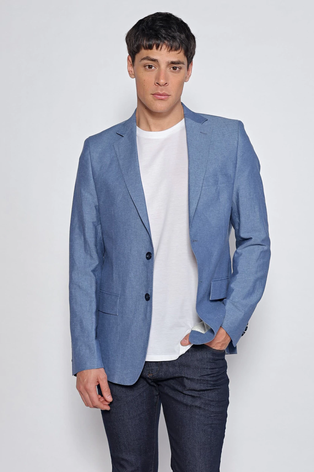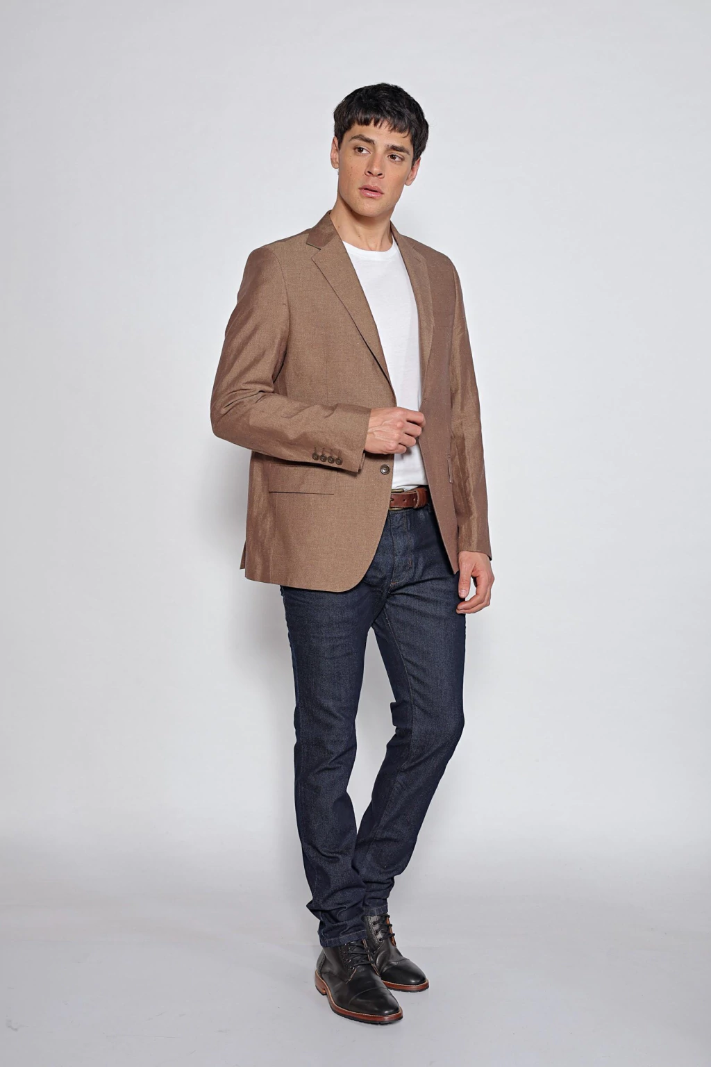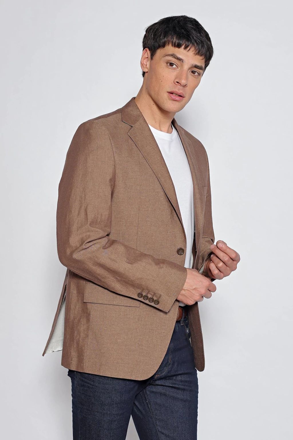 Saco sastrero clásico de lino, con cuello y solapa en punta con ojal bordado, bolsillo ribete superior en lado izquierdo y dos bolsillos con tapa externos. Acceso central con dos botones y detalle de botones en mangas. Espalda con doble abertura lateral. El interior está forrado en acetato a contratono y posee tres bolsillos internos.