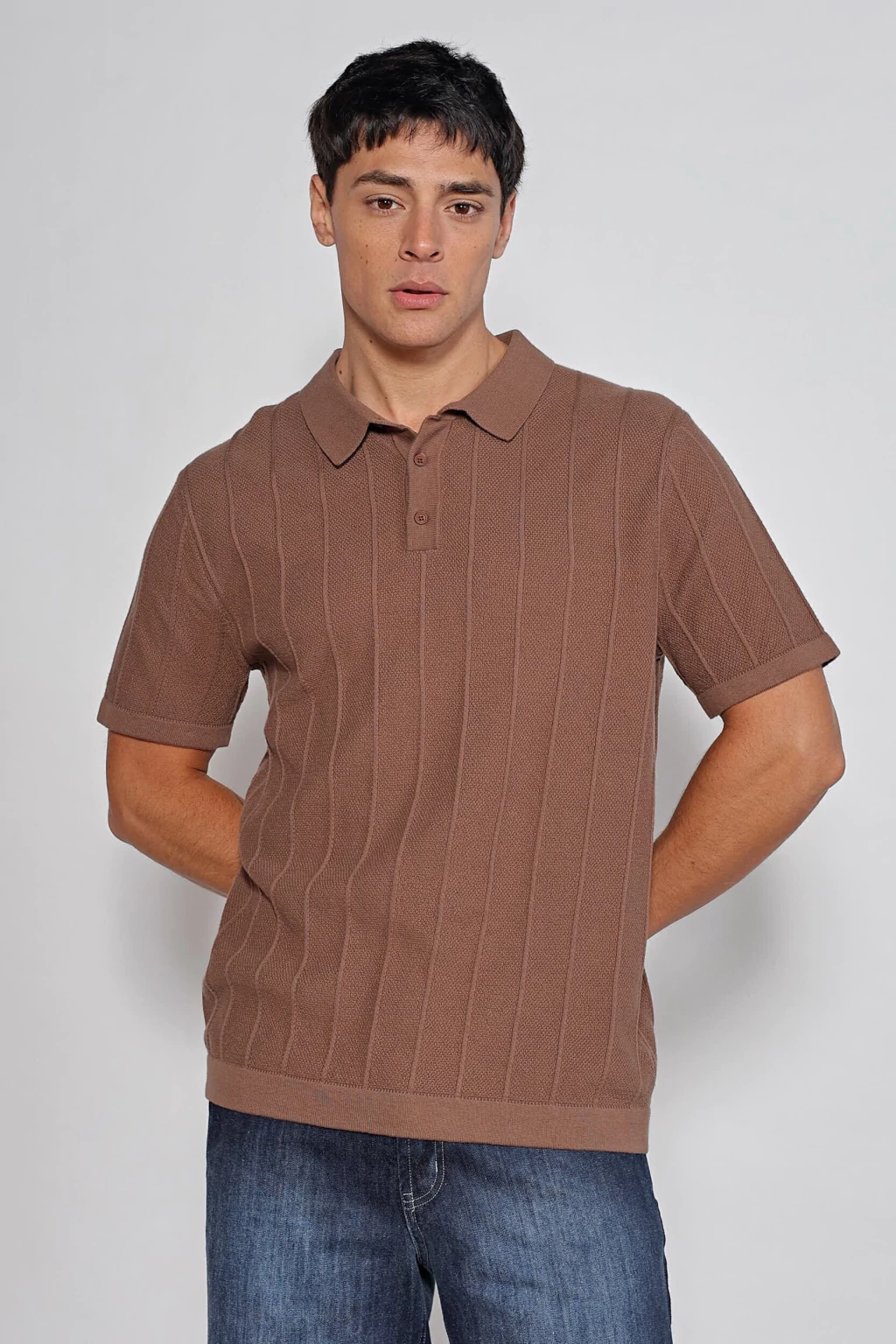 Chomba tejida lisa con un punto diferenciado vertical de algodón, tiene cartera con botones y manga corta. Los puños, cuello y cintura están tejidos al tono. Su calce es regular.