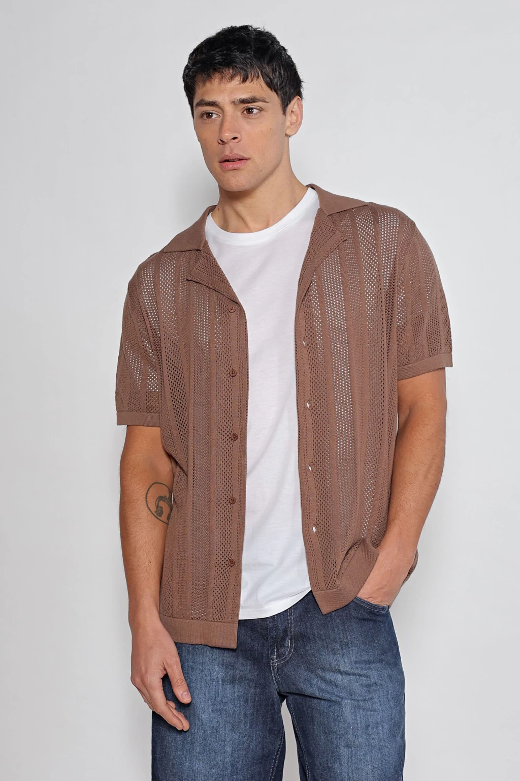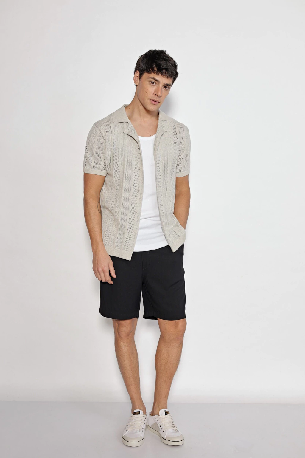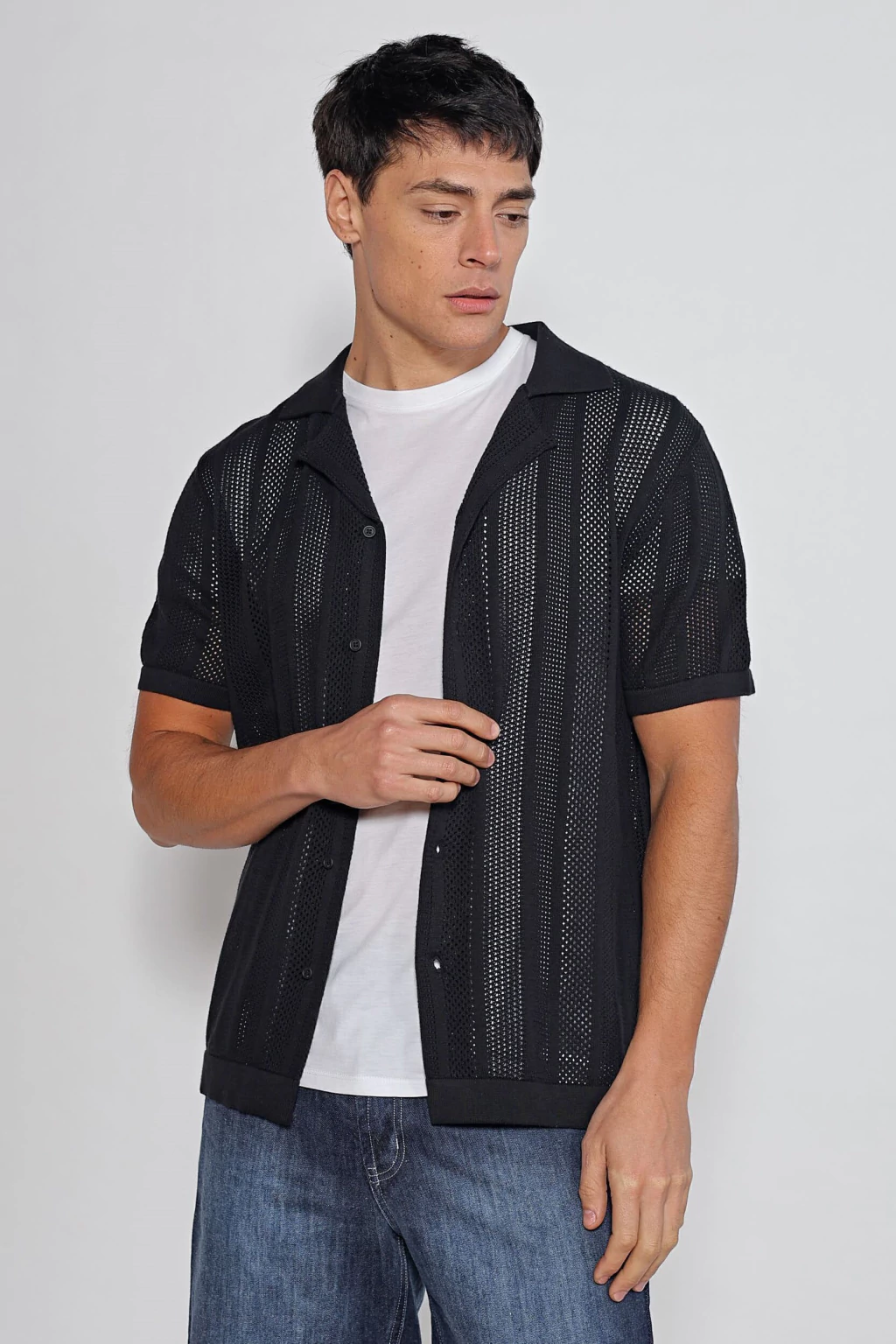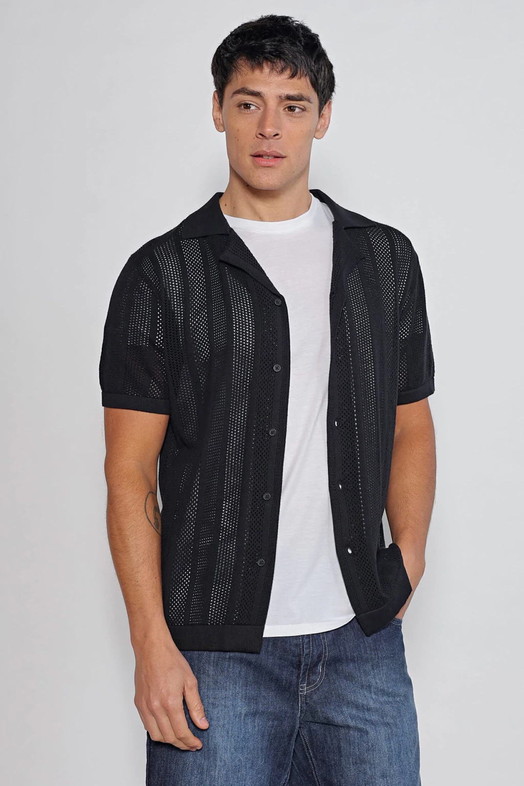 Camisa de manga corta estilo hawaiana tejido liso con punto calado de algodón. Tiene cartera con botones. Los puños, cuello y cintura están tejidos al tono. Su calce es holgado.
