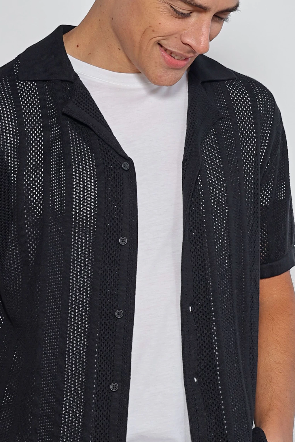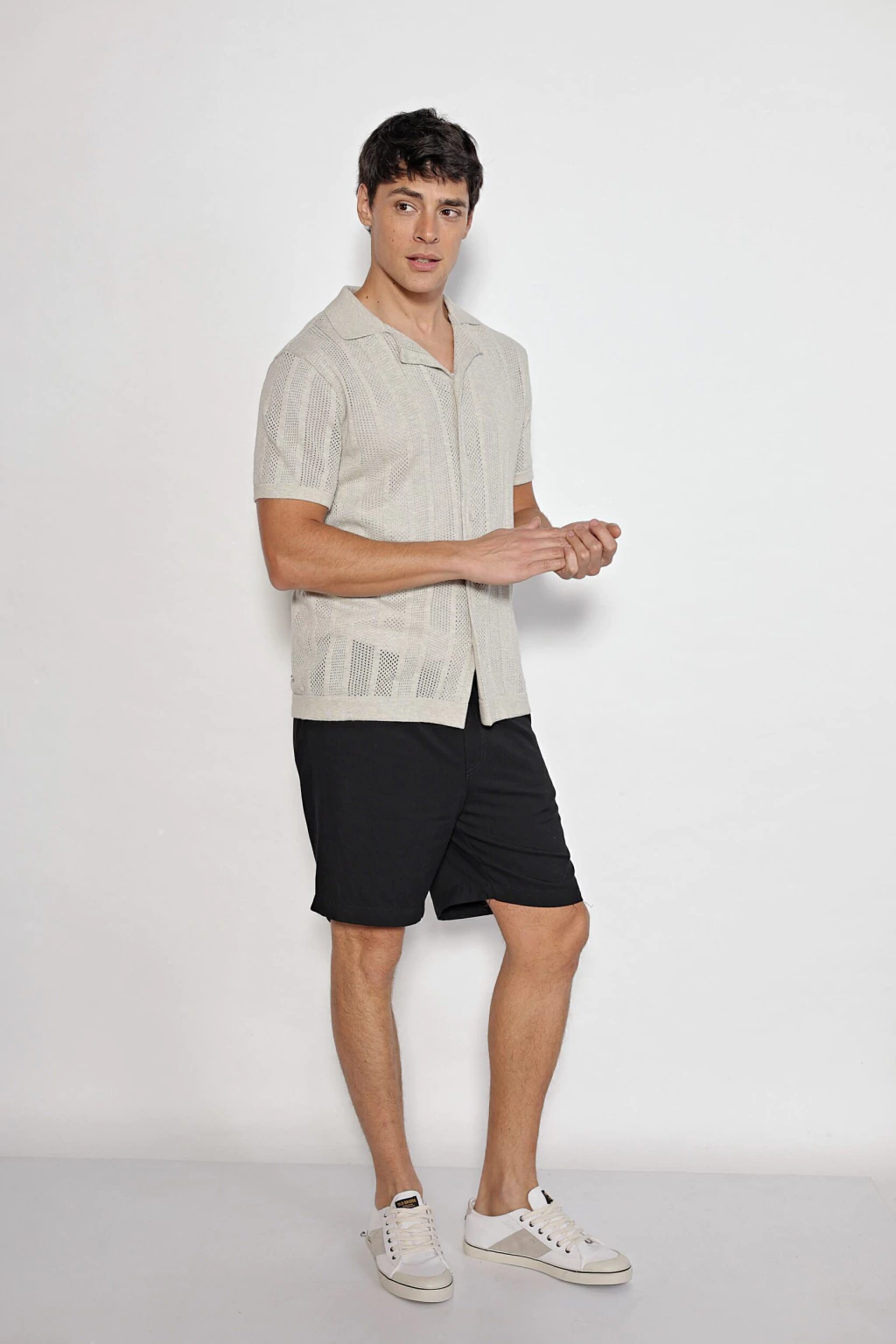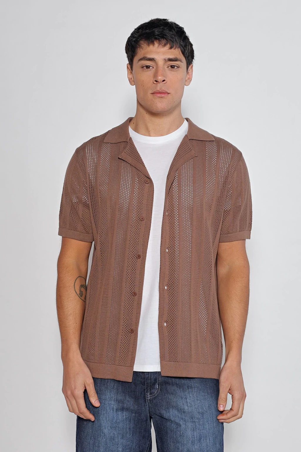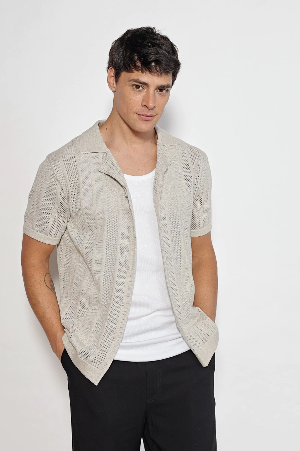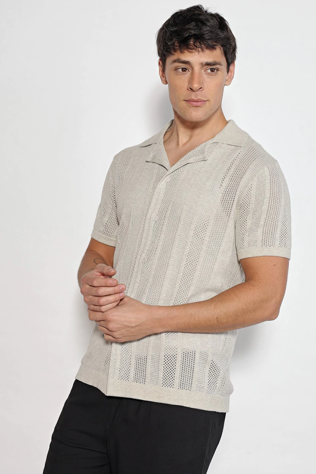 Camisa de manga corta estilo hawaiana tejido liso con punto calado de algodón. Tiene cartera con botones. Los puños, cuello y cintura están tejidos al tono. Su calce es holgado.