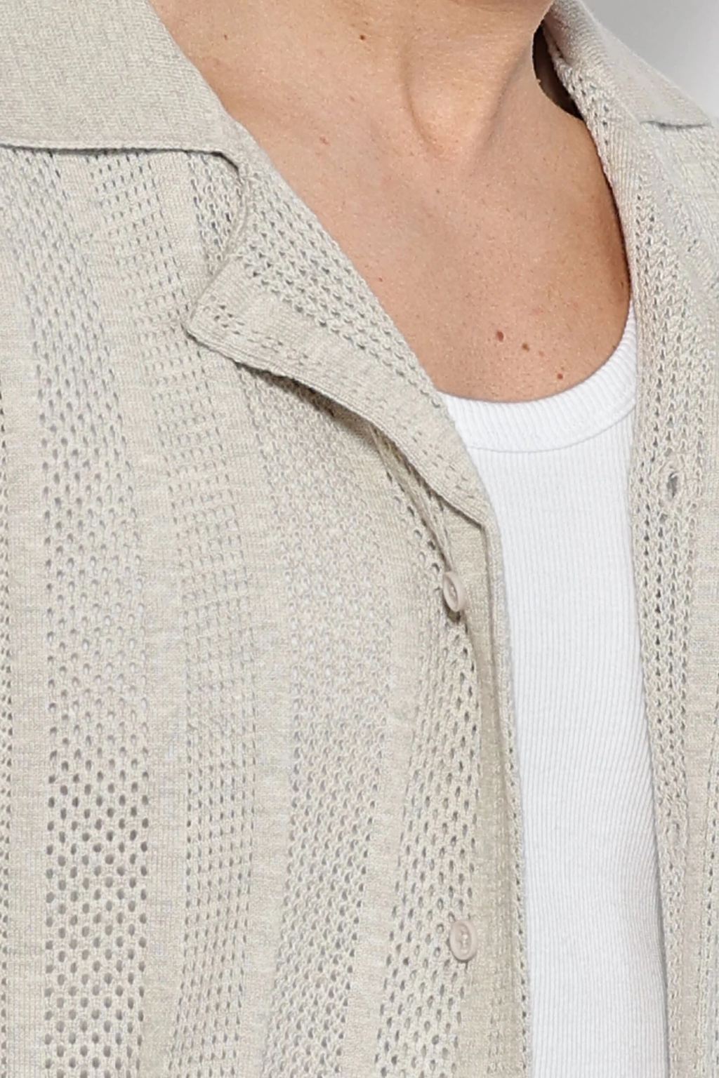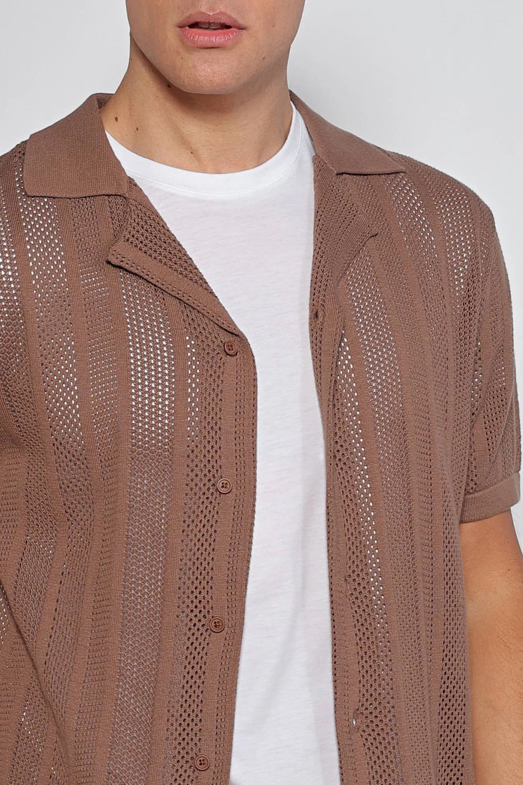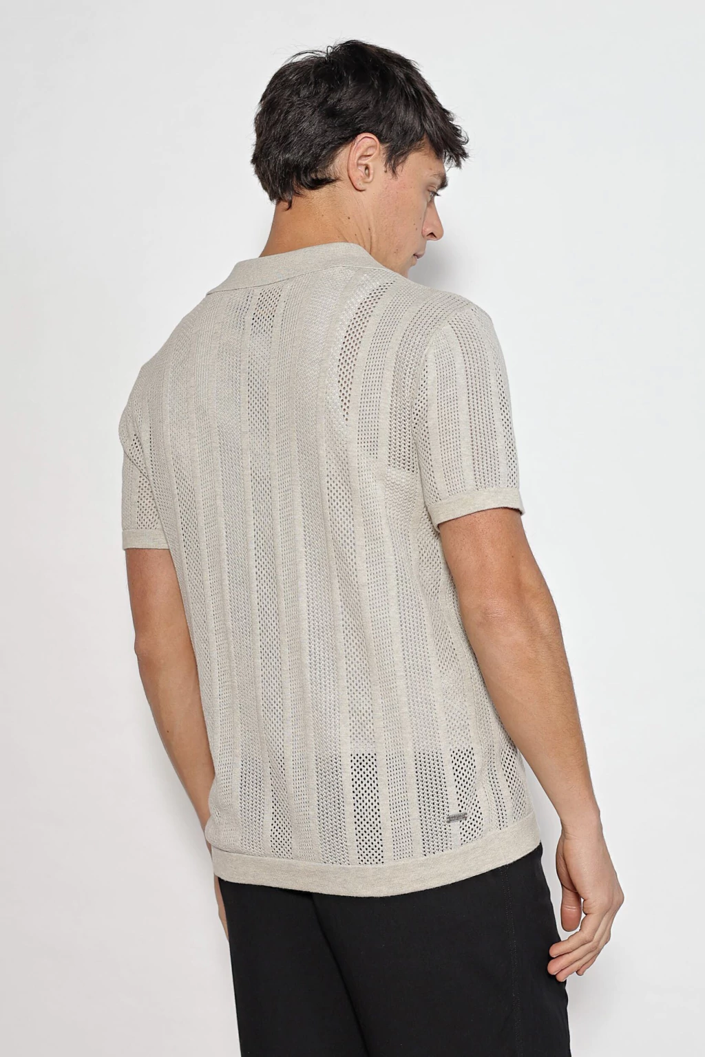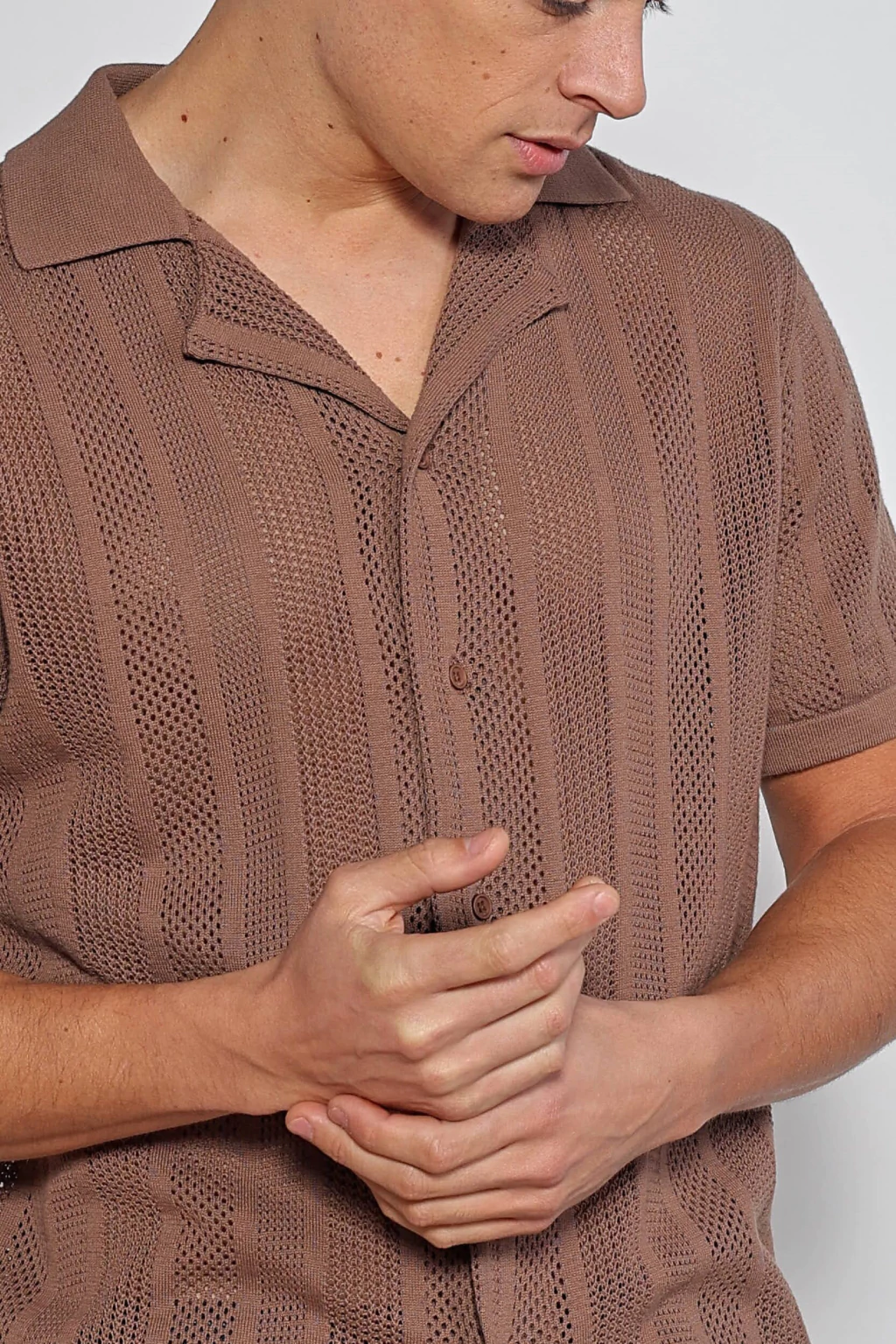 Camisa de manga corta estilo hawaiana tejido liso con punto calado de algodón. Tiene cartera con botones. Los puños, cuello y cintura están tejidos al tono. Su calce es holgado.
