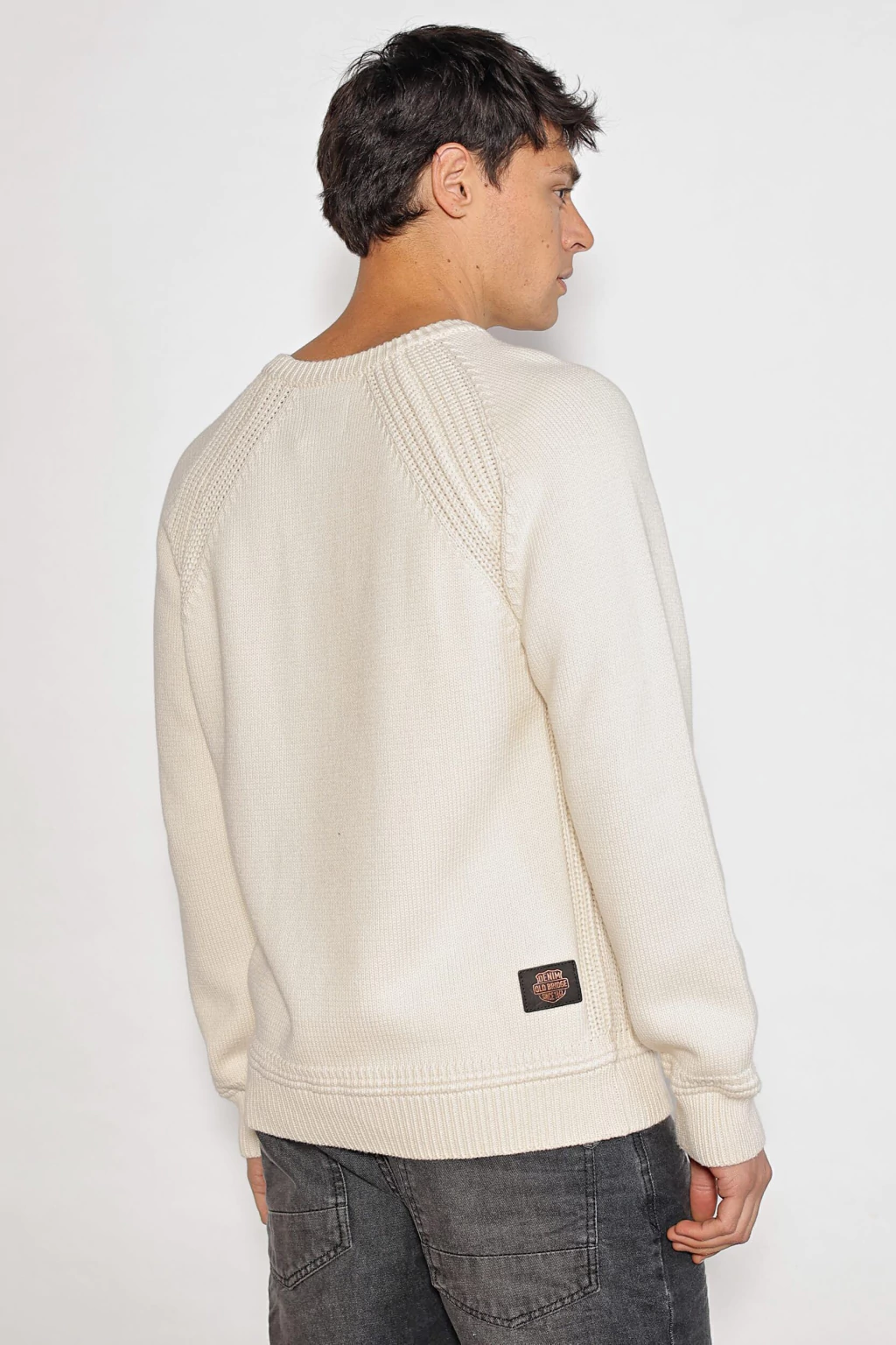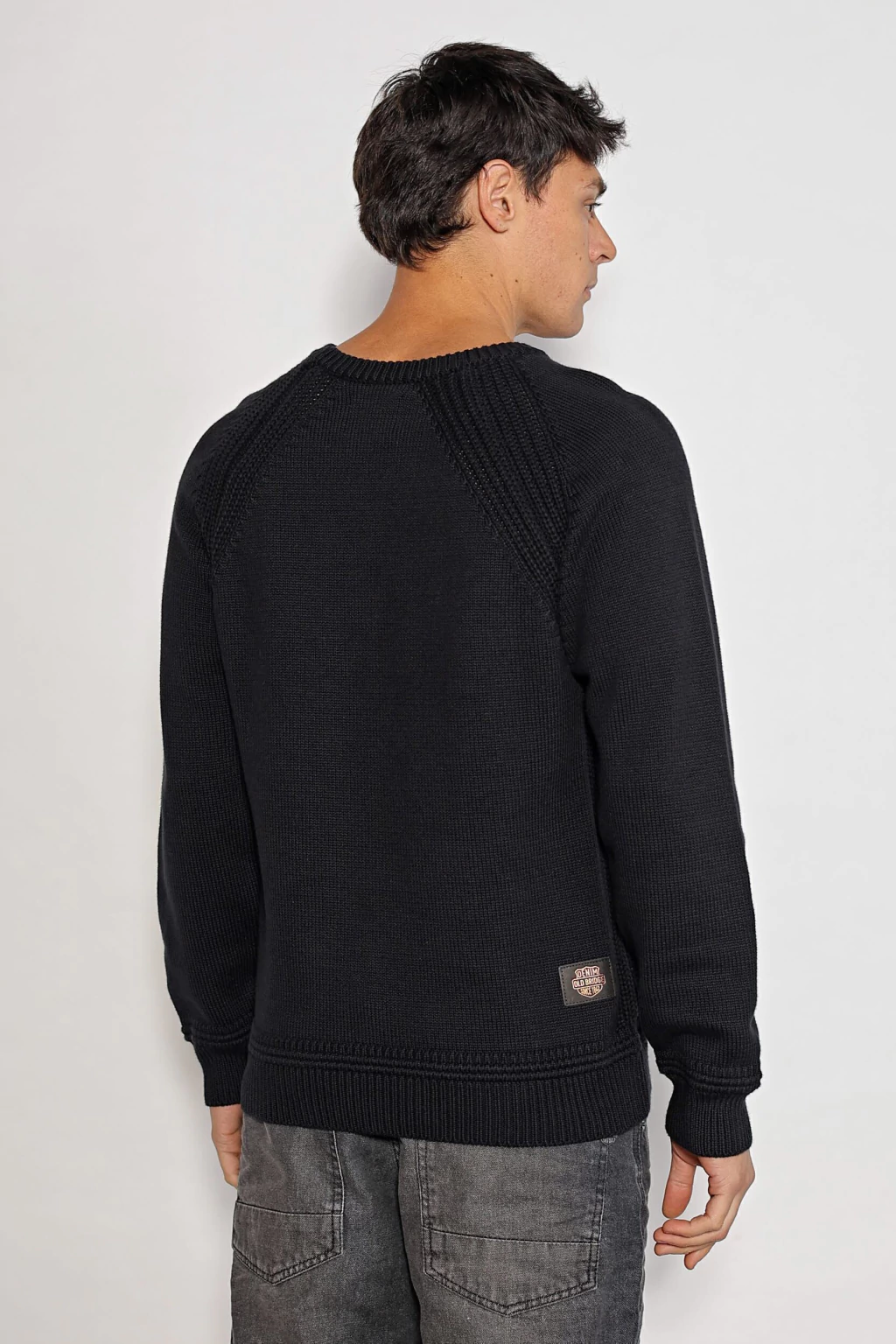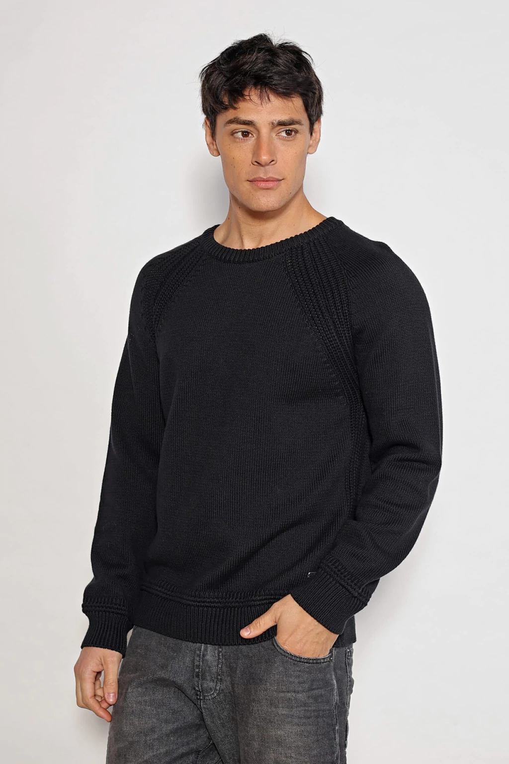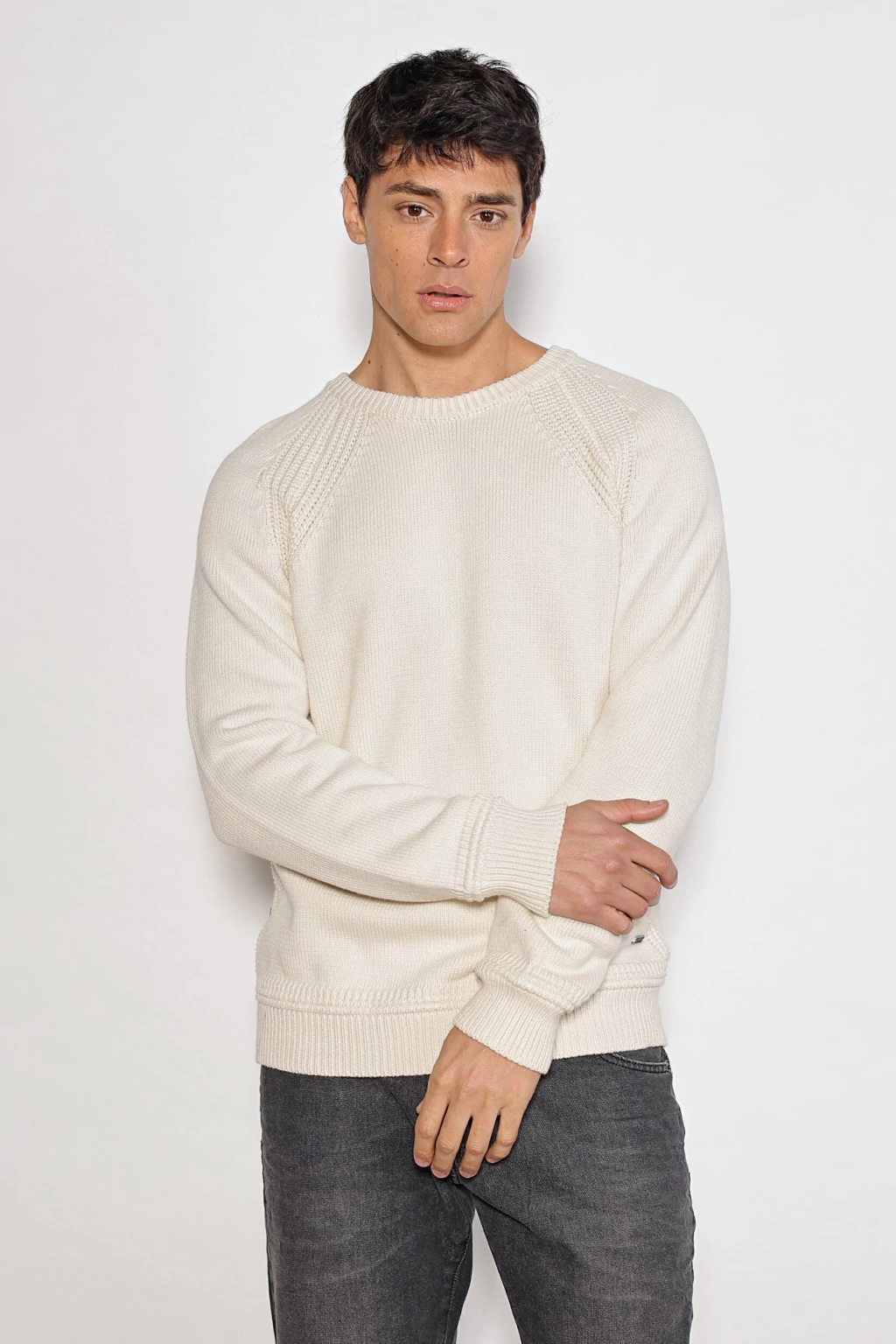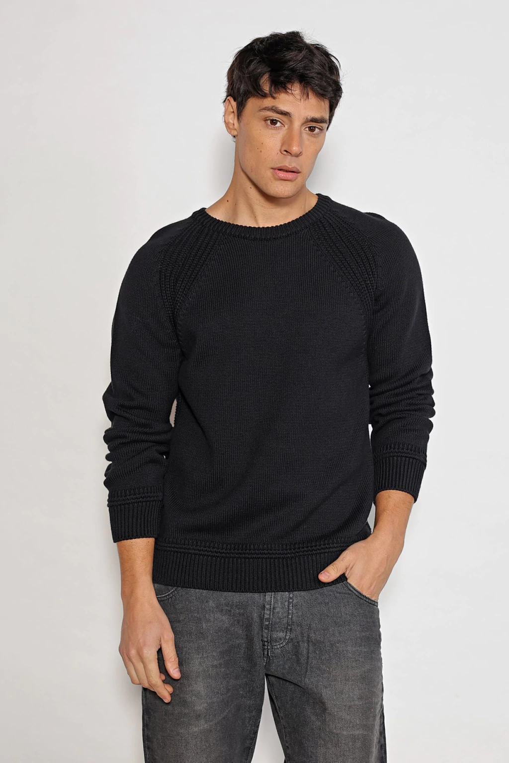 Sweater escote redondo de manga ranglan tejido en puro algodón. Tiene punto jersey en toda la prenda, y un tejido diferencial en laterales y sisas. Es una prenda de peso intermedio.